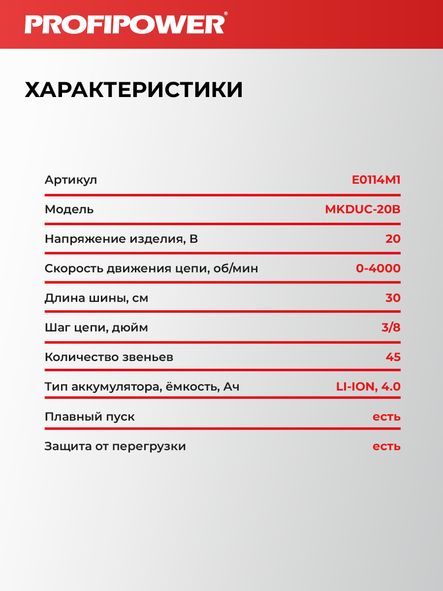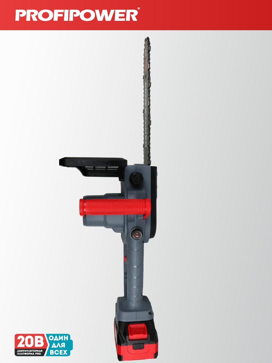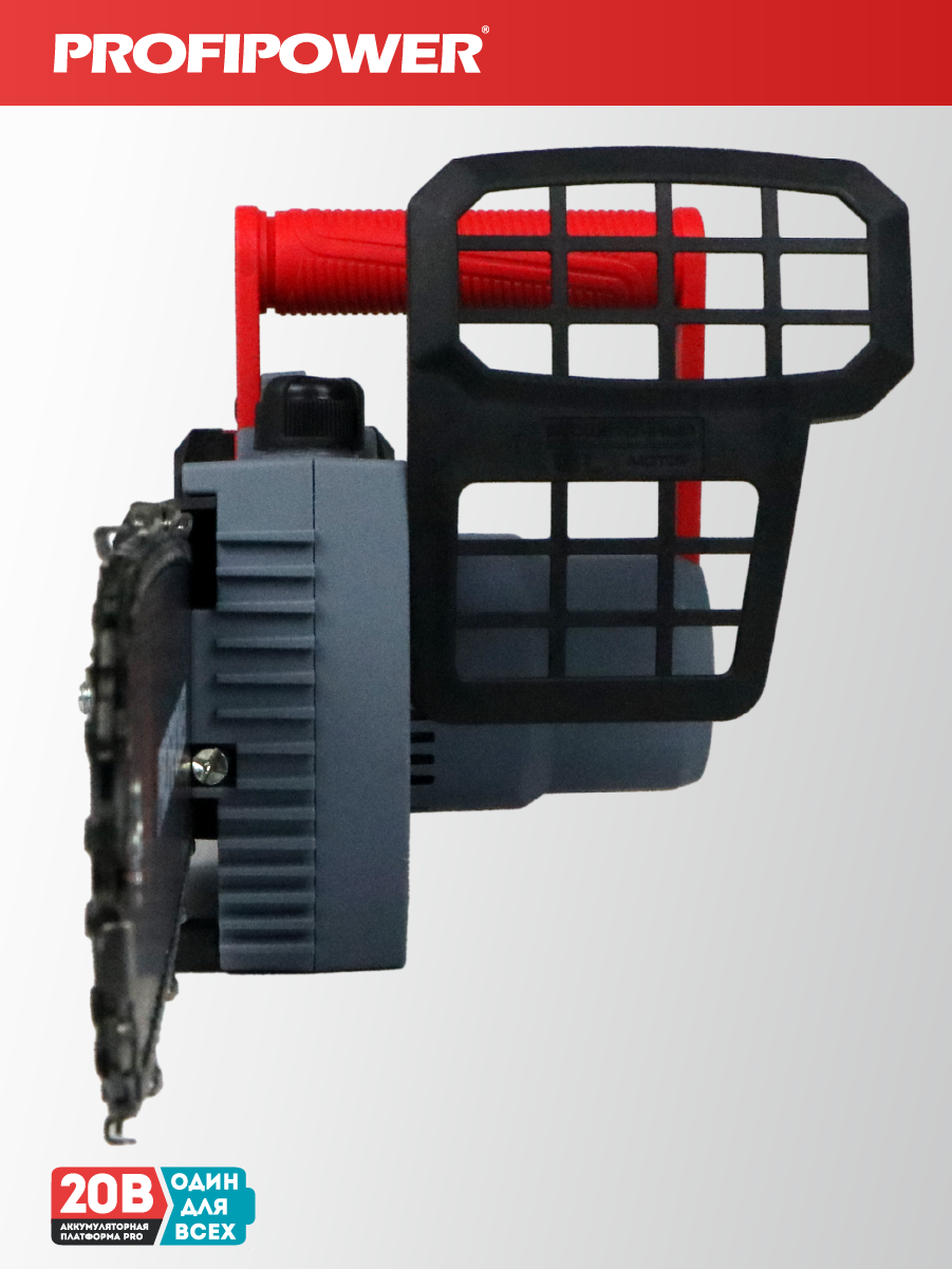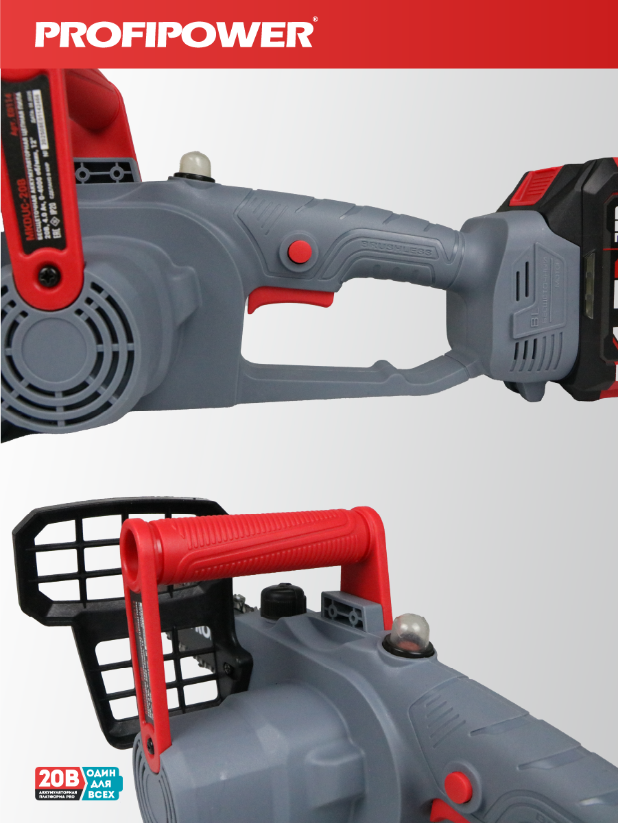 - Аккумуляторная бесщеточная цепная пила PROFIPOWER MKDUC-20В артикул E0114M1 - незаменима при работе в мастерской или в саду для распиливания различных материалов.