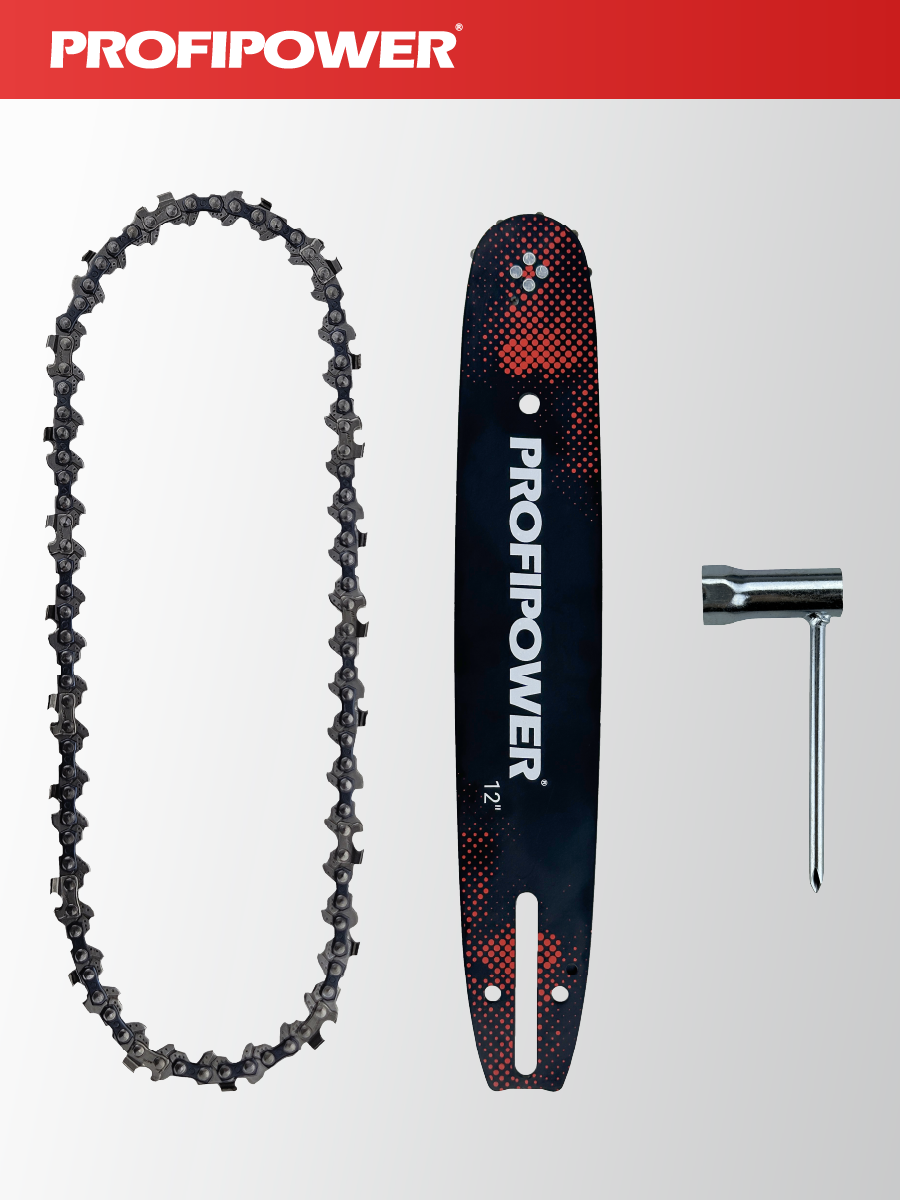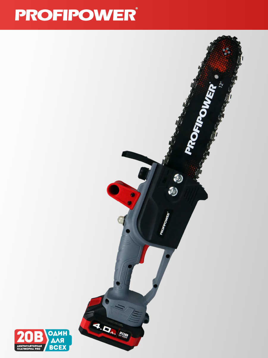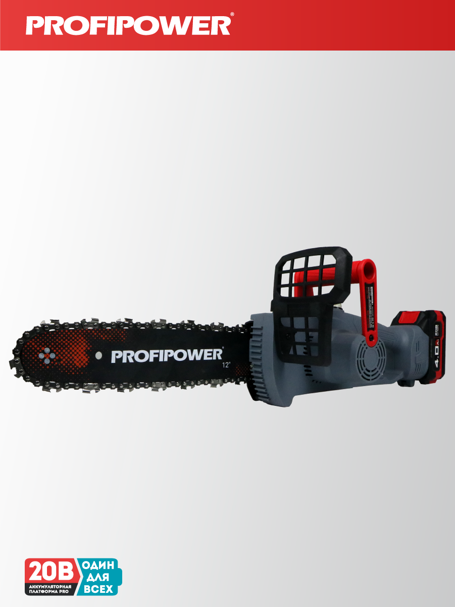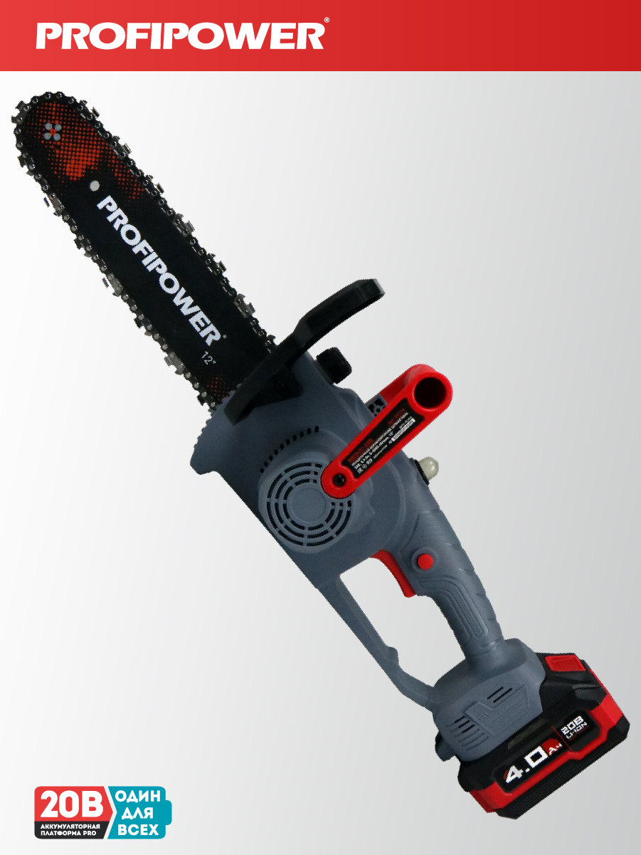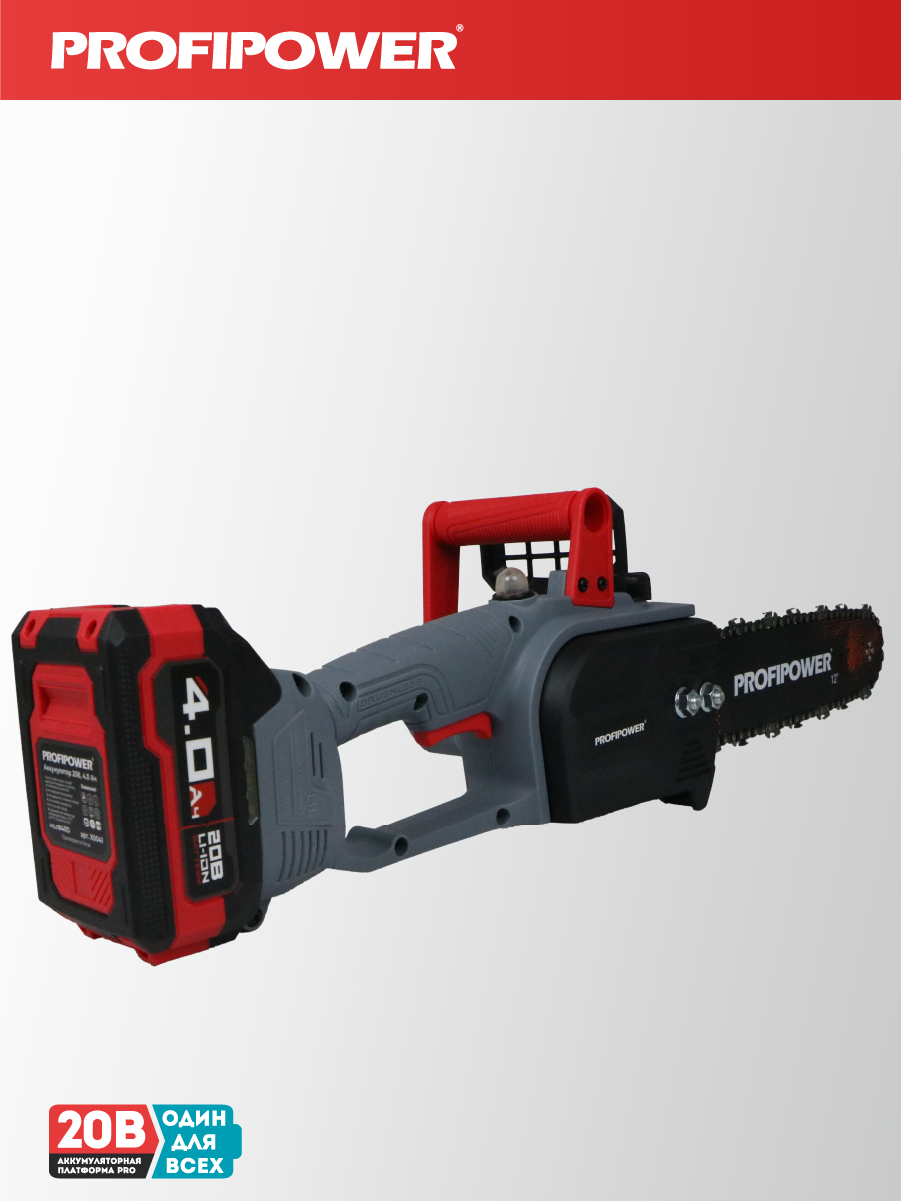 - Аккумуляторная бесщеточная цепная пила PROFIPOWER MKDUC-20В артикул E0114M1 - незаменима при работе в мастерской или в саду для распиливания различных материалов.