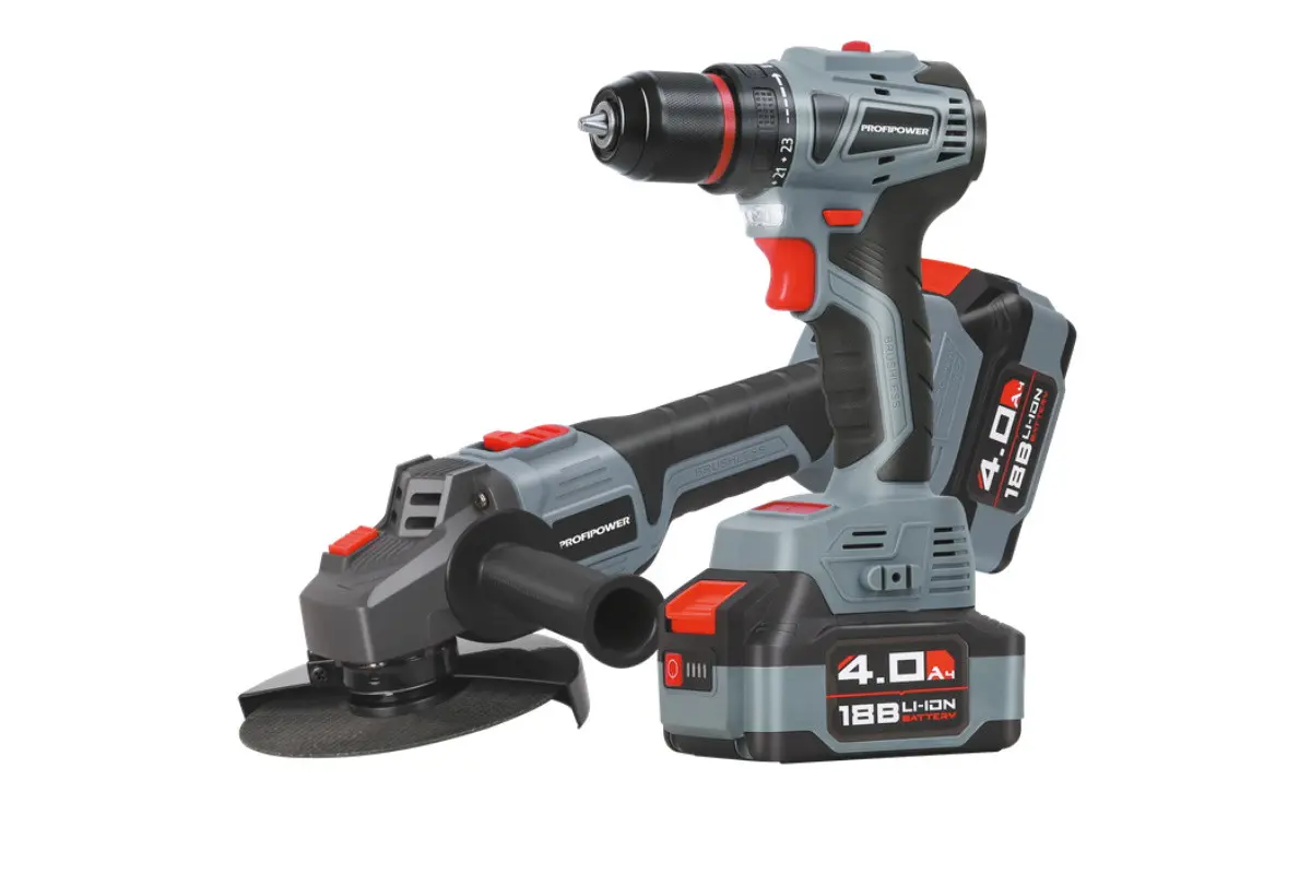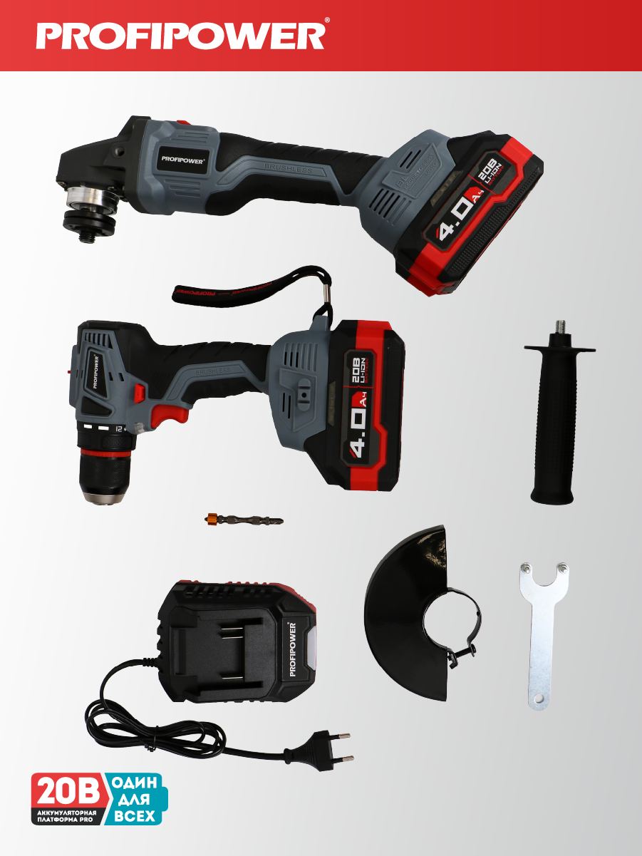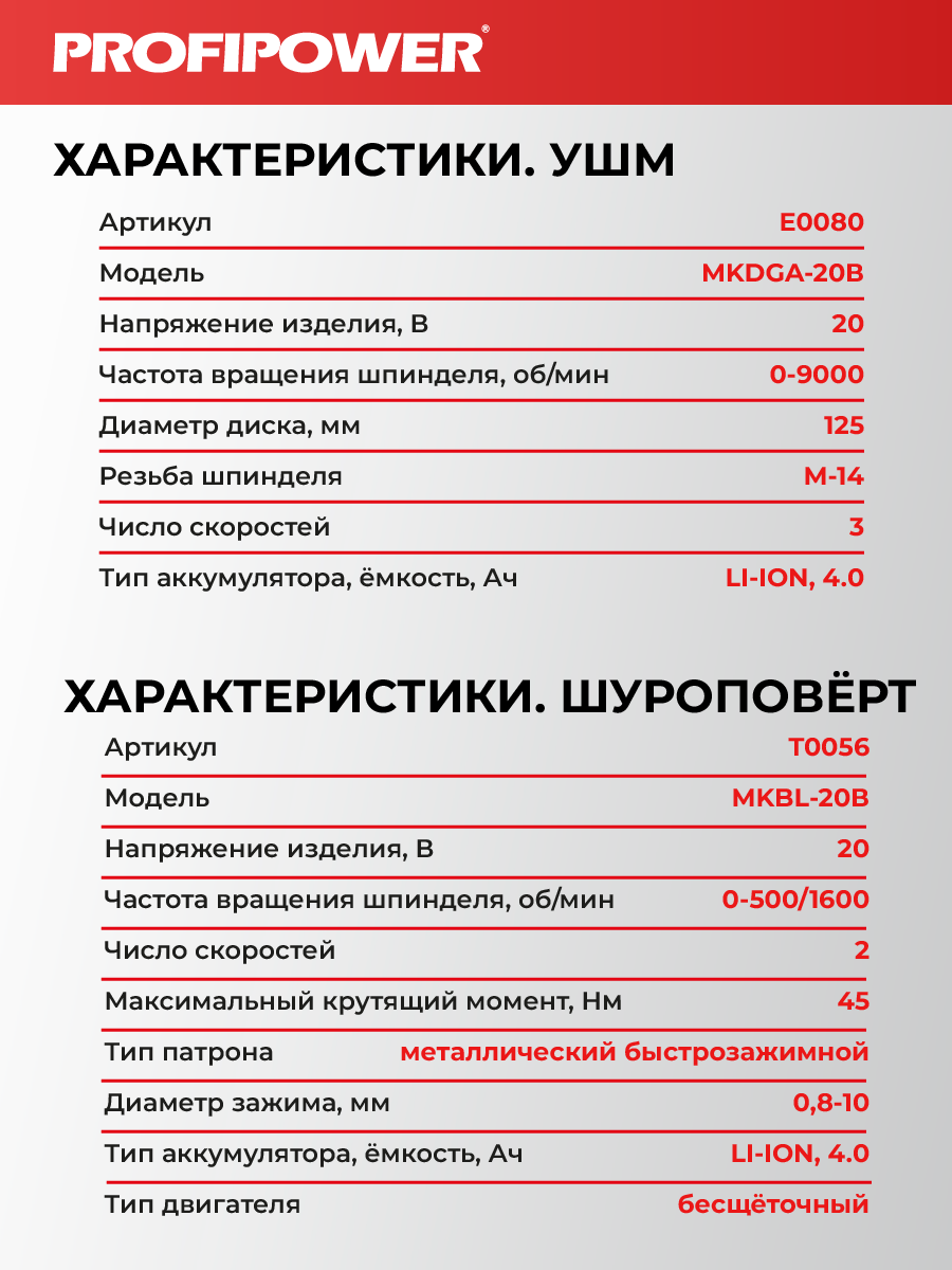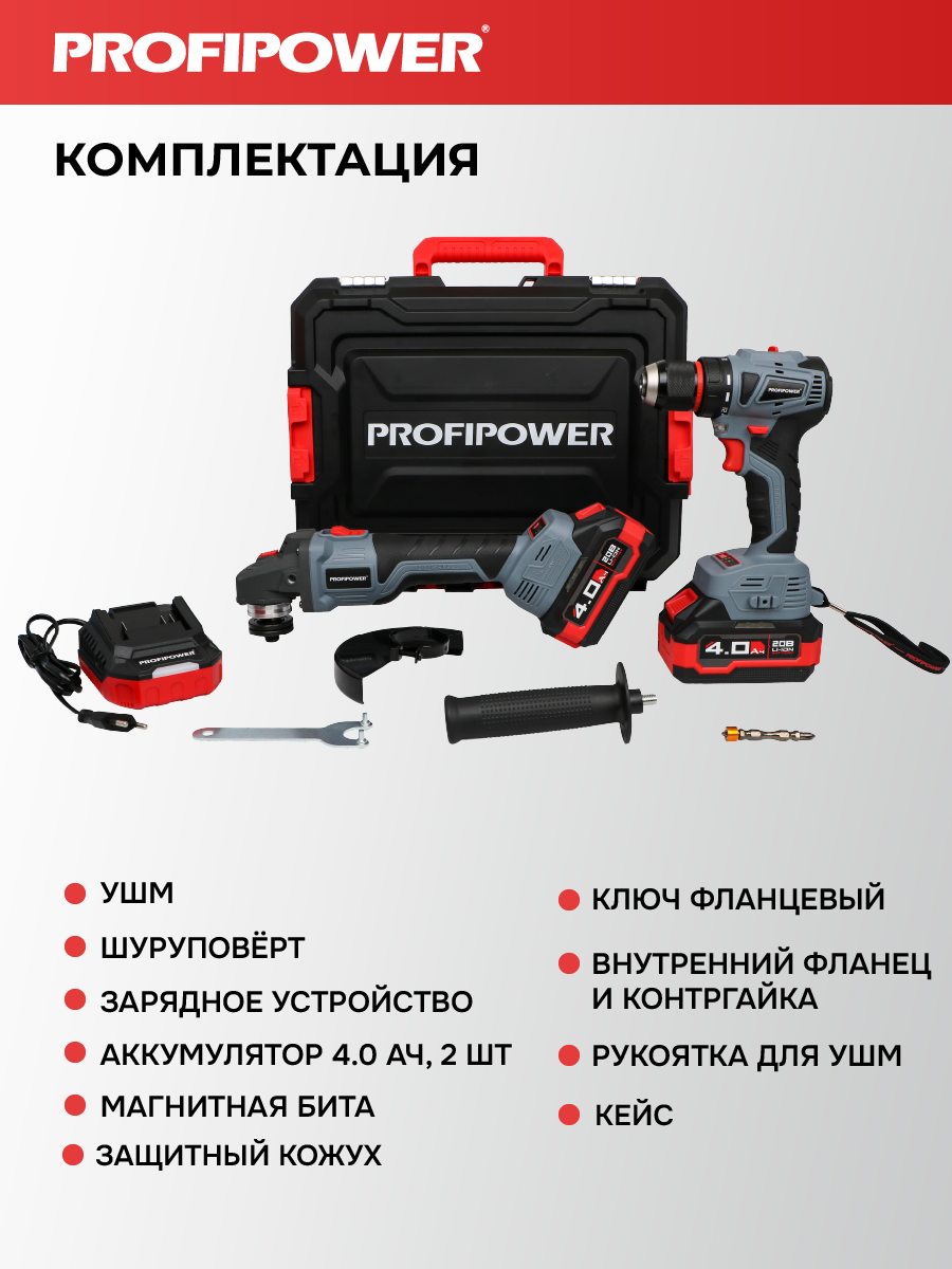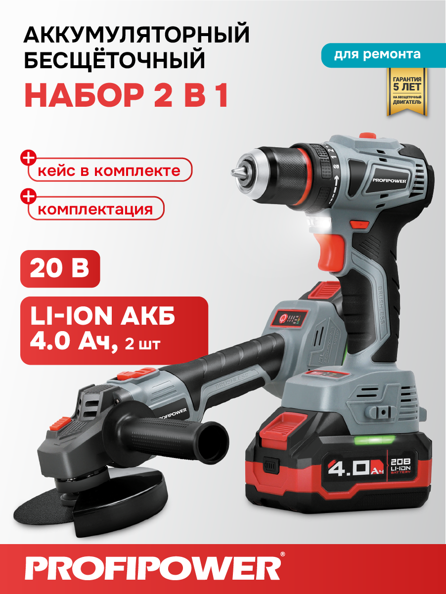 Аккумуляторный бесщёточный набор Profipower E0220 включает в себя угловую шлифовальную машину (УШМ) MKDGA-18V и шуруповёрт MKBL-18B. Характеристики УШМ MKDGA-18V: - Напряжение аккумулятора: 18 В. - Ёмкость аккумулятора: 4 А·ч. - Тип аккумулятора: Li-ion. - Диаметр диска: 125 мм. - Резьба гайки шпинделя: М14. - Максимальная толщина диска: 6,4 мм. - Посадочный диаметр: 22,2 мм. - Частота вращения шпинделя: 9000 об/мин. Характеристики шуруповёрта MKBL-18B: - Тип двигателя: бесщёточный. - Напряжение аккумулятора: 18 В. - Ёмкость аккумулятора: 2 А·ч. - Тип аккумулятора: Li-ion. - Светодиодная подсветка. - Максимальный крутящий момент: 40 Нм. - Электронная регулировка частоты вращения. - Защита от перегрузок. - Тип патрона: быстрозажимной. - Диаметр зажима: 0,8–10 мм. - Максимальный диаметр сверления в древесине: 20 мм. - Максимальный диаметр сверления в металле: 10 мм. В комплект входят два аккумулятора, зарядное устройство, магнитная бита, защитный кожух, ключ, внутренний фланец, контргайка, рукоятка, кейс и инструкция с гарантийным талоном.