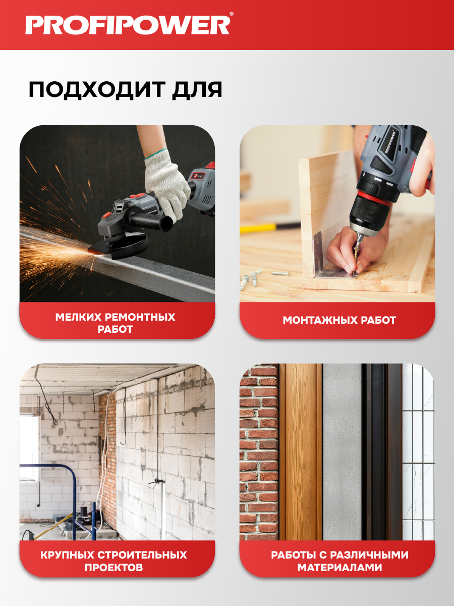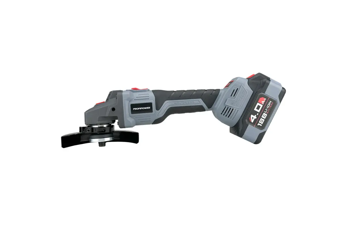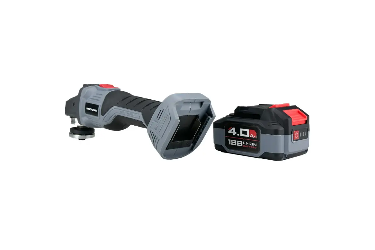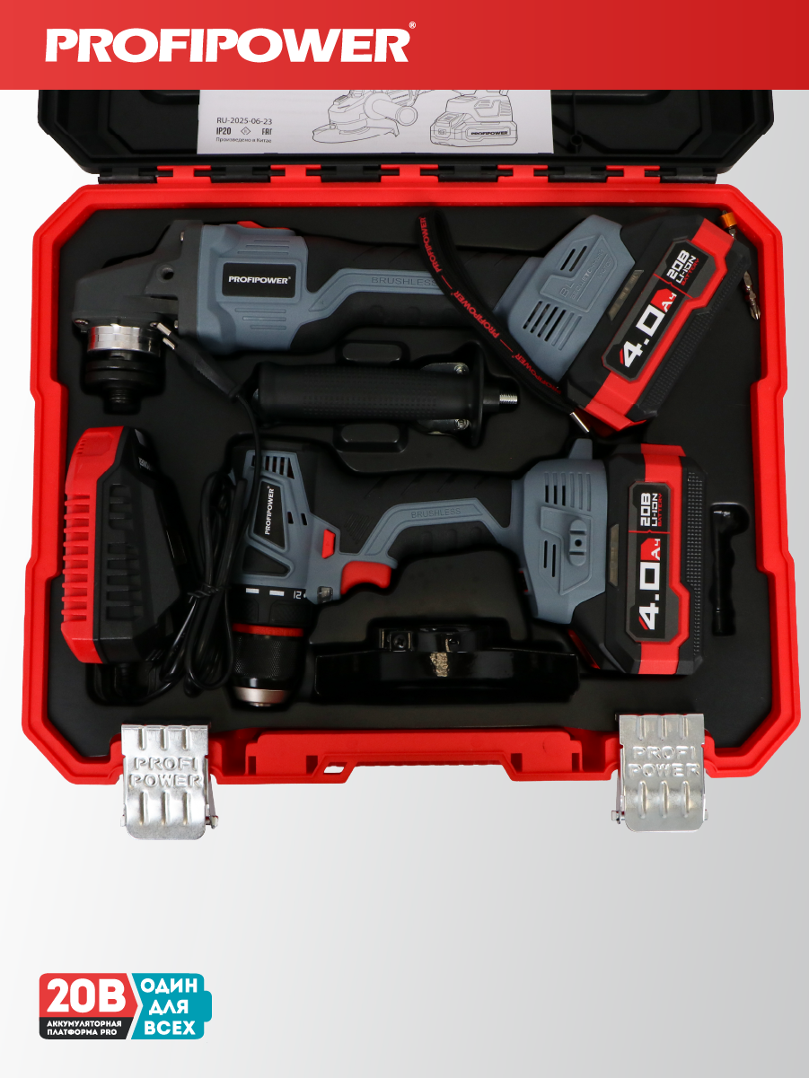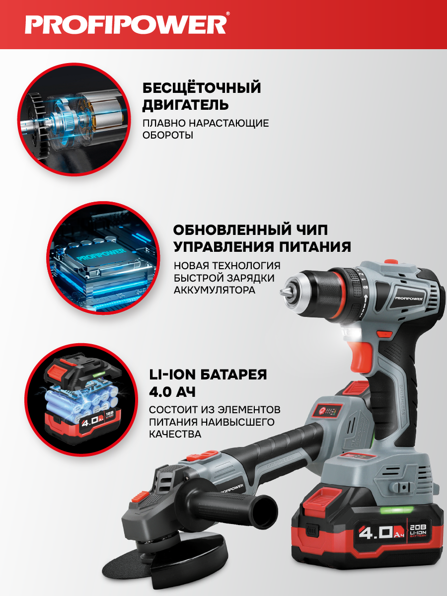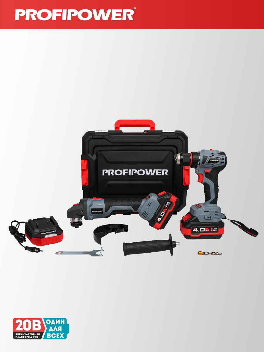 Аккумуляторный бесщёточный набор Profipower E0220 включает в себя угловую шлифовальную машину (УШМ) MKDGA-18V и шуруповёрт MKBL-18B. Характеристики УШМ MKDGA-18V: - Напряжение аккумулятора: 18 В. - Ёмкость аккумулятора: 4 А·ч. - Тип аккумулятора: Li-ion. - Диаметр диска: 125 мм. - Резьба гайки шпинделя: М14. - Максимальная толщина диска: 6,4 мм. - Посадочный диаметр: 22,2 мм. - Частота вращения шпинделя: 9000 об/мин. Характеристики шуруповёрта MKBL-18B: - Тип двигателя: бесщёточный. - Напряжение аккумулятора: 18 В. - Ёмкость аккумулятора: 2 А·ч. - Тип аккумулятора: Li-ion. - Светодиодная подсветка. - Максимальный крутящий момент: 40 Нм. - Электронная регулировка частоты вращения. - Защита от перегрузок. - Тип патрона: быстрозажимной. - Диаметр зажима: 0,8–10 мм. - Максимальный диаметр сверления в древесине: 20 мм. - Максимальный диаметр сверления в металле: 10 мм. В комплект входят два аккумулятора, зарядное устройство, магнитная бита, защитный кожух, ключ, внутренний фланец, контргайка, рукоятка, кейс и инструкция с гарантийным талоном.