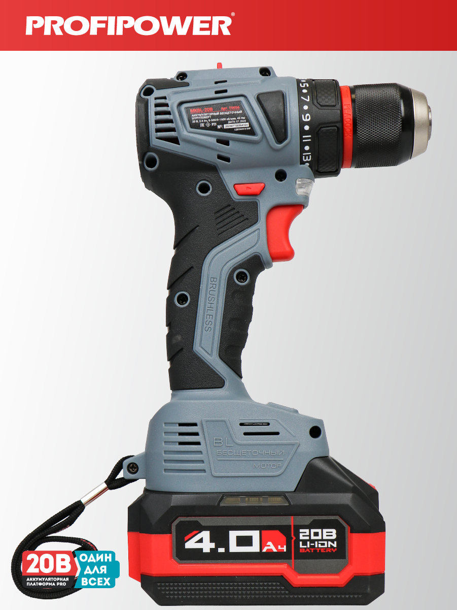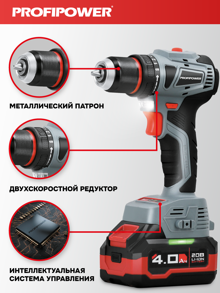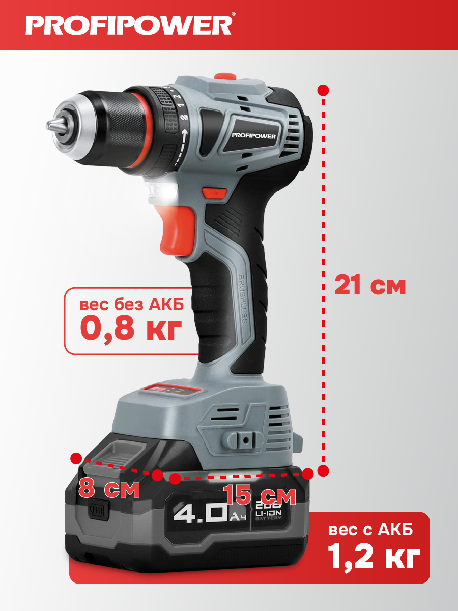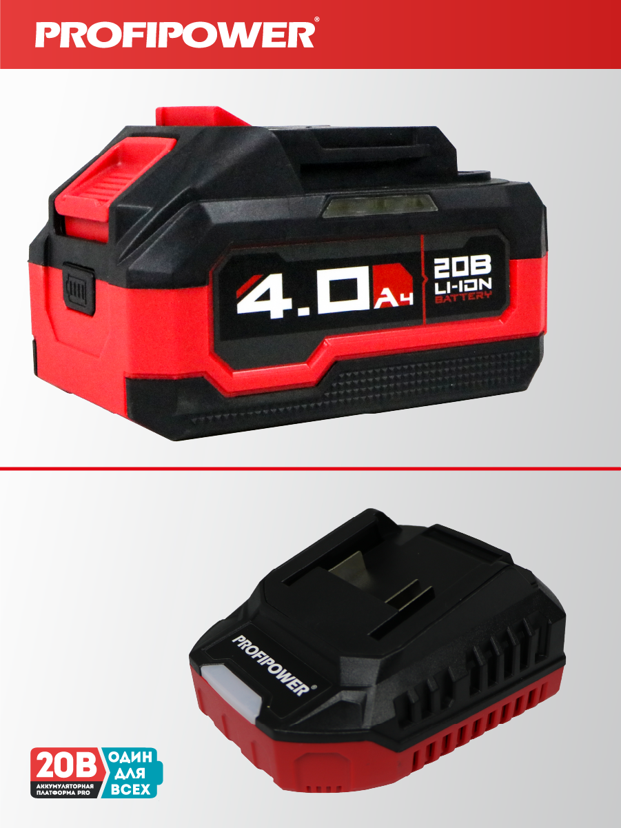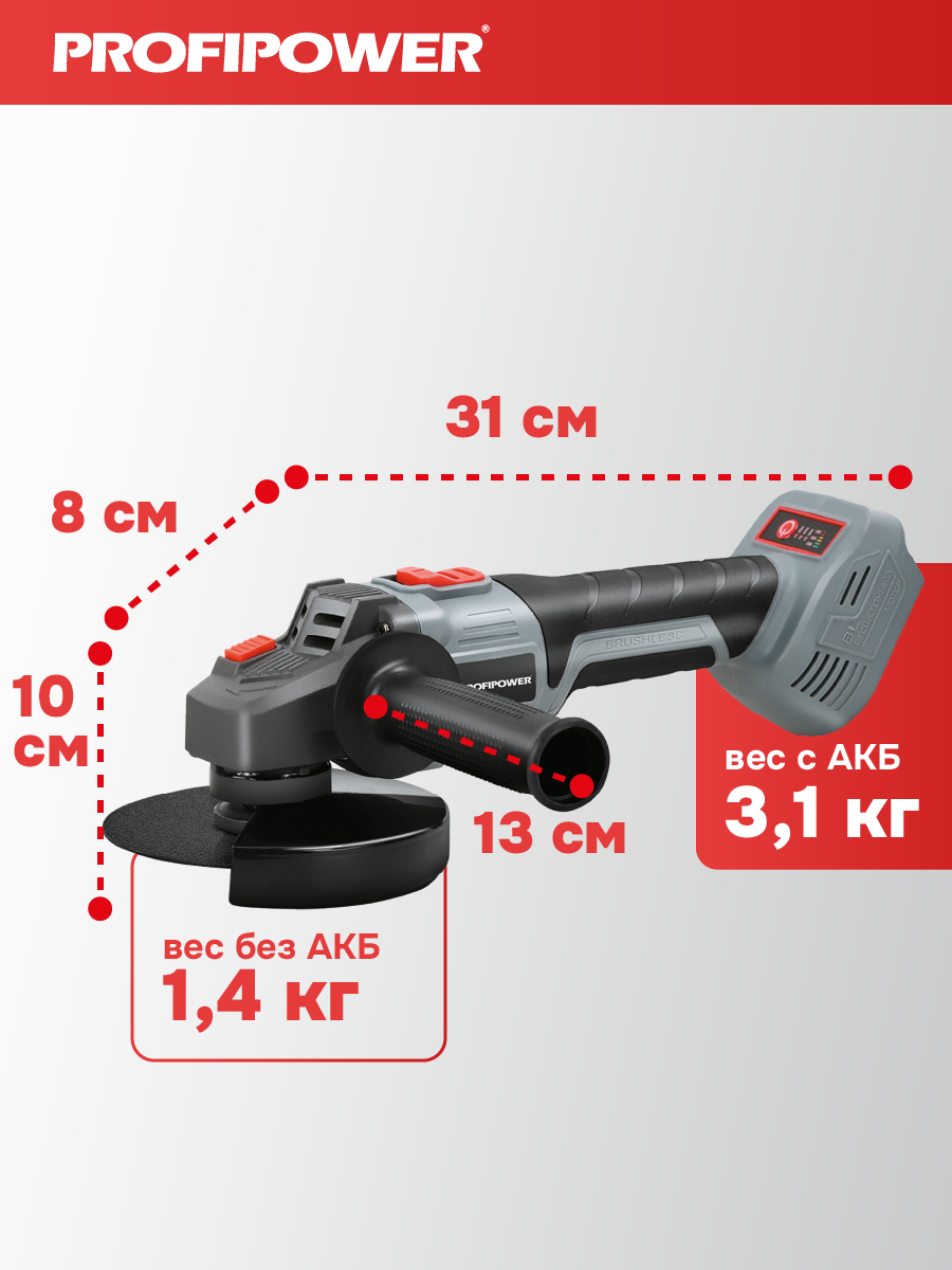 Аккумуляторный бесщёточный набор Profipower E0220 включает в себя угловую шлифовальную машину (УШМ) MKDGA-18V и шуруповёрт MKBL-18B. Характеристики УШМ MKDGA-18V: - Напряжение аккумулятора: 18 В. - Ёмкость аккумулятора: 4 А·ч. - Тип аккумулятора: Li-ion. - Диаметр диска: 125 мм. - Резьба гайки шпинделя: М14. - Максимальная толщина диска: 6,4 мм. - Посадочный диаметр: 22,2 мм. - Частота вращения шпинделя: 9000 об/мин. Характеристики шуруповёрта MKBL-18B: - Тип двигателя: бесщёточный. - Напряжение аккумулятора: 18 В. - Ёмкость аккумулятора: 2 А·ч. - Тип аккумулятора: Li-ion. - Светодиодная подсветка. - Максимальный крутящий момент: 40 Нм. - Электронная регулировка частоты вращения. - Защита от перегрузок. - Тип патрона: быстрозажимной. - Диаметр зажима: 0,8–10 мм. - Максимальный диаметр сверления в древесине: 20 мм. - Максимальный диаметр сверления в металле: 10 мм. В комплект входят два аккумулятора, зарядное устройство, магнитная бита, защитный кожух, ключ, внутренний фланец, контргайка, рукоятка, кейс и инструкция с гарантийным талоном.
