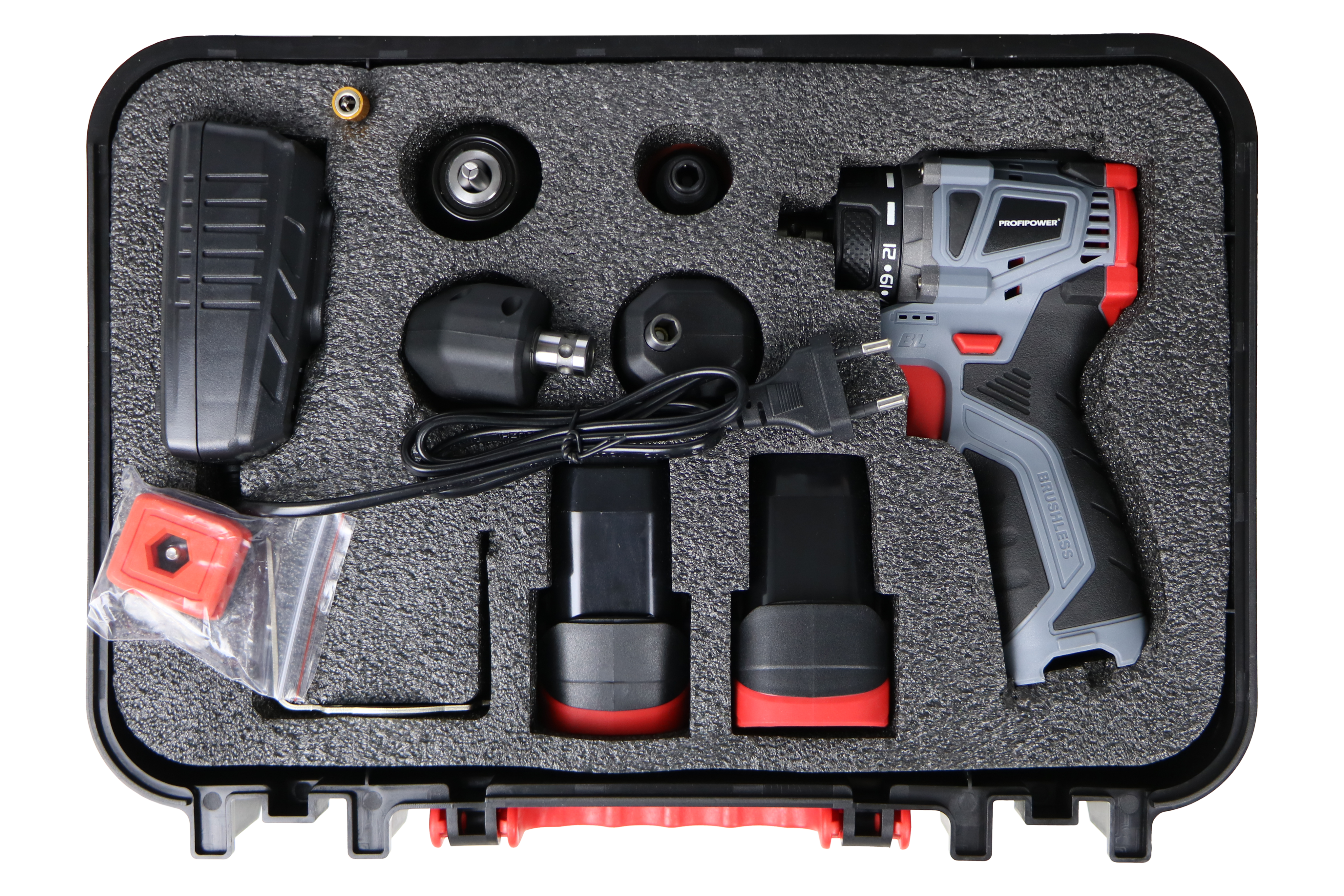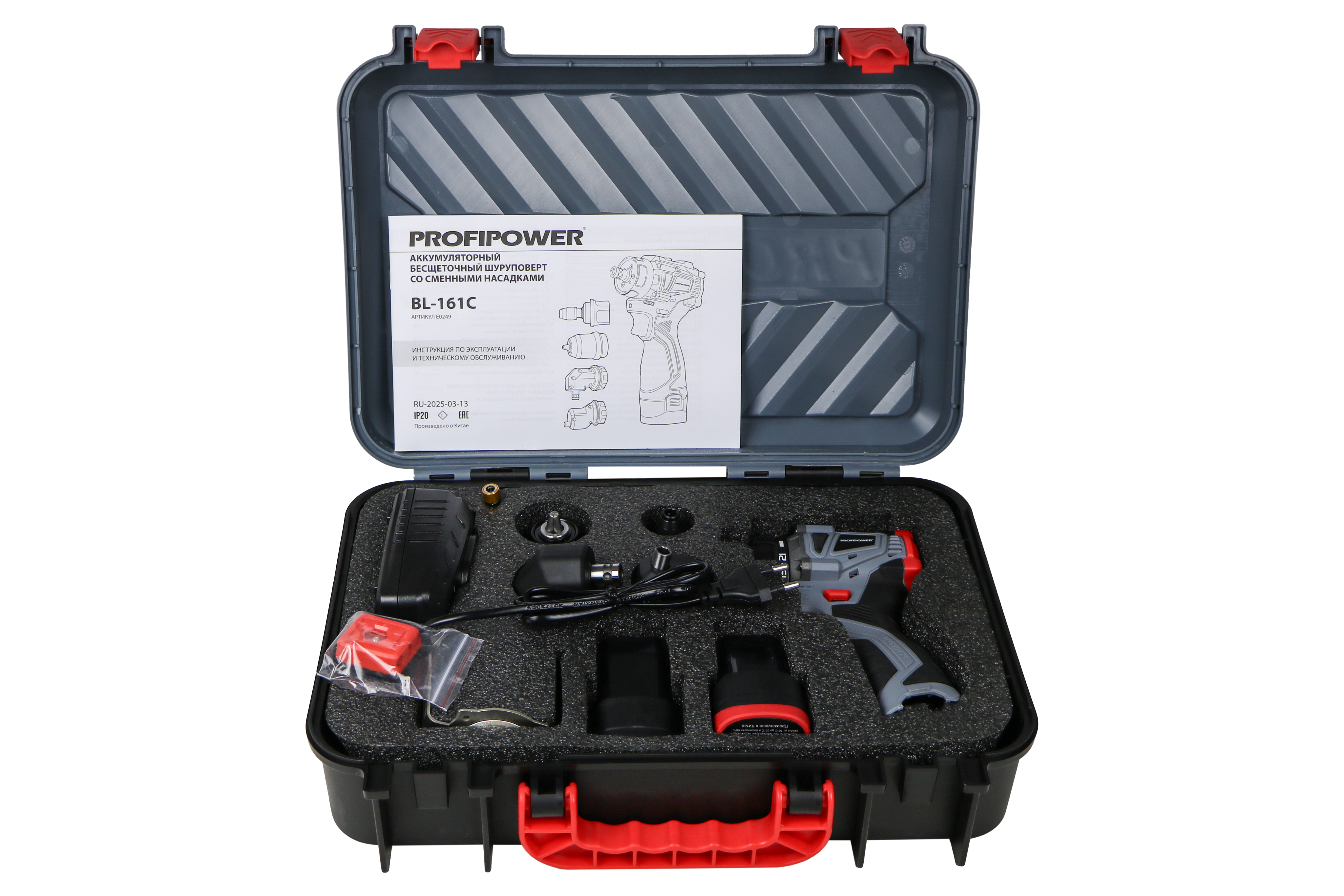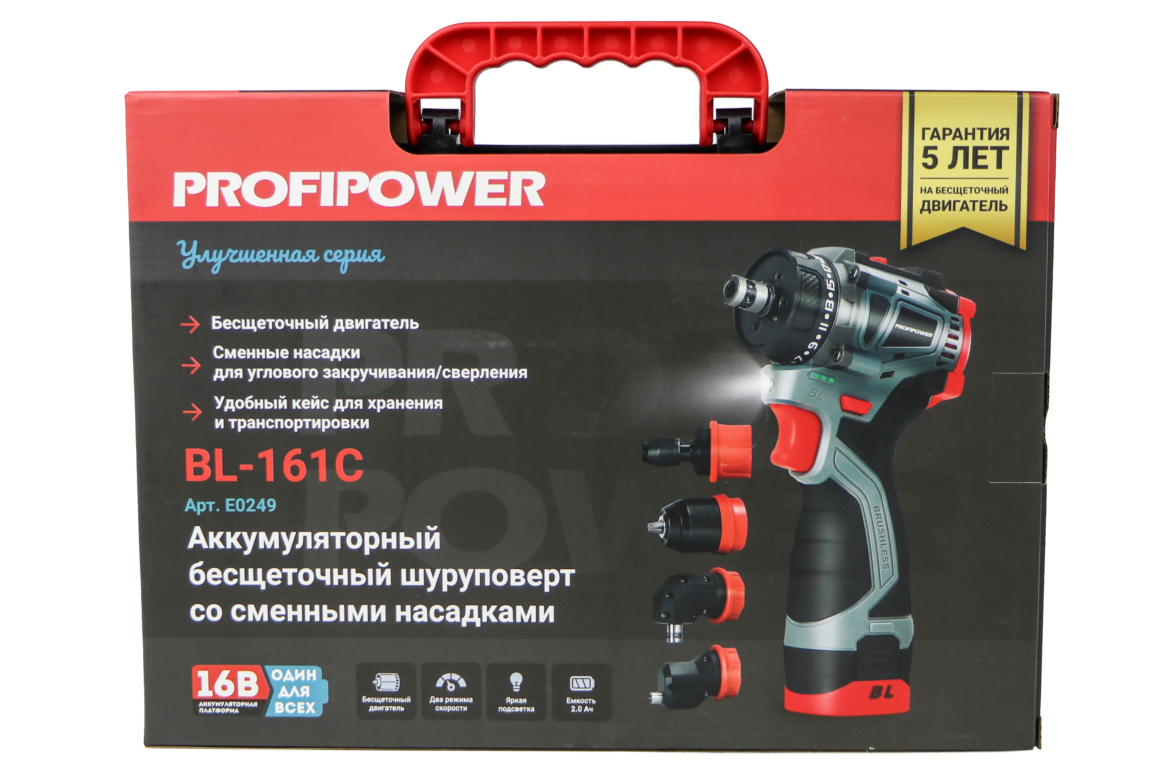 Дрель-шуруповерт аккумуляторная PROFIPOWER BL-161C Комби E0249. Особенности и преимущества: - 40 Нм крутящий момент позволяет выполнять задачи любой сложности. - Лёгкий и эргономичный дизайн, несмотря на 16 В формат, производитель сделал рукоятку достаточно тонкой и удобной, что 4 элемента в аккумуляторе не ощущаются. - Наличие двух аккумуляторов в комплекте, а так же дополнительного держателя для бит и клипсы на пояс, делают этот шуруповерт эксклюзивным по удобству и мобильности. - Бесщёточная технология обеспечивает стабильную работу и долгий срок службы инструмента. - Быстросъемный патрон, для быстрой смены работы между сверлом и битами. - Угловая насадка для работы в труднодоступных местах. - Насадка со смещённым центром для точного сверления и закручивания в нестандартных положениях. - Насадка-битодержатель для удобства работы с различными битами.