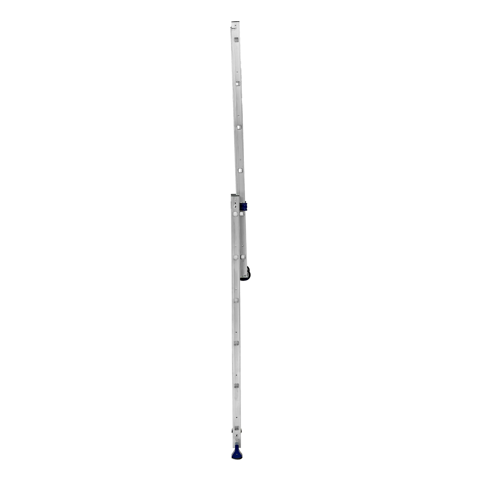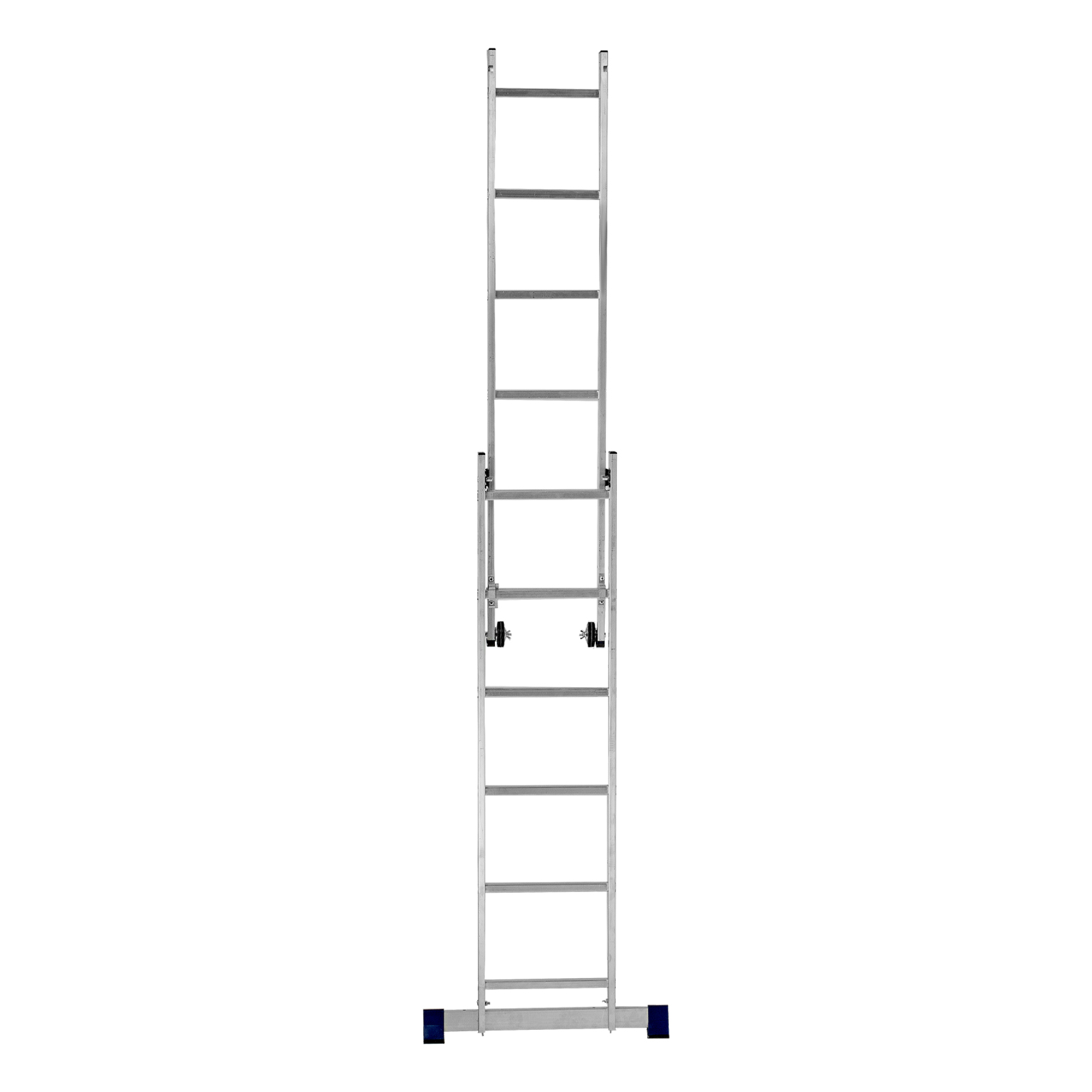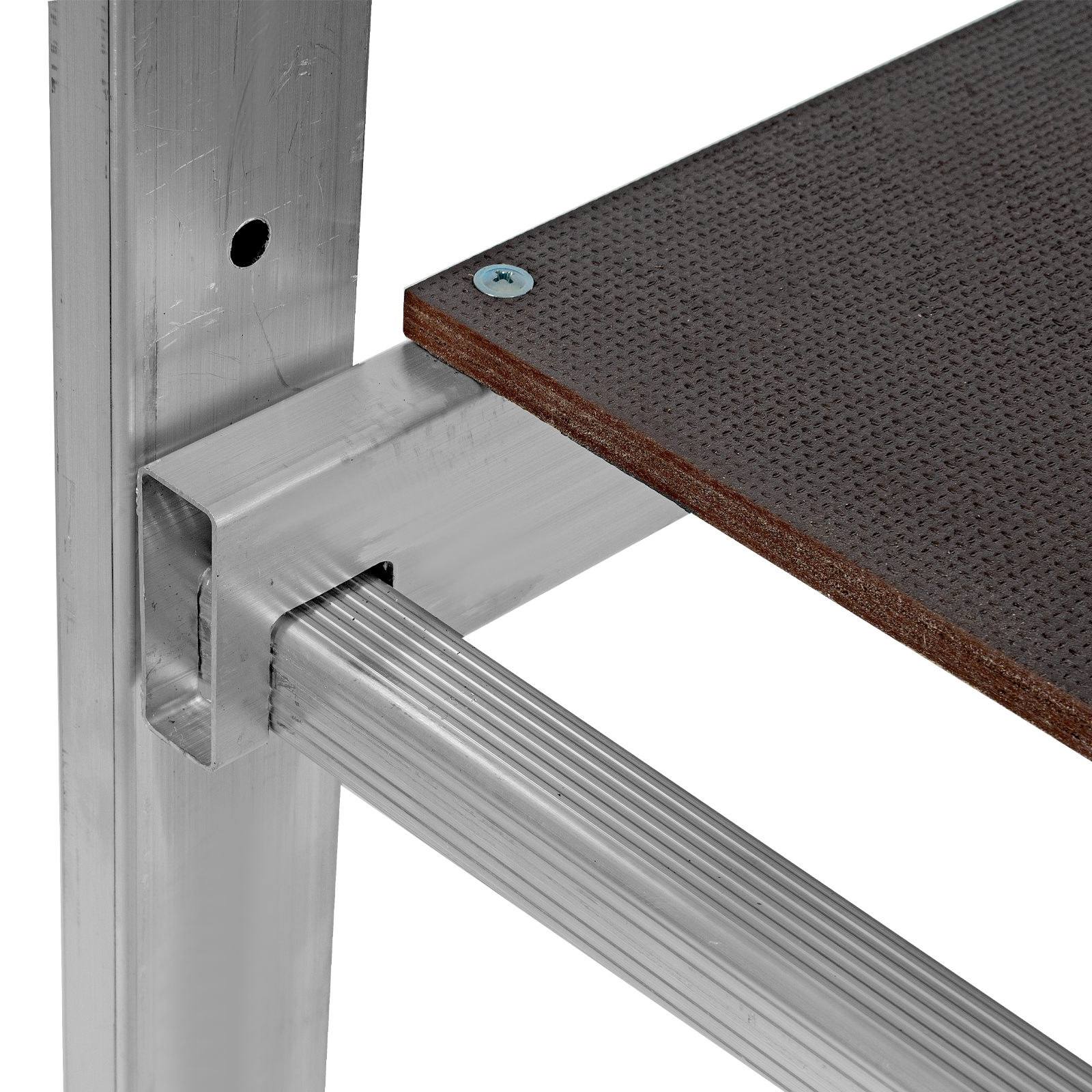 - Надежная конструкция — ступеньки прочно соединены с опорами за счет многократной развальцовки, выдвижная секция крепко удерживается алюминиевыми кронштейнами.