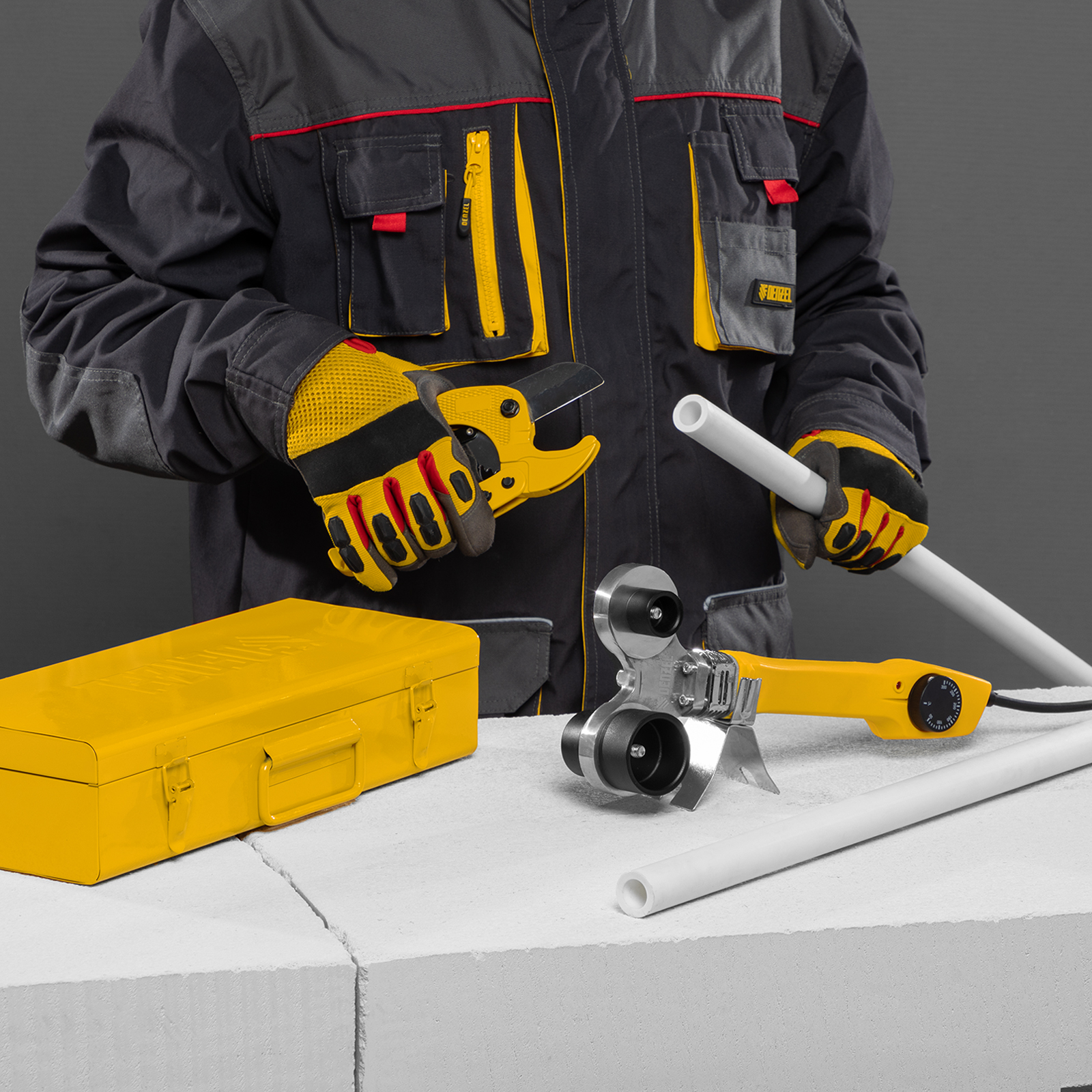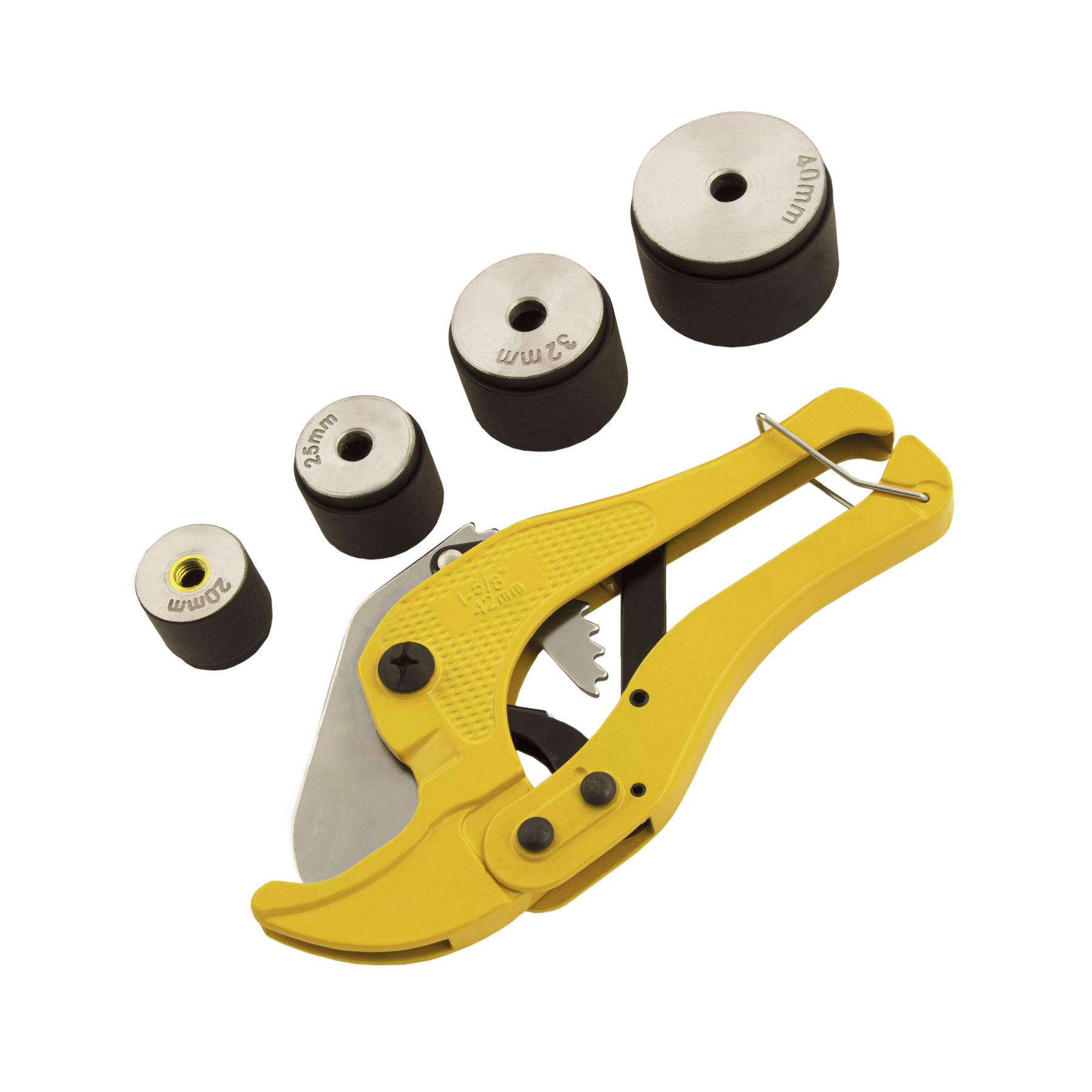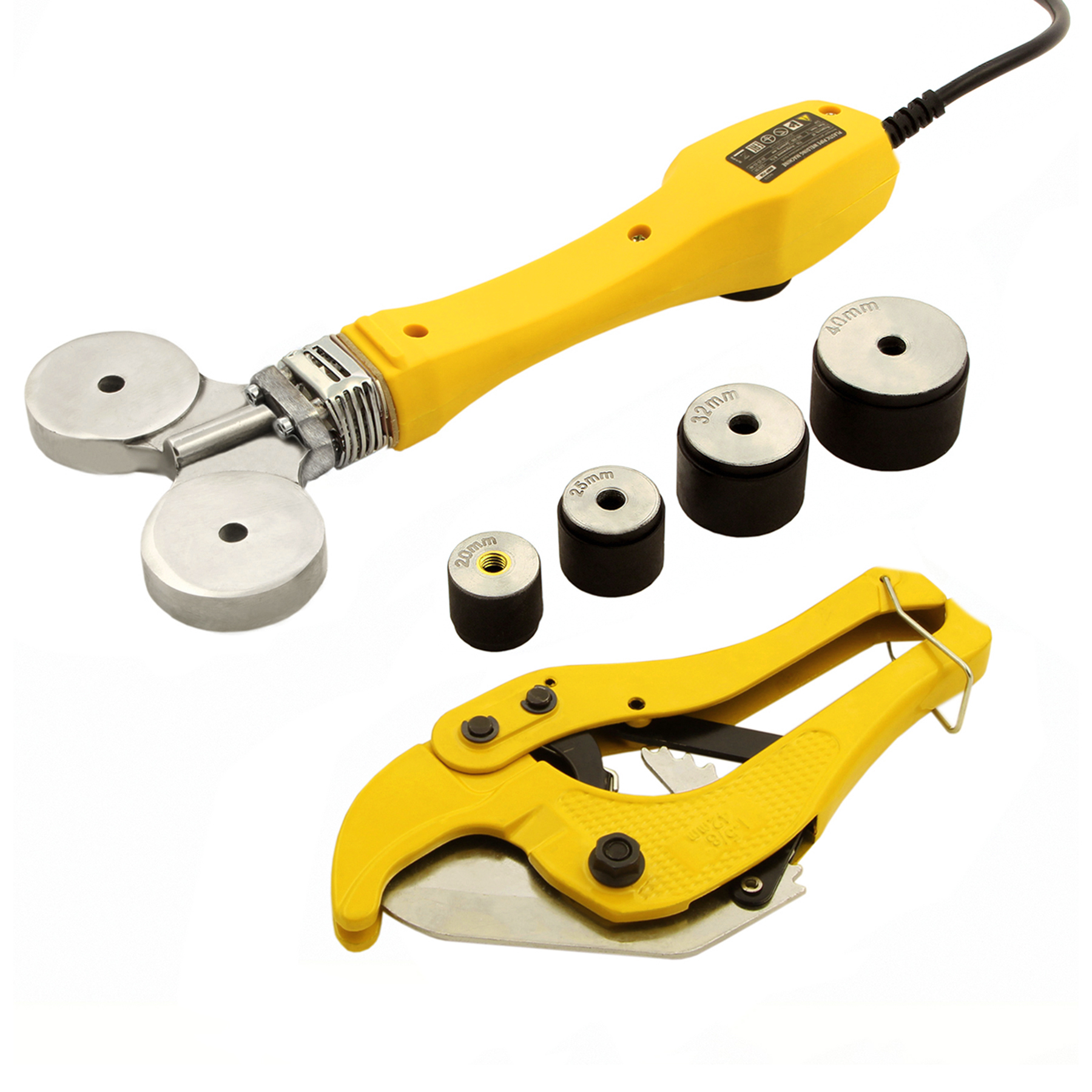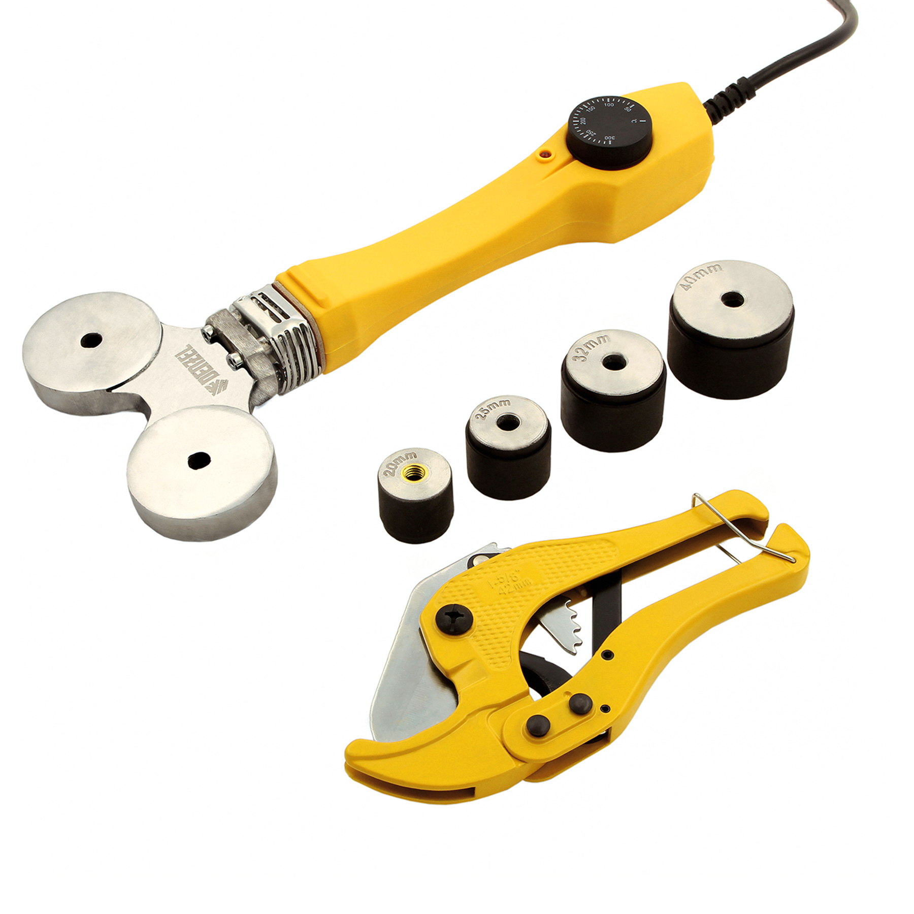 Широкий комплект поставки — к аппарату прилагаются 4 насадки для соединения труб диаметром 20, 25, 32 и 40 мм, имбусовый ключ и труборез.