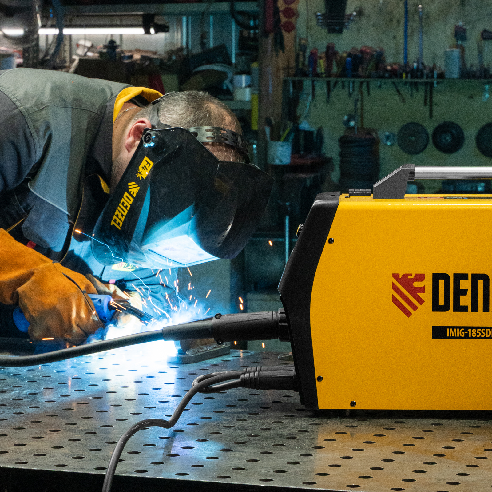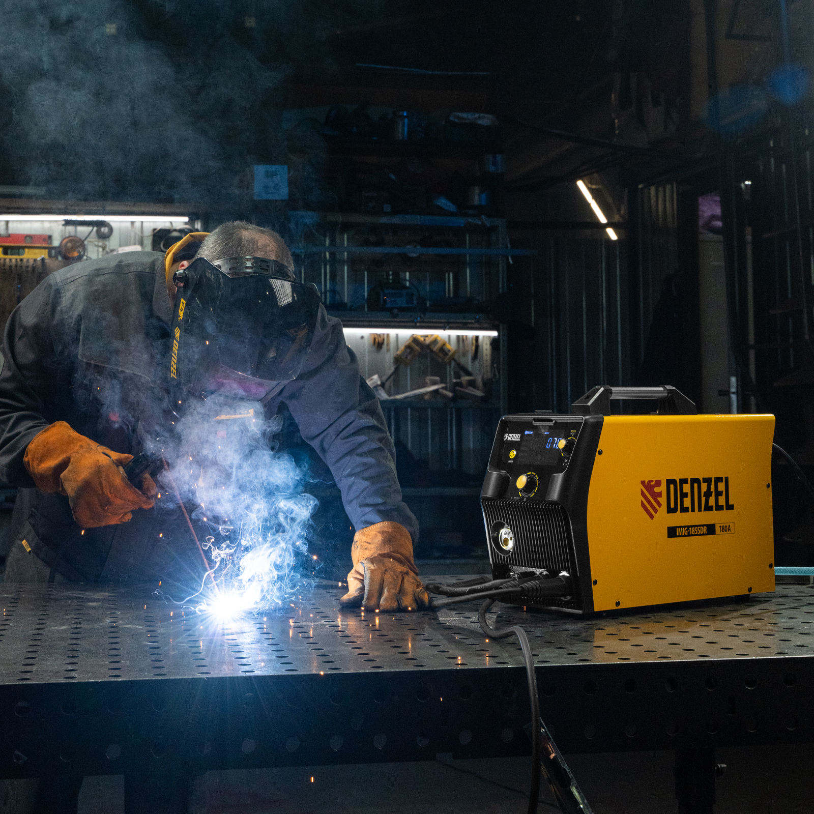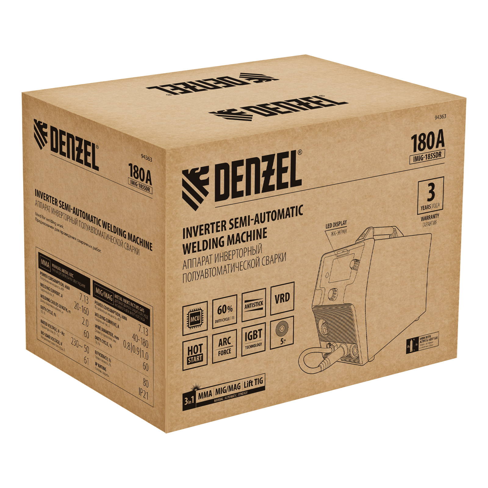Инверторный аппарат полуавтоматической сварки Denzel IMIG-185SDR 94363 работает с максимальным сварочным током 180 A и совместим с катушками массой от 1 до 5 кг, продолжительность включения составляет 60%. Аппарат разработан с использованием передовой инверторной технологии IGBT, что обеспечивает стабильный сварочный ток на выходе и высокий КПД при низком энергопотреблении. Возможна работа при нестабильном напряжении в сети. Синергетическое управление упрощает подбор параметров сварки в зависимости от конкретной задачи: аппарат предлагает оптимальные значения напряжения, скорости подачи проволоки и т.д.