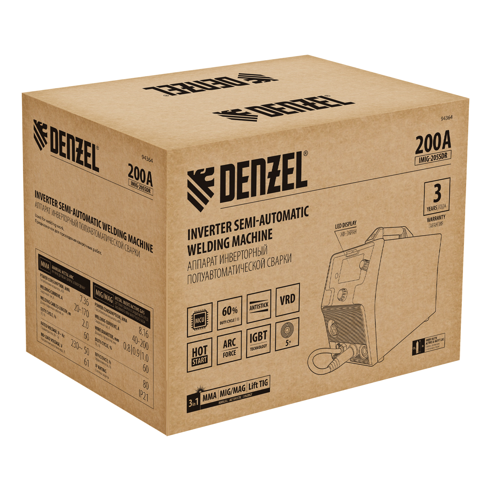 Инверторный аппарат полуавтоматической сварки Denzel IMIG-205SDR 94364 работает с максимальным сварочным током 200 A и совместим с катушками массой от 1 до 5 кг, продолжительность включения составляет 60%. Аппарат разработан с использованием передовой инверторной технологии IGBT, что обеспечивает стабильный сварочный ток на выходе и высокий КПД при низком энергопотреблении. Возможна работа при нестабильном напряжении в сети. Синергетическое управление упрощает подбор параметров сварки в зависимости от конкретной задачи: аппарат предлагает оптимальные значения напряжения, скорости подачи проволоки и т.д.