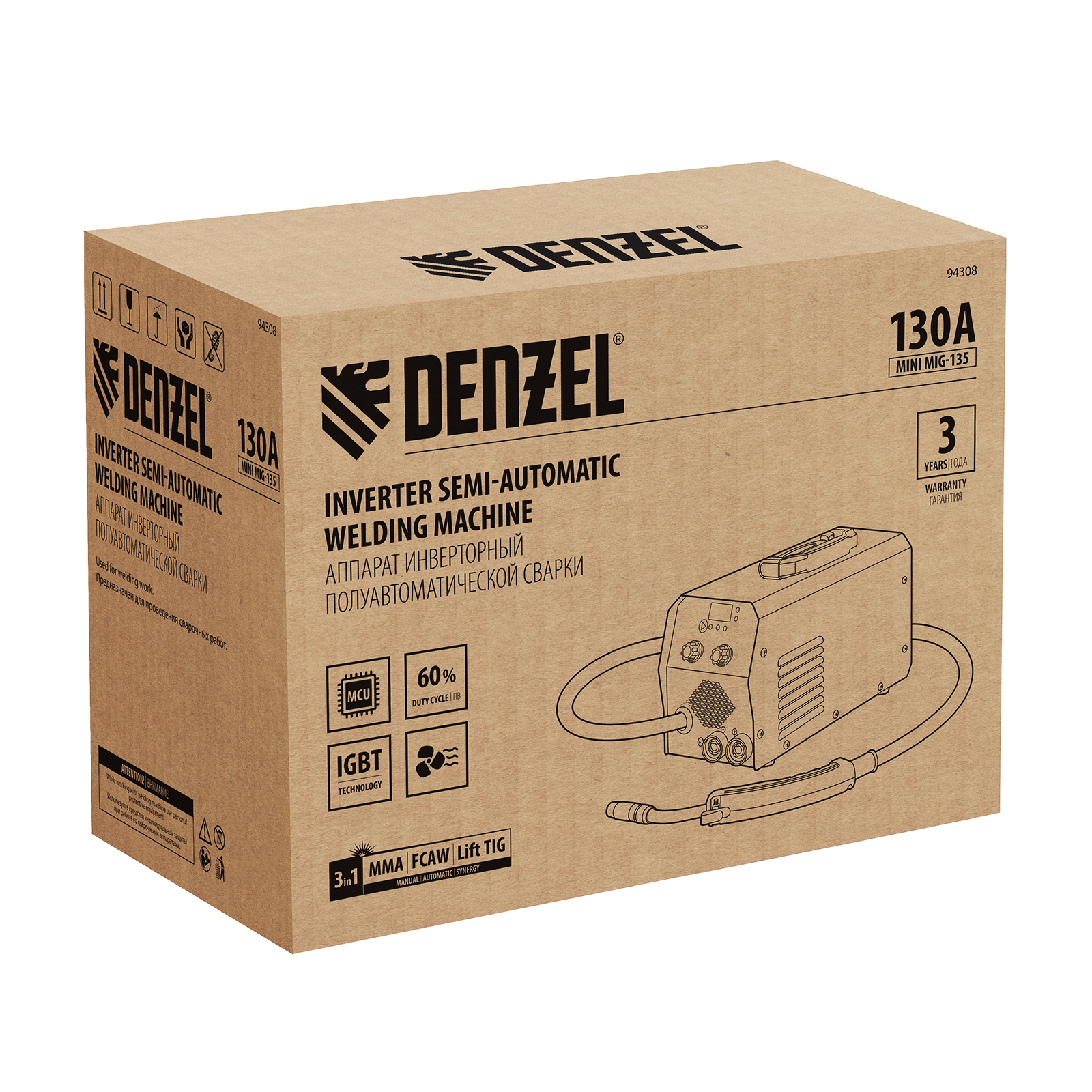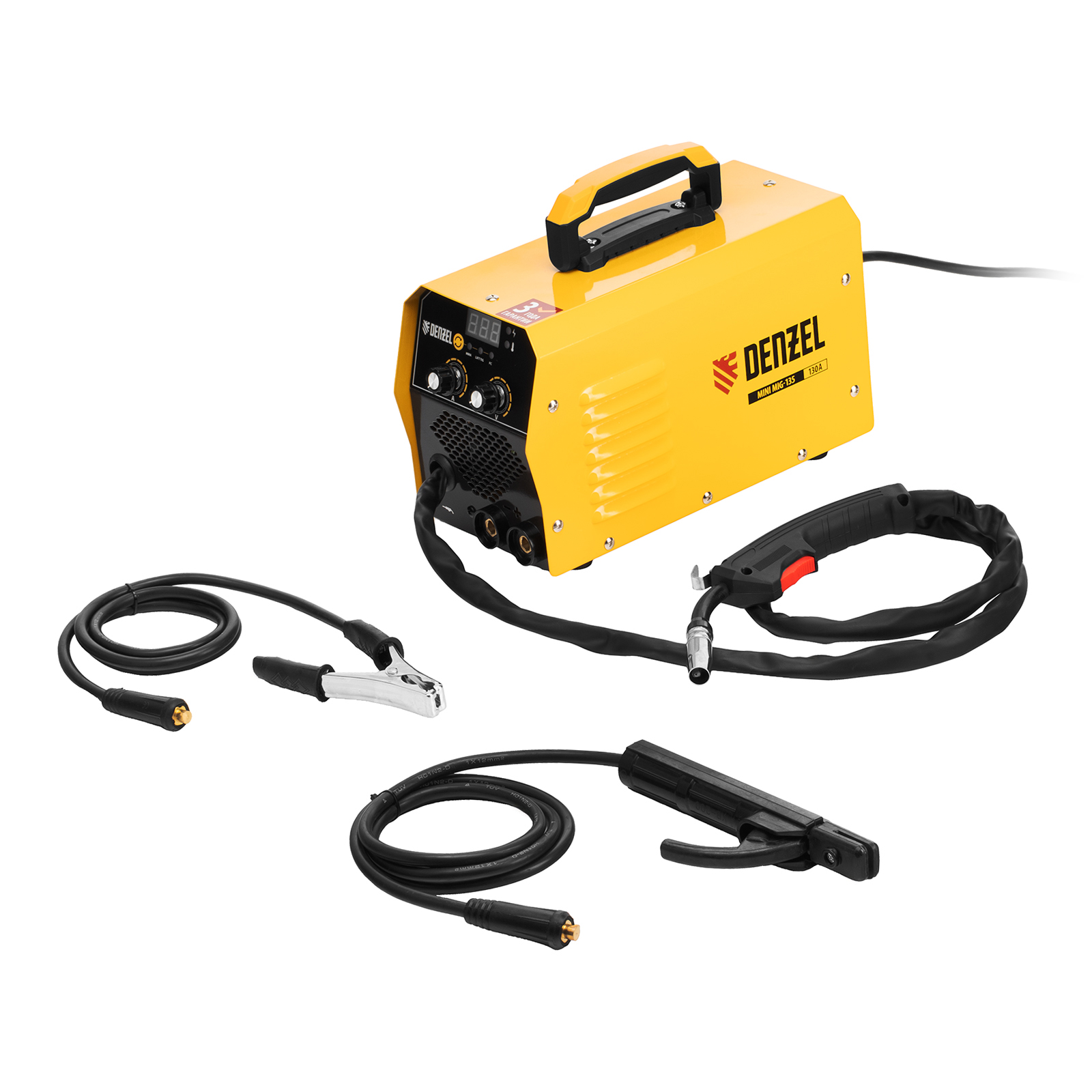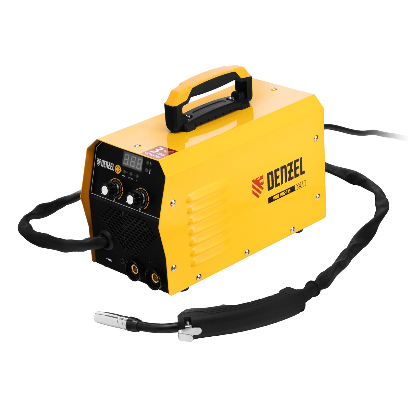 Инверторный аппарат полуавтоматической сварки Denzel Mini MIG-135 94308 предназначен для выполнения сварочных работ при постоянном токе до 130 A и продолжительности включения 60%. Доступные режимы: ручная дуговая сварка покрытым электродом (MMA), сварка порошковой (или флюсовой) проволокой диаметром 0,6/0,8 мм (FCAW), а также аргонодуговая сварка неплавящимся электродом (Lift TIG). Горелка TIG не входит в комплект поставки и приобретается отдельно.
