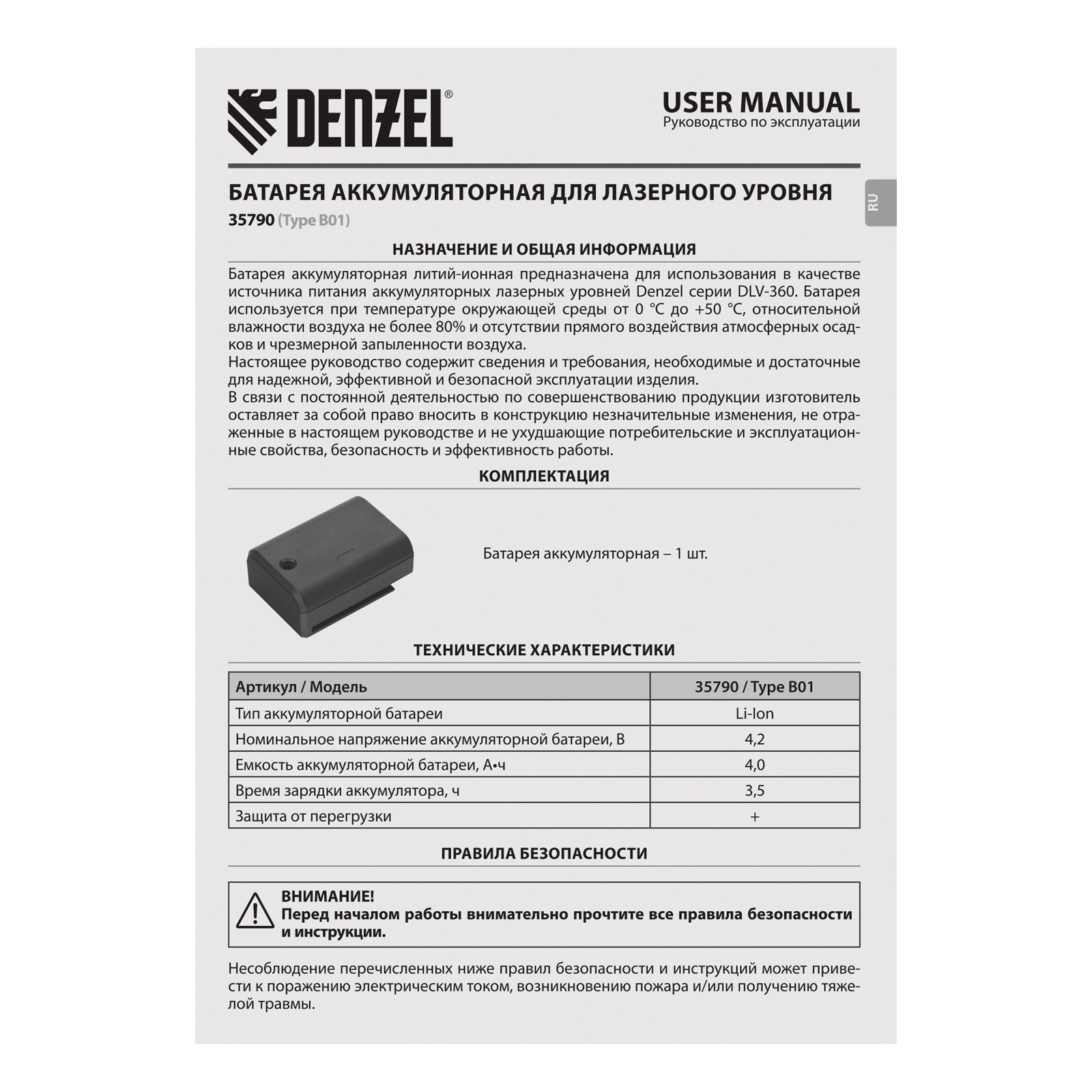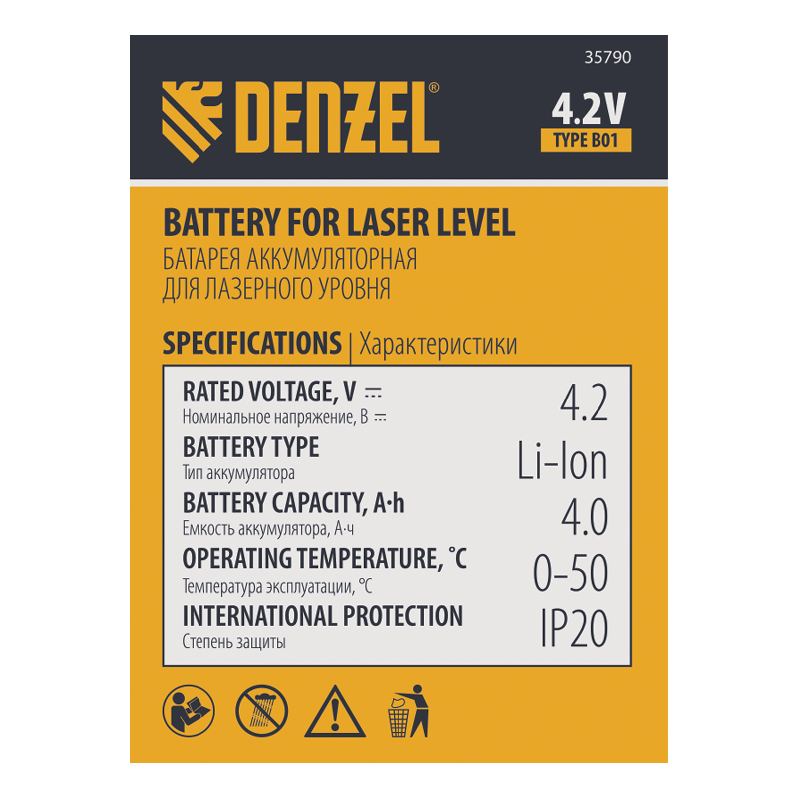 Аккумуляторная батарея Type B01 Denzel 35790 емкостью 4000 мА·ч поддерживает напряжение 4,2 В и предназначена для обеспечения функционирования лазерных уровней Denzel серии DLV-360. Легко снимается и устанавливается в отсек инструмента при помощи полозьев и специального разъема. Аккумулятор Li-Ion обеспечивает эффективную работу лазерного уровня в течение длительного времени.