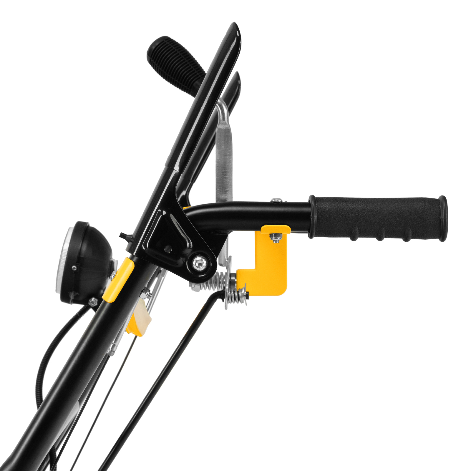 - Надежная конструкция — высокая стальная панель придает жесткость раме и повышает комфорт использования бензинового снегоуборщика.