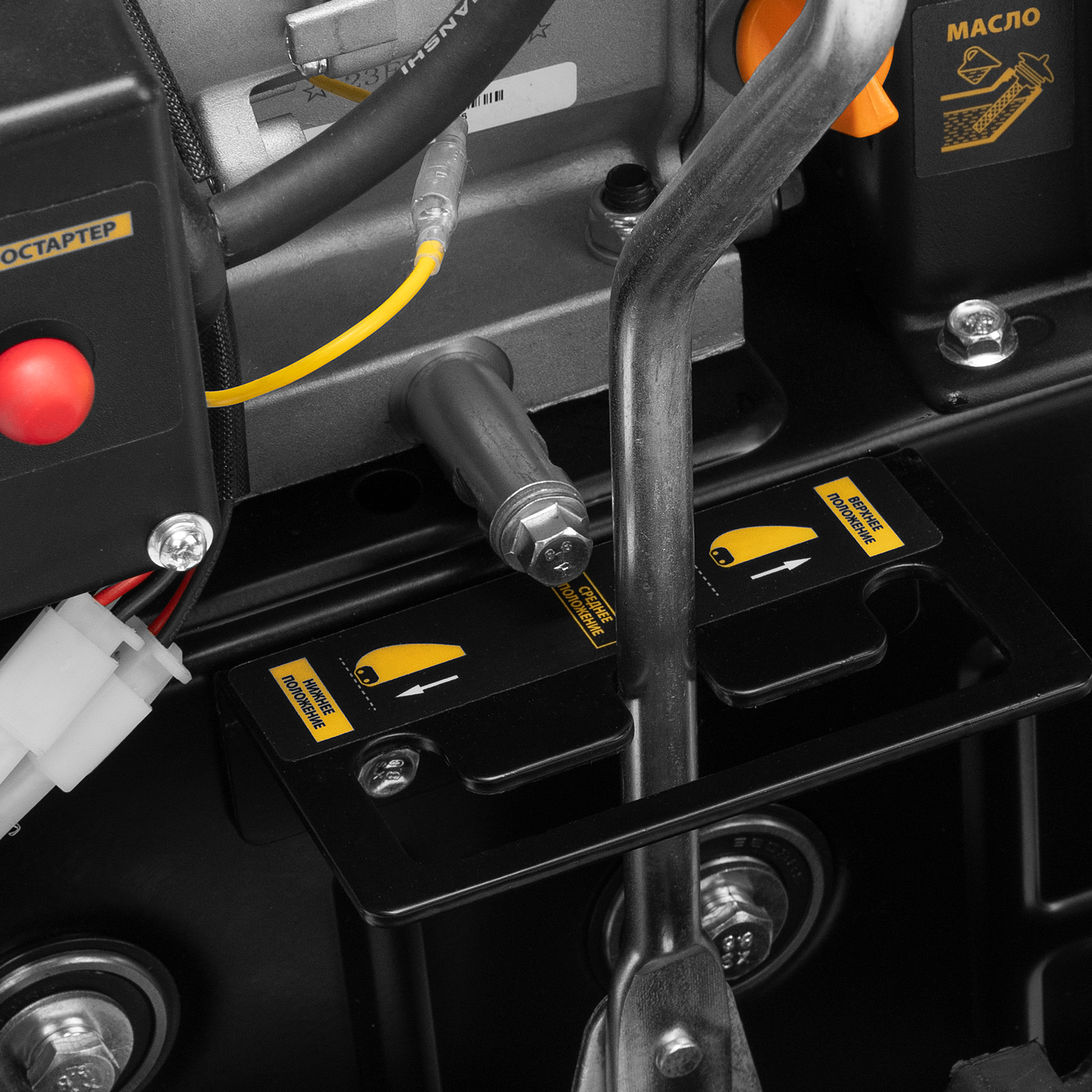 - Электростартер — для быстрого запуска двигателя достаточно подключить машину к розетке 230 В и нажать на кнопку.