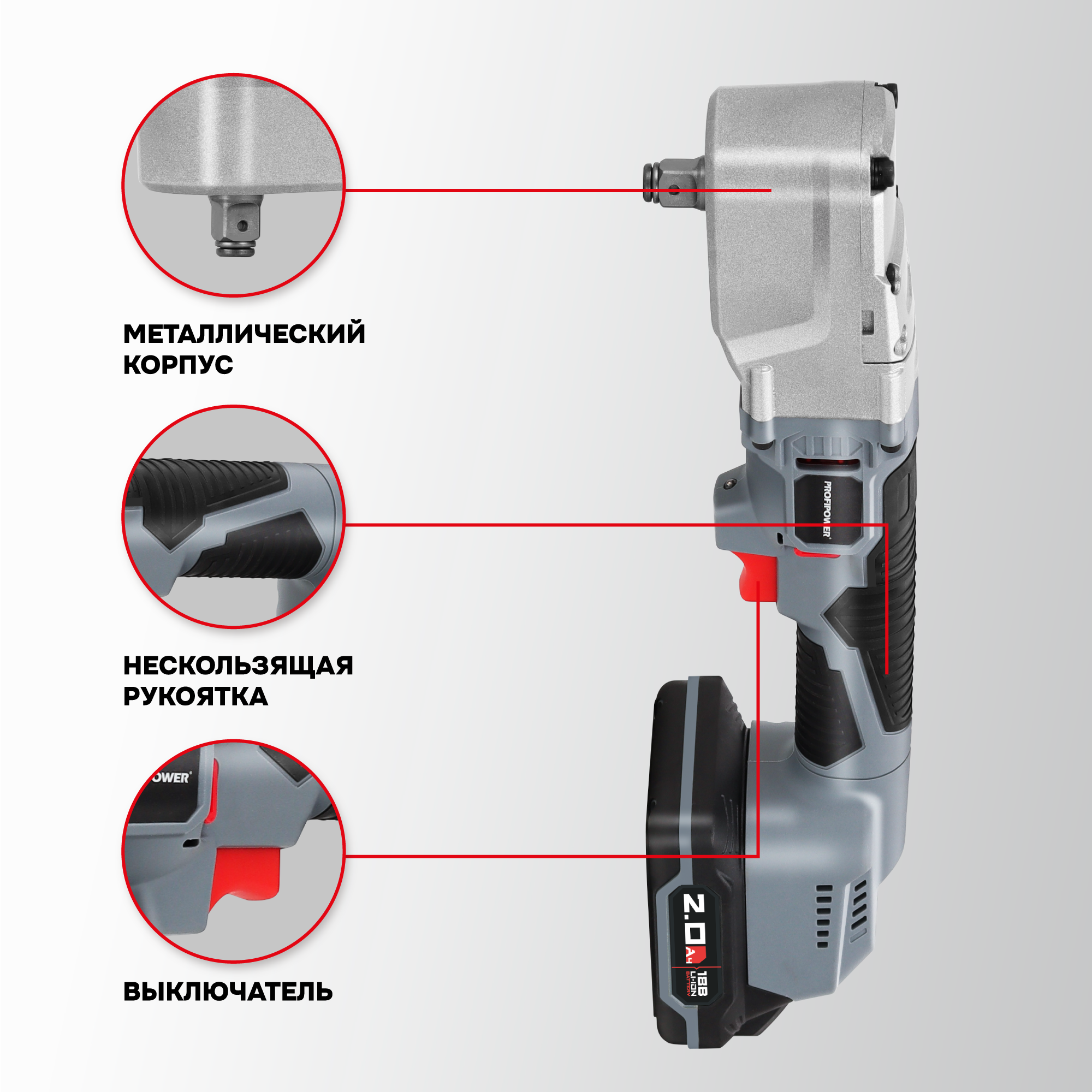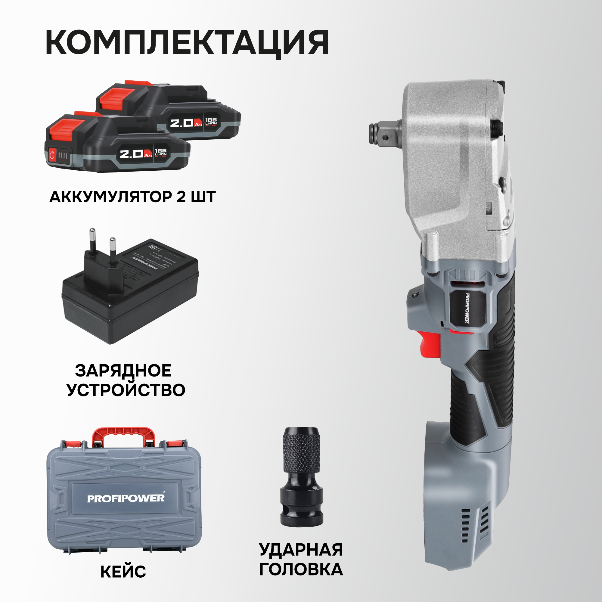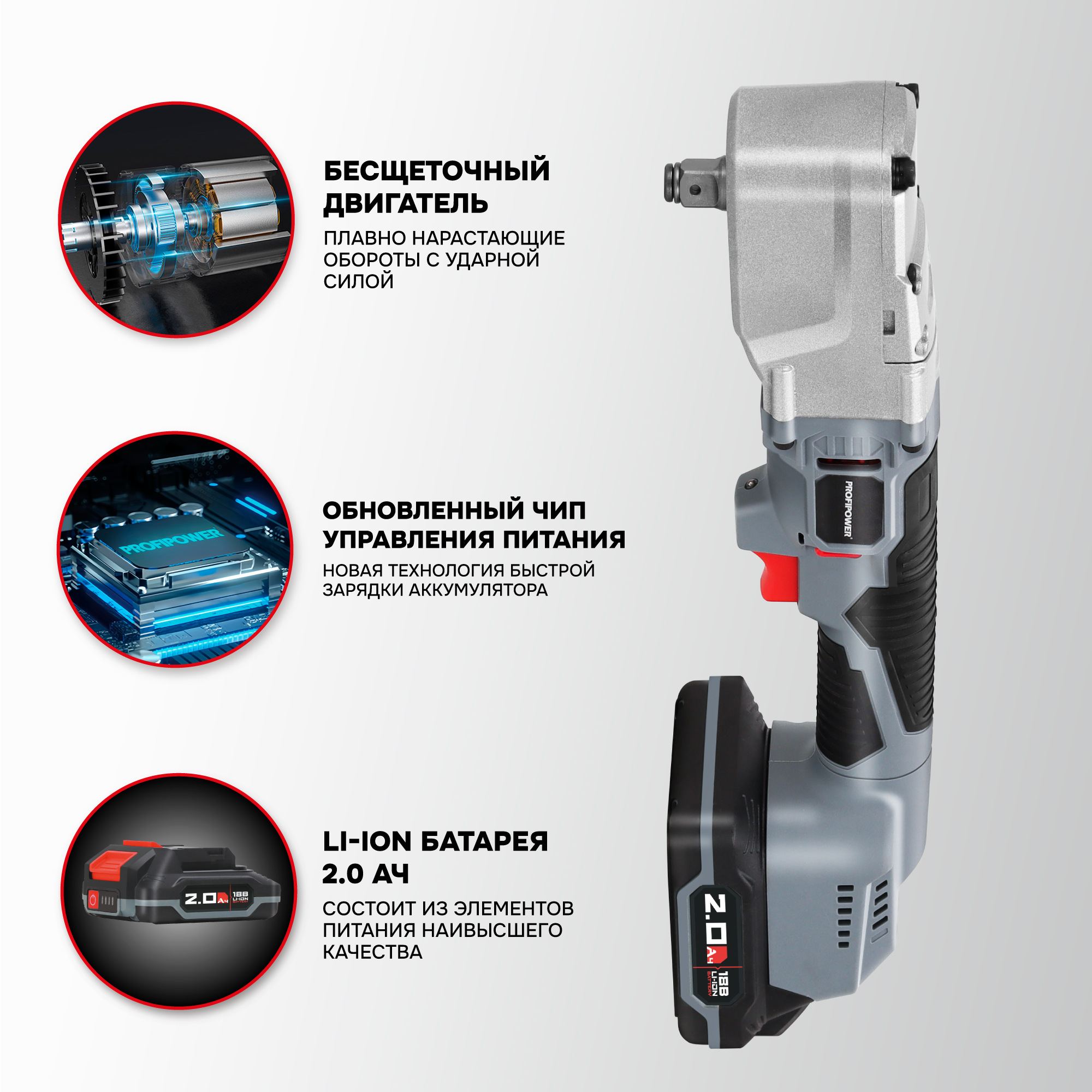 Аккумуляторный угловой гайковерт бесщеточный ProfiPower CNDTW-18B 18 вольт подходит для завинчивания и откручивания крупного крепежа (винтов, шпилек, нагелей, «глухарей», крупных саморезов), мелких гаек и болтов. Крутящий момент 440 Нм расширяет сферу применения инструмента. Бесщеточный двигатель – компактен, более стабильные рабочие параметры, не изнашивается и прост в обслуживании. Встроенный тангенциальный ударный механизм автоматически подключается в случае нагрузки на вал и помогает использовать высокий крутящий момент при одновременно низкой отдаче на руку. Это помогает справиться с прочно сидящем крепежом или достаточно твердым материалом. Наличие двух режимов закручивания с различной частотой ударов и скоростью вращения позволяет правильно выбрать параметры инструмента в зависимости от размера винта и типа рабочего основания. Электронная регулировка скорости нажатием на триггер облегчает выполнение операций. Подключаемый импульсный режим выкручивания прочно сидящих винтов, а также дополнительный режим откручивания с защитой от срыва настраивает инструмент под конкретную задачу для наилучших результатов работы. Электронный бесконтактный запуск двигателя уменьшает нагрев, не изнашивает детали и обеспечивает максимально эффективную работу. Защита от перегрузок автоматически отключит инструмент, чтобы предохранить аккумулятор от перегрева и быстрого разряда. Эргономичный полимерный корпус с резиновыми демпферами обеспечивает превосходный контроль инструмента и его безопасную эксплуатацию. Держатель с автоматической фиксацией насадок 1/4" (6,35мм) позволяет быстро и легко заменять оснастку. Металлический корпус редуктора защищает детали от повреждения и перегрева. Яркая светодиодная подсветка рабочей области облегчает выполнение операций в затемненных местах. Единая аккумуляторная платформа серии MK подходит для всех типов электроинструментов и садовой техники этой линейки. Аккумуляторы доступны в различных размерах и вариантах ёмкости. Они взаимозаменяемые