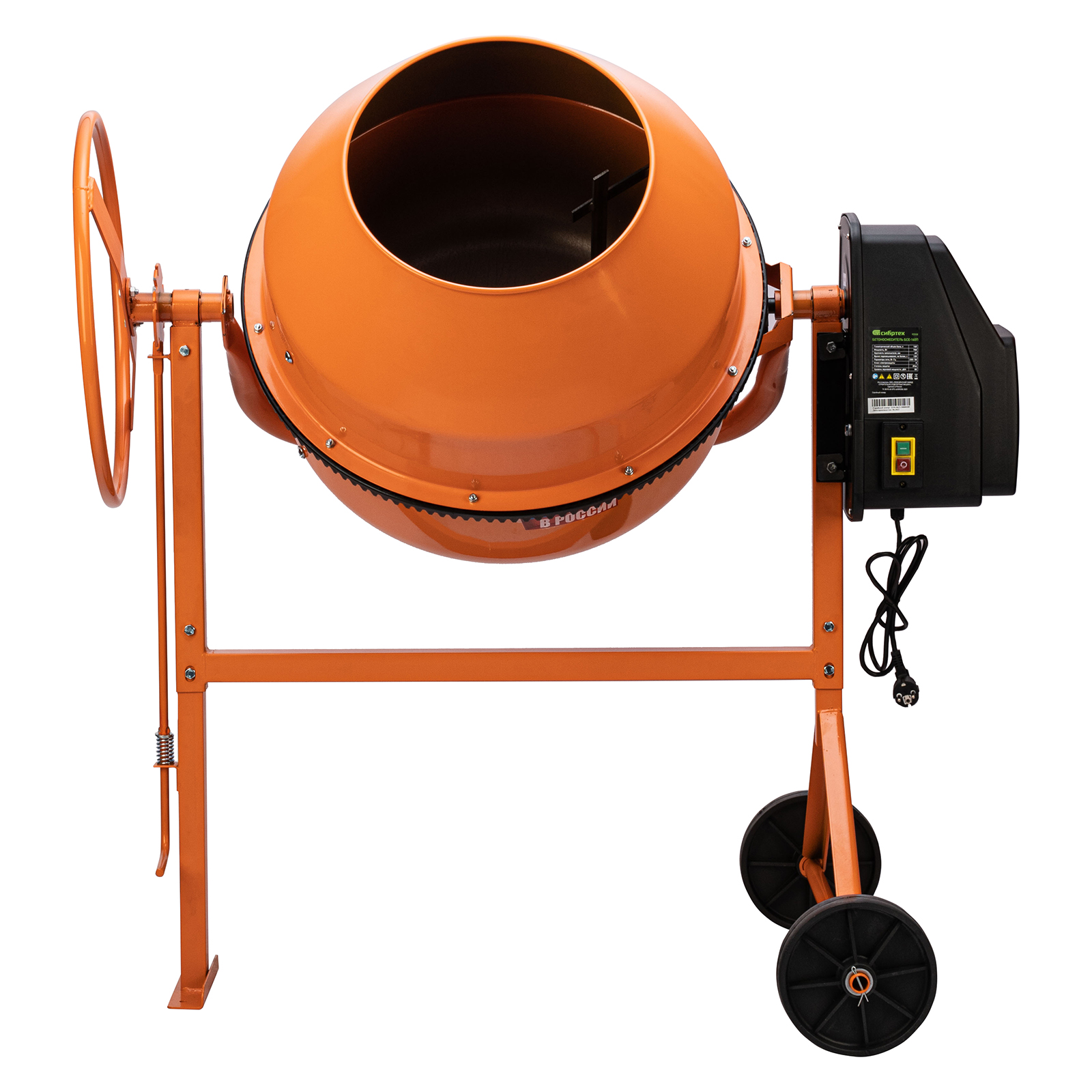 - Продуманная конструкция — увеличенный диаметр колес обеспечивает устойчивость бетоносмесителя во время работы, а также упрощает его перемещение по рабочей площадке.