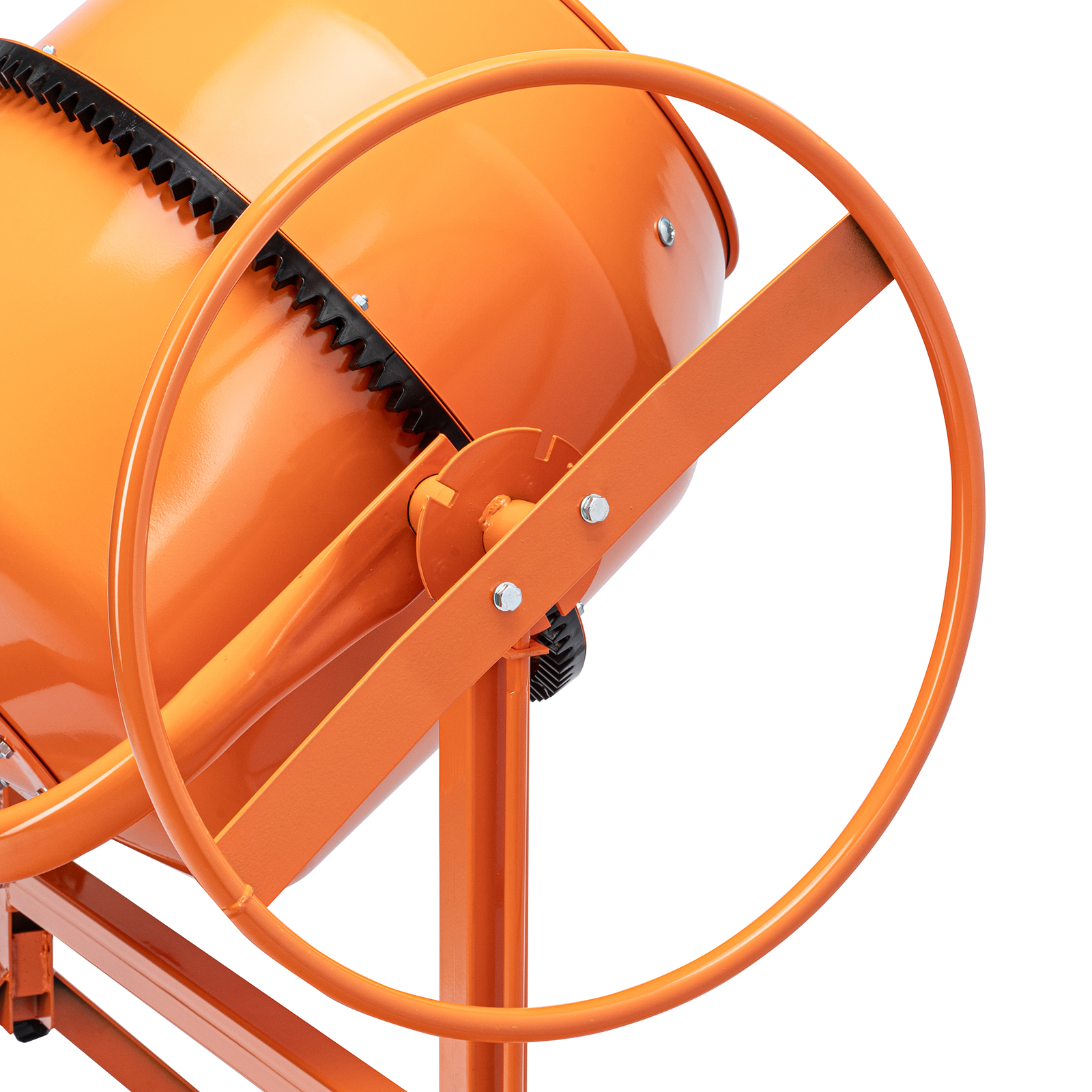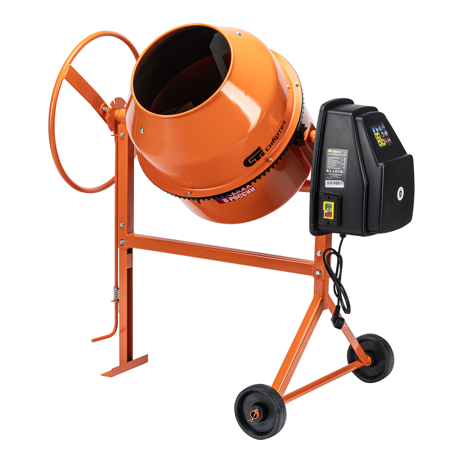 - Удобная загрузка и выгрузка смеси — барабан наклоняется при помощи маховика и легко фиксируется в нужном положении.