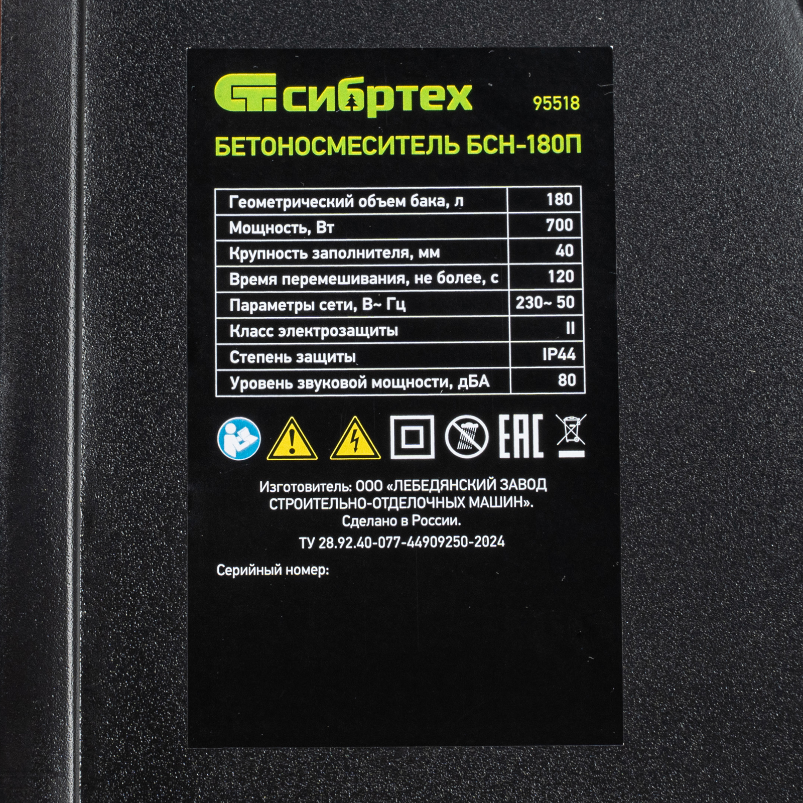 Бетоносмеситель Сибртех БСН-180П 95518 мощностью 700 Вт предназначен для приготовления бетонных смесей и штукатурных растворов. Допускается использование крупнозернистых заполнителей с фракциями размером до 40 мм. Объем бака составляет 180 л, за один замес можно получить до 80 л готовой смеси. Время замешивания не превышает 2 минут, что позволяет избежать длительных перерывов в работе. Бетоносмеситель используется для проведения строительных работ небольшого объема.