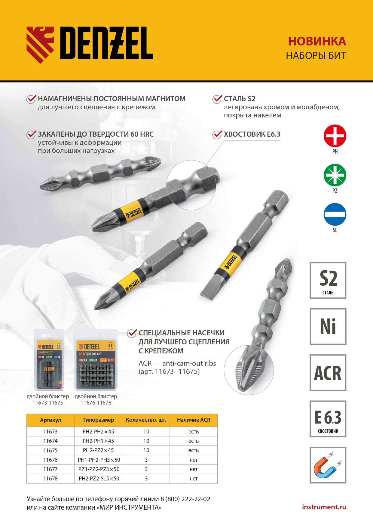 Набор двусторонних бит PH2-PH1 х 45 мм Denzel 11674 из стали S2 предназначен для монтажа/демонтажа саморезов по дереву и других резьбовых соединений с помощью шуруповерта. Насадки с двумя рабочими профилями самого востребованного типа Phillips подходят как для бытового, так и для профессионального использования.