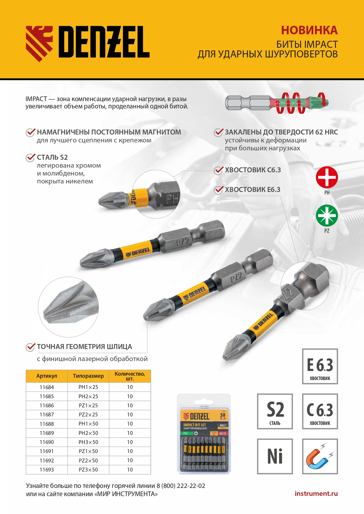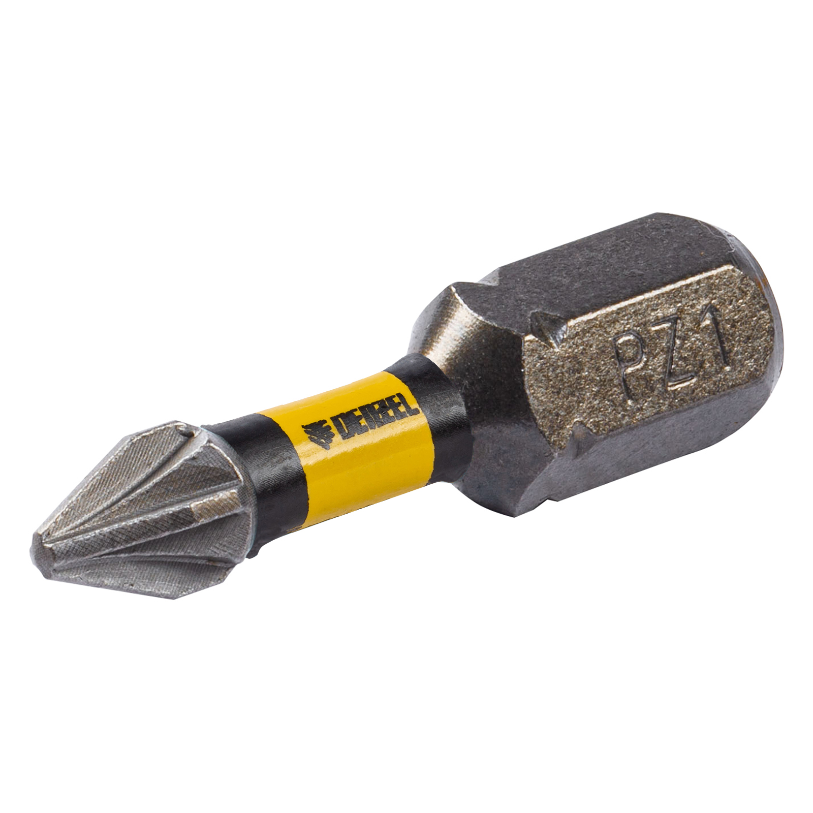 Набор бит торсионных PZ1 x 25 мм Denzel 11686 с лазерной обработкой шлица, из стали S2, 10 шт., предназначен для монтажа и демонтажа резьбовых соединений с помощью ударного шуруповерта. Он незаменим в строительных, слесарных и монтажных работах, в автосервисах, при проведении ремонта в доме.,Торсионная зона способна пружинить, за счет чего она частично амортизирует тангенциальный удар от шуруповерта. Такое решение позволяет равномерно распределить нагрузку по бите, избежать поломки шлица и в разы увеличить объем работы, проделанный одной насадкой.