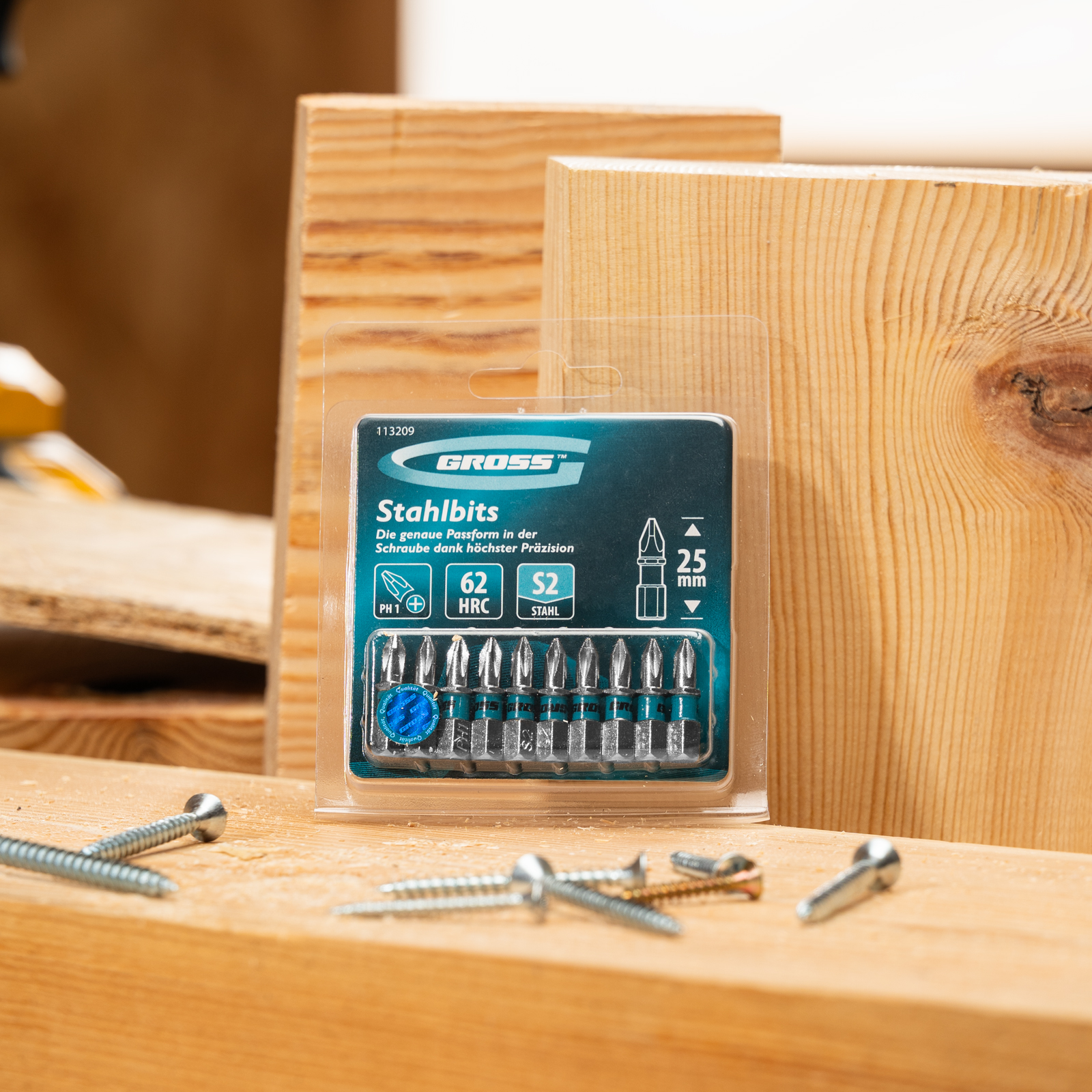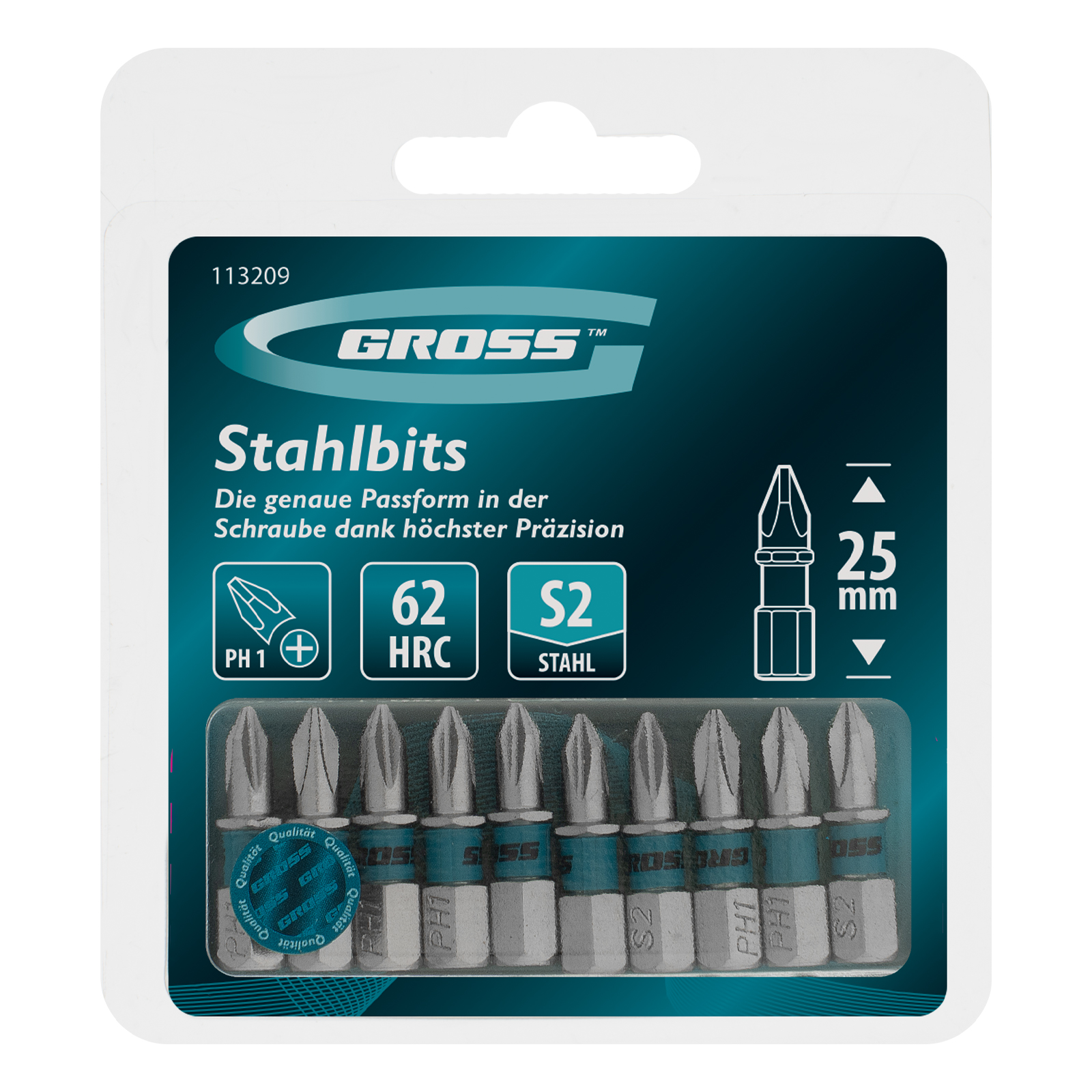 Биты PH1 х 25 мм Gross 113209 из стали S2, с шестигранным профилем, предназначены для шуруповертов и отверток-адаптеров с присоединительным шестигранником 1/4″. Применяются для работы с саморезами по дереву, шурупами и другим резьбовым крепежом. Устойчивое сцепление с крепежом благодаря прецизионной обработке граней позволяет увеличить крутящий момент и снизить риск соскакивания биты.