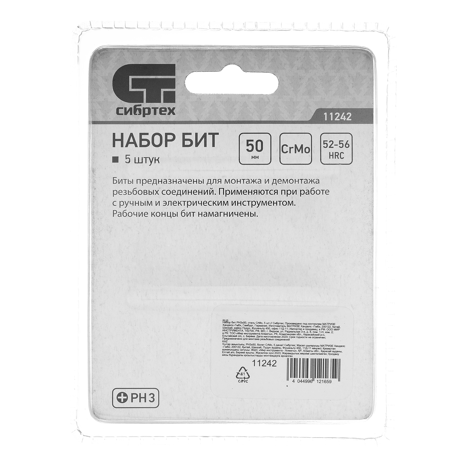 Набор бит Сибртех 11242 включает 5 крестообразных насадок PH3 x 50 мм из стали CrMo, с шестигранным присоединительным хвостовиком. Они используются в качестве сменной оснастки для шуруповертов, реверсивных и электрических отверток. Биты PH3 подходят для монтажа и демонтажа винтов и саморезов соответствующего типоразмера во время сборки мебели, проведения строительных, монтажных и ремонтных работ.