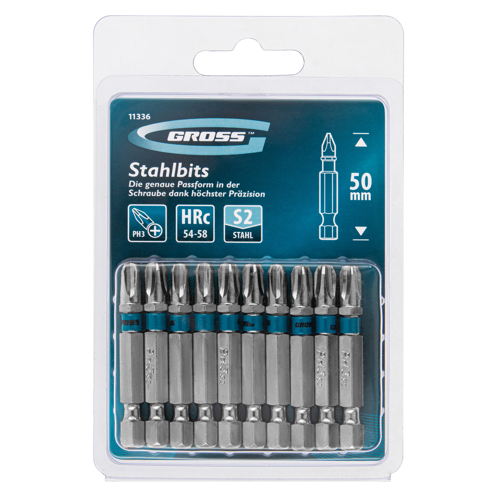 Набор бит Gross 11336 состоит из 10 наиболее востребованных крестообразных насадок типа PH3 длиной 50 мм, с хвостовиком 1/4 дюйма, изготовленных из стали S2 и предназначенных для использования с шуруповертами и отвертками-адаптерами. За счет оптимальной геометрии и высокой точности исполнения шлица биты не проскальзывают в головках крепежа. Оснастки используются для монтажа и демонтажа саморезов по дереву, шурупов и других резьбовых крепежей.