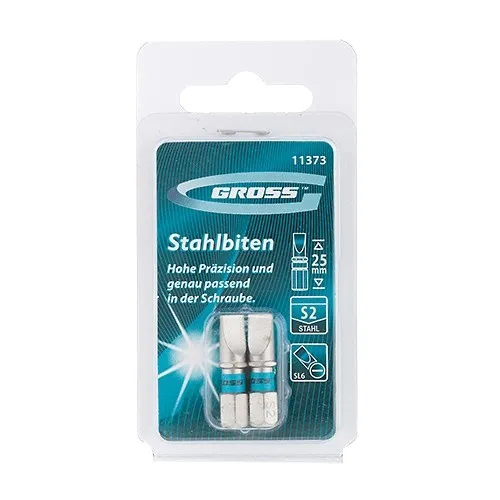 Набор бит SL 6,0 х 25 мм Gross 11373 включает 2 сменные насадки из стали S2 для шуруповертов и отверток-адаптеров с присоединительным шестигранником 1/4". Биты со шлицами «минус» размером 6 мм применяются для монтажа и демонтажа винтов, саморезов и другого резьбового крепежа.