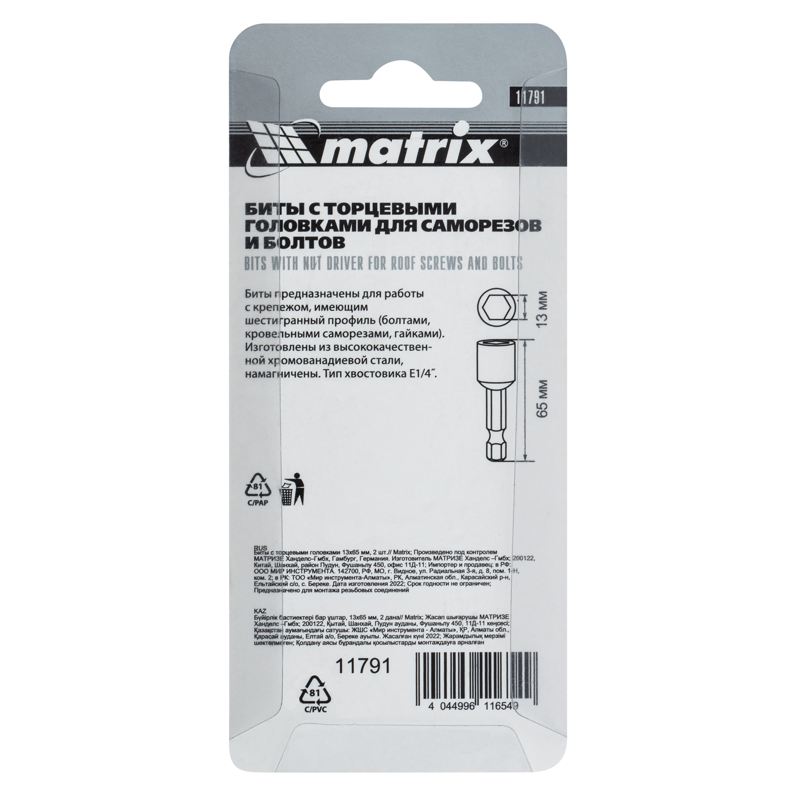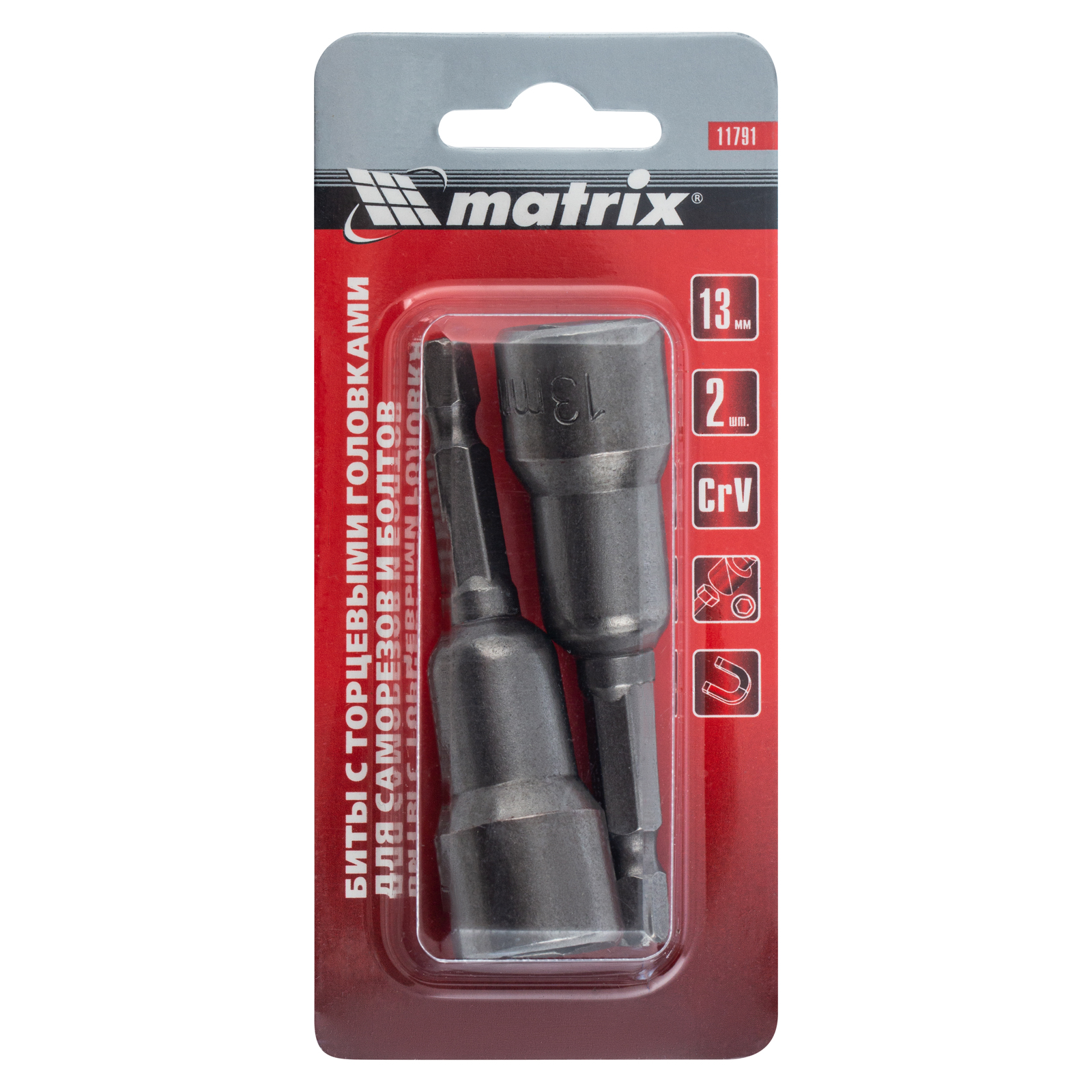 Биты с торцевыми головками Matrix 11791 размером 13 х 65 мм, 2 шт. в уп., предназначены для работ с шуруповертом. Используются при монтаже и демонтаже болтов и шурупов, а также кровельных саморезов с внешним шестигранником. Увеличенная длина 65 мм облегчает работу в труднодоступных местах. Биты способны полностью заменить торцевые головки, особенно если под рукой нет трещотки.