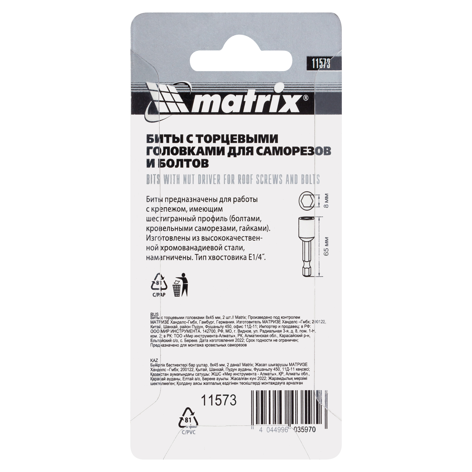 Биты с торцевыми головками Matrix 11573 размером 8 х 65 мм, 2 шт. в уп., предназначены для работ с шуруповертом. Используются при монтаже и демонтаже болтов и шурупов, а также кровельных саморезов с внешним шестигранником. Увеличенная длина 65 мм облегчает работу в труднодоступных местах. Биты способны полностью заменить торцевые головки, особенно если под рукой нет трещотки.