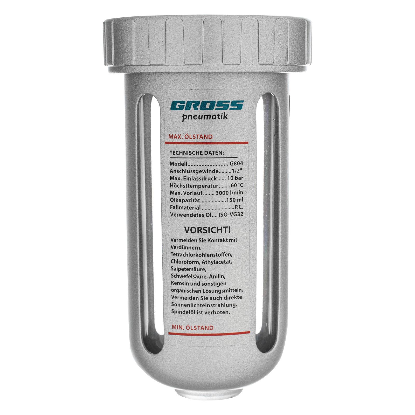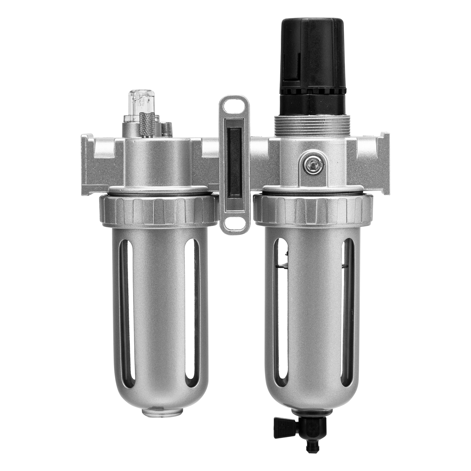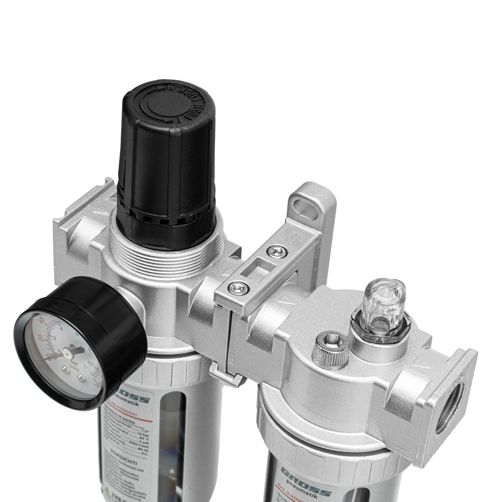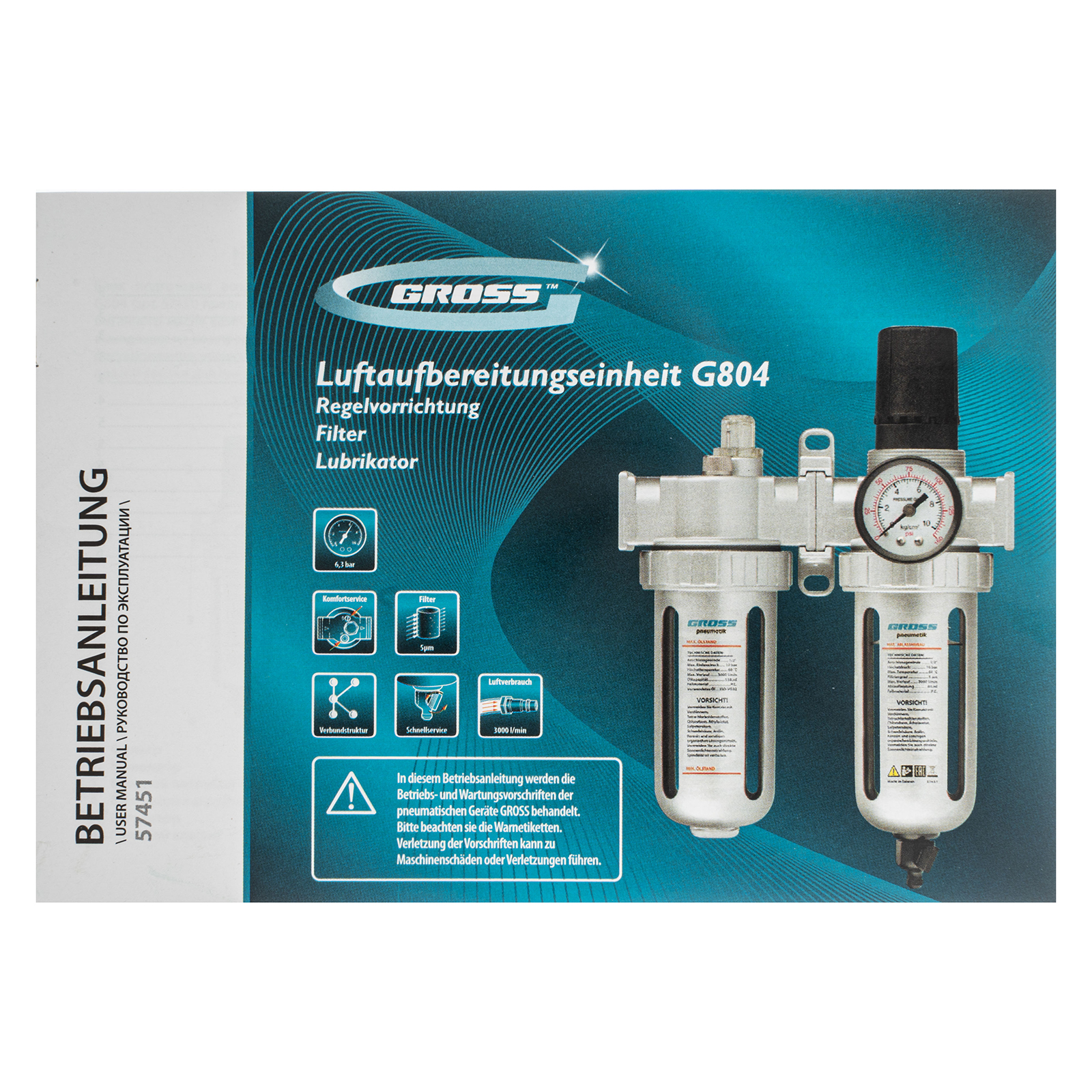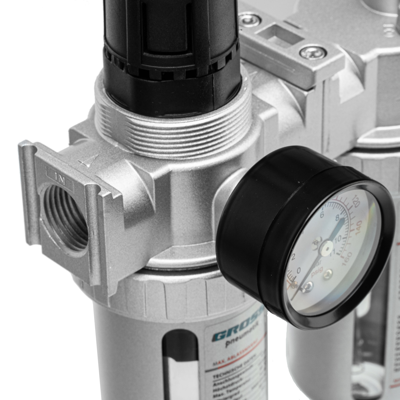 Блок подготовки воздуха Gross G804 57451 с присоединительной резьбой 1/2 дюйма одновременно выполняет функции регулятора уровня давления, фильтра и лубрикатора. Устройство используется с компрессорами, работающими под давлением до 10 бар, и будет полезно на производстве, строительной площадке и в автомастерской.