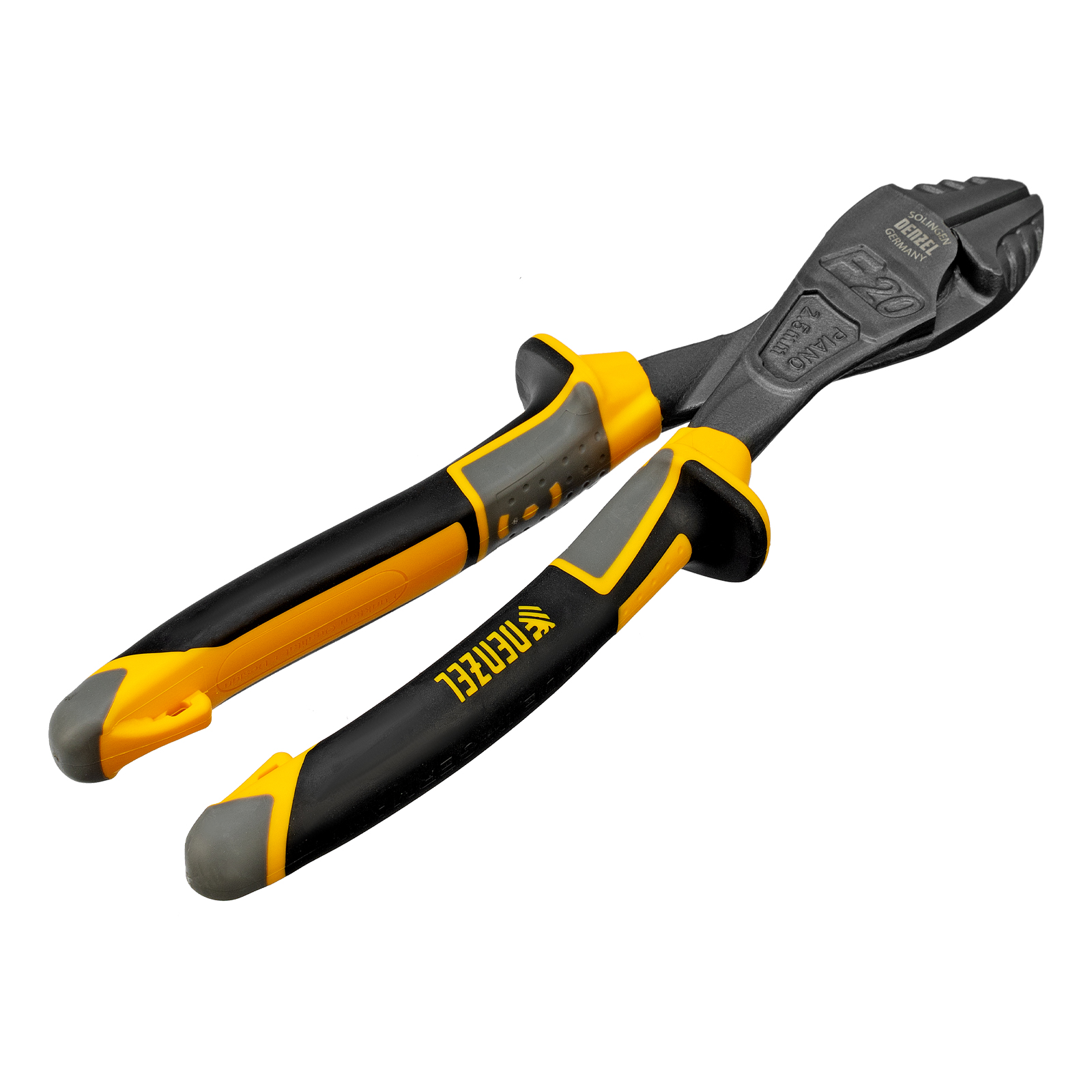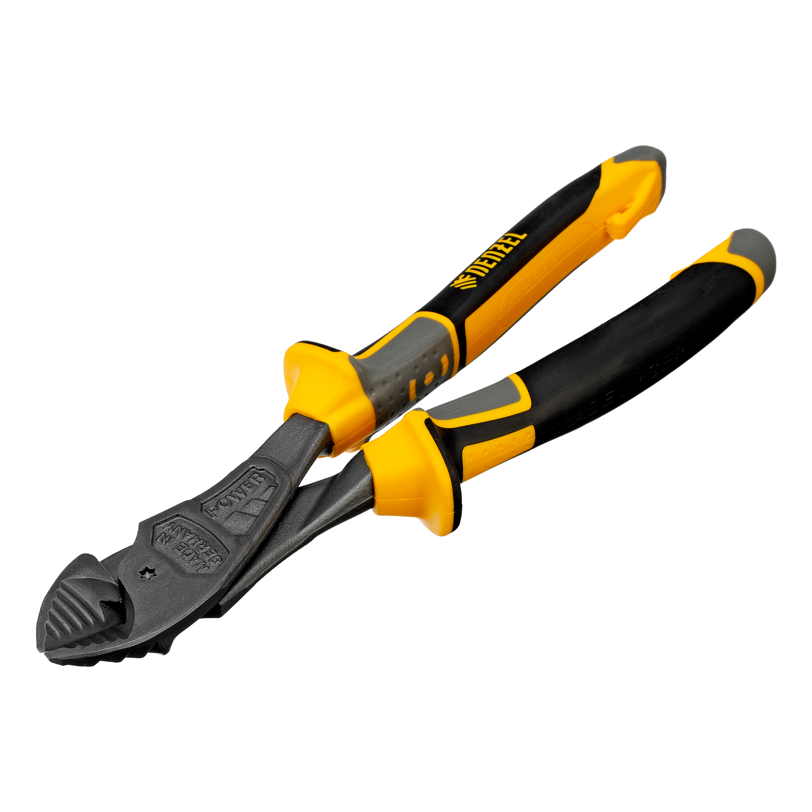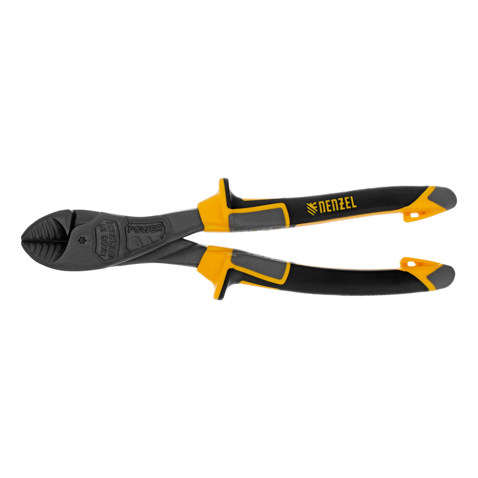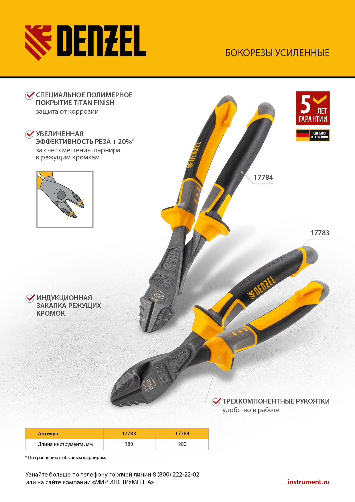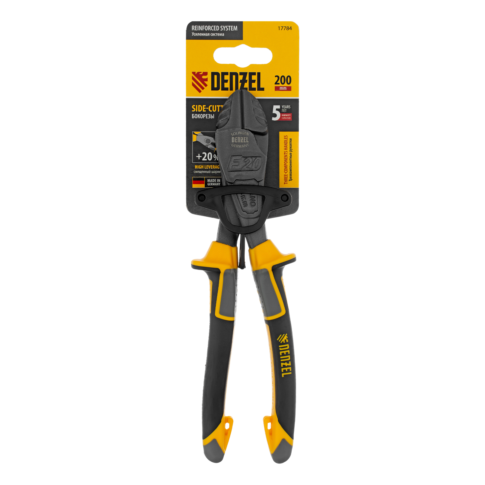 Усиленные бокорезы Denzel 17784 длиной 200 мм, с трехкомпонентными рукоятками, предназначены для разрезания кабелей, проводов, гвоздей и проволоки средней (750 Н/мм2) и высокой жесткости (1800 Н/мм2) диаметром 4 и 2,8 мм соответственно. Подходят для резки рояльных струн (предел прочности 2300 Н/мм2) диаметром до 2,5 мм. Успешно справляются не только с медными, алюминиевыми и пластмассовыми деталями, но и с более жесткими стальными элементами. Встроенный рычажный механизм и смещенный непосредственно к режущим кромкам шарнир увеличивают усилие реза на 20%.