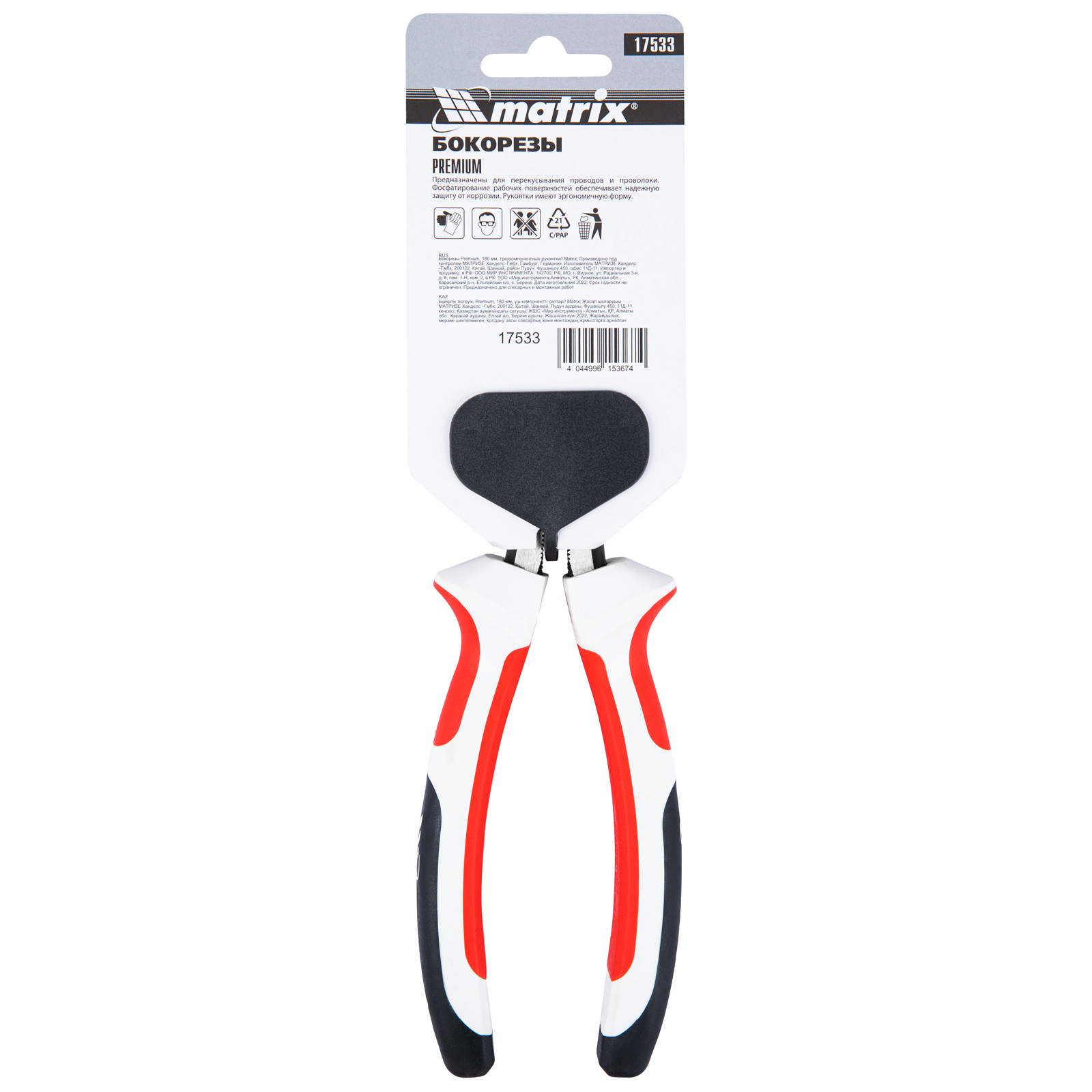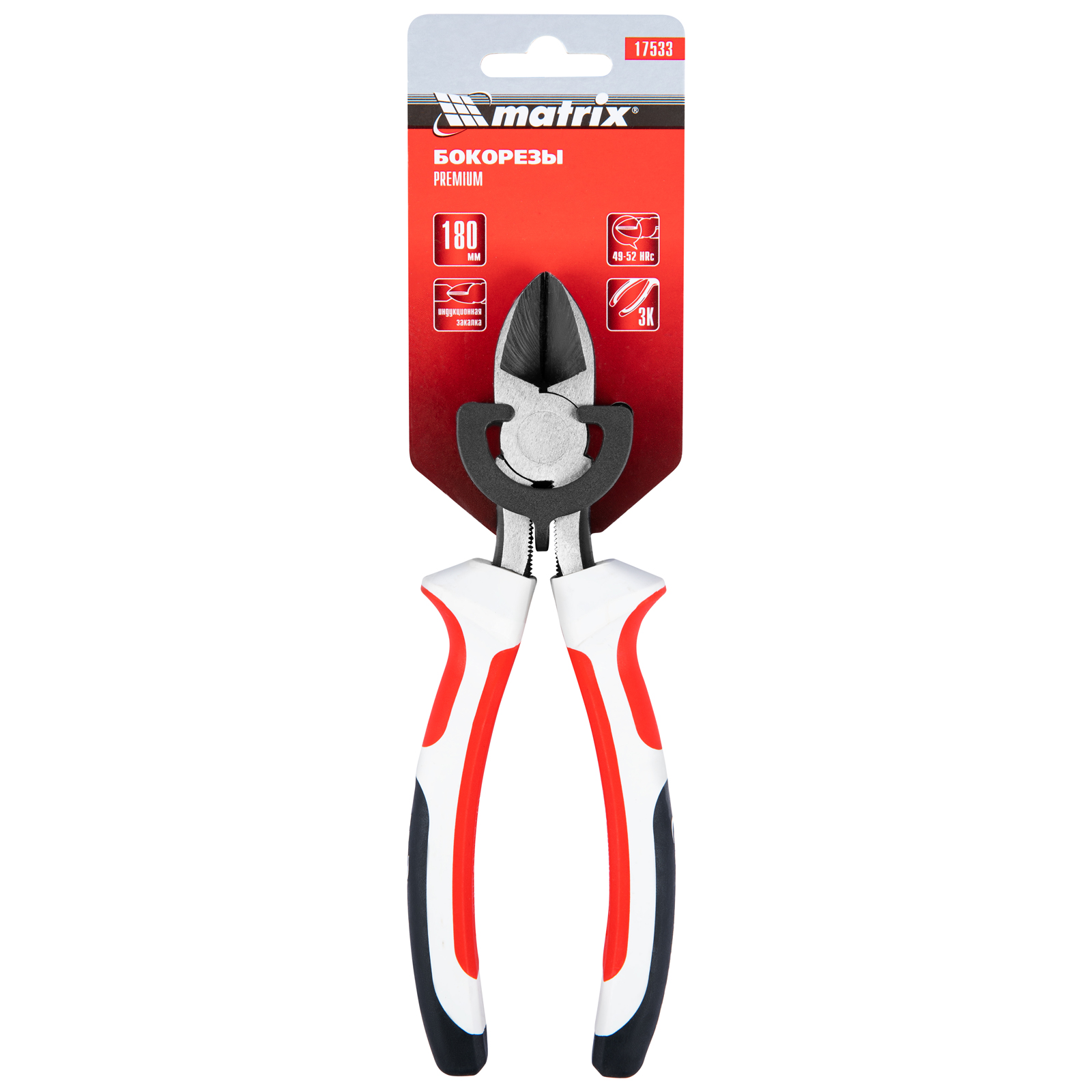 <p>Бокорезы Matrix Premium 17533 длиной 180 мм, с трехкомпонентными рукоятками, применяются для разрезания проволоки, кабелей и проводов во время слесарных и монтажных работ. Они подходят как частным, так и профессиональным мастерам и будут полезны в гараже, дома, на строительной площадке, в мастерской.</p><h2>Преимущества</h2><ul><li>Долговечность — рабочие части, прошедшие индукционную закалку токами высокой частоты, отличаются износостойкостью.</li><li>Прочность — режущие кромки твердостью 49-52 HRC устойчивы к механическим воздействиям и легко разрезают плотные материалы.</li><li>Безопасная эксплуатация — благодаря широким ограничительным упорам рука не соскальзывает к режущим элементам.</li><li>Комфортная работа — трехкомпонентные рукоятки обеспечивают надежный хват и не выскальзывают из ладони.</li></ul>