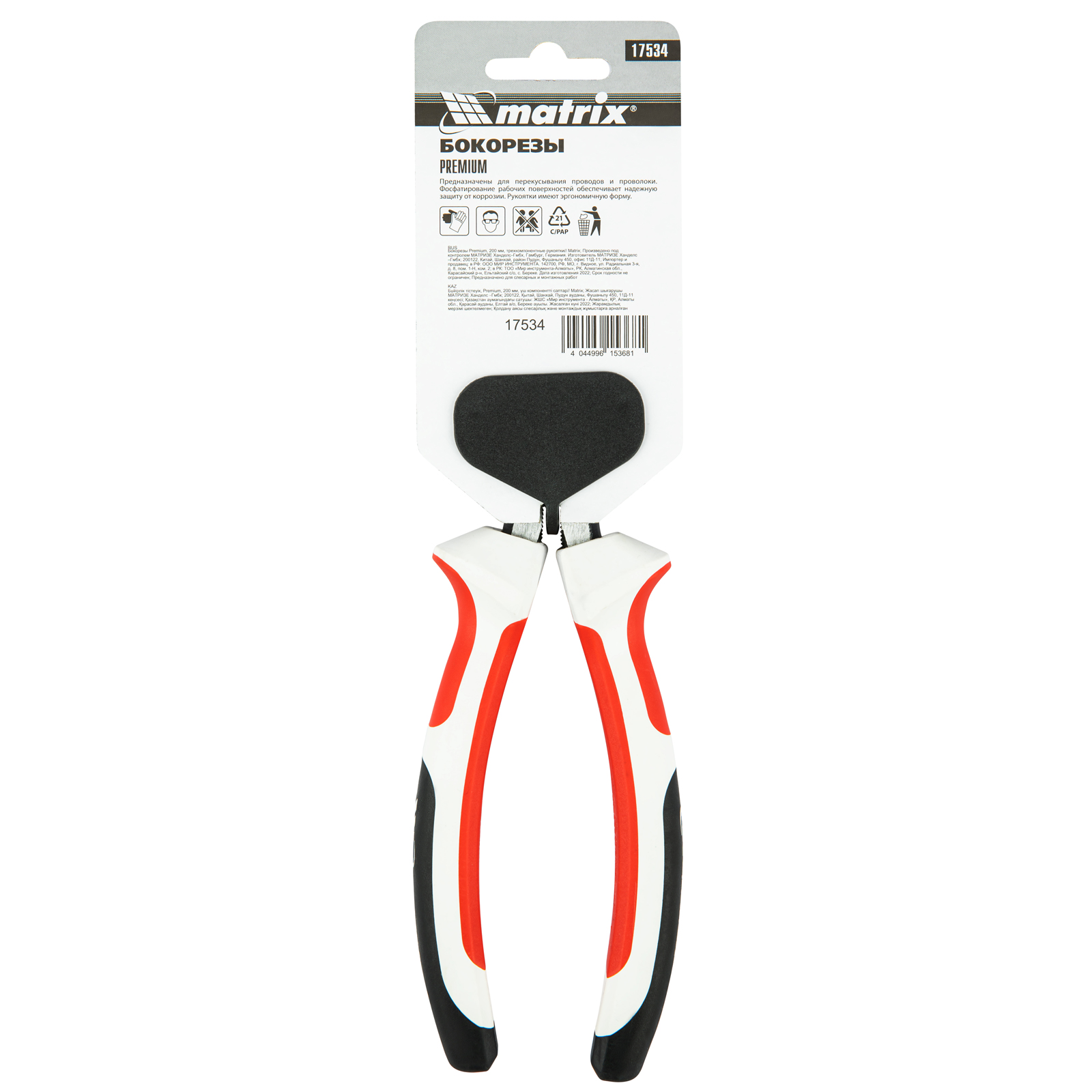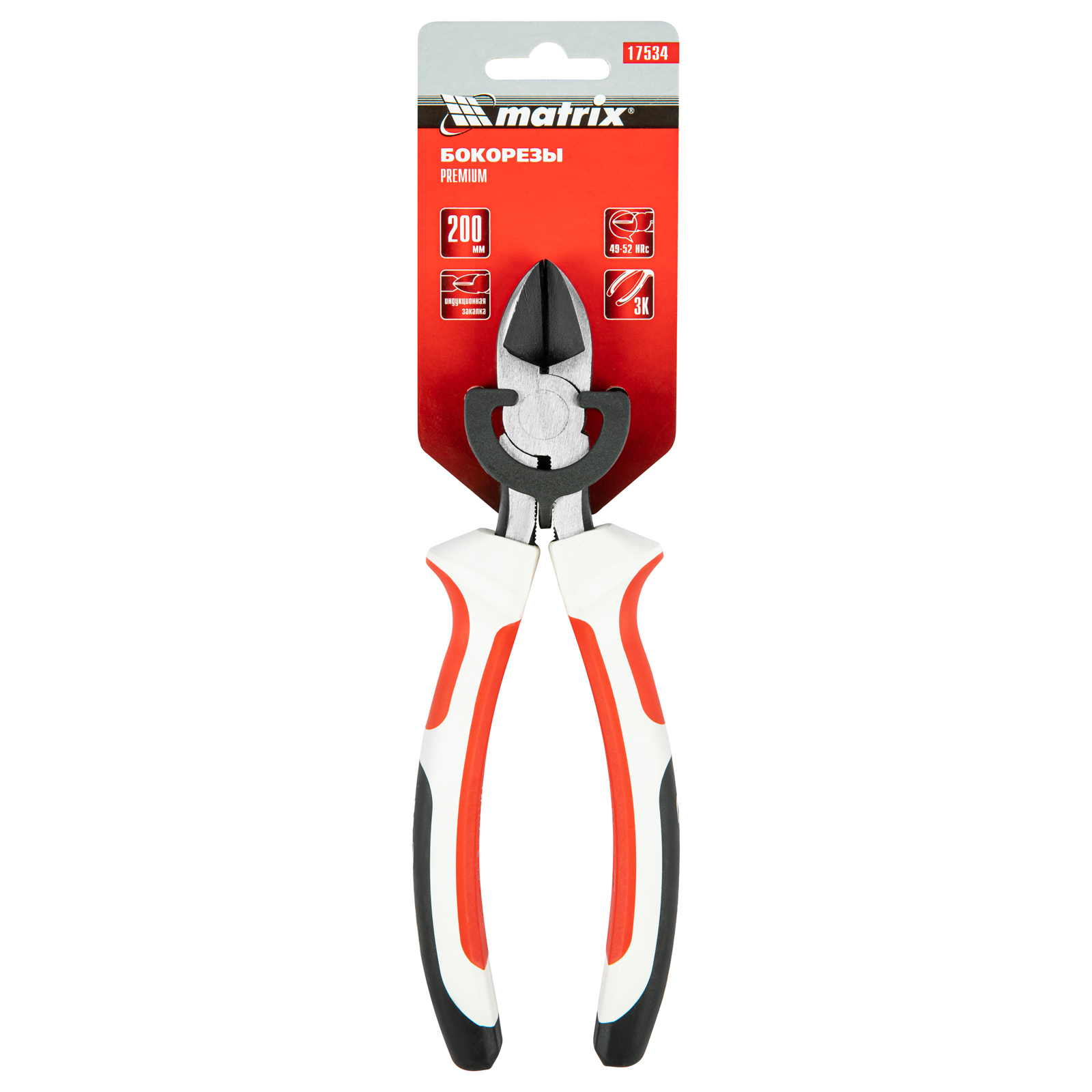 <p>Бокорезы Matrix Premium 17534 длиной 200 мм, с трехкомпонентными рукоятками, применяются для разрезания проволоки, кабелей и проводов во время слесарных и монтажных работ. Они подходят как частным, так и профессиональным мастерам и будут полезны в гараже, дома, на строительной площадке, в мастерской.</p><h2>Преимущества</h2><ul><li>Долговечность — рабочие части, прошедшие индукционную закалку токами высокой частоты, отличаются износостойкостью.</li><li>Прочность — режущие кромки твердостью 49-52 HRC устойчивы к механическим воздействиям и легко разрезают плотные материалы.</li><li>Безопасная эксплуатация — благодаря широким ограничительным упорам рука не соскальзывает к режущим элементам.</li><li>Комфортная работа — трехкомпонентные рукоятки обеспечивают надежный хват и не выскальзывают из ладони.</li></ul>