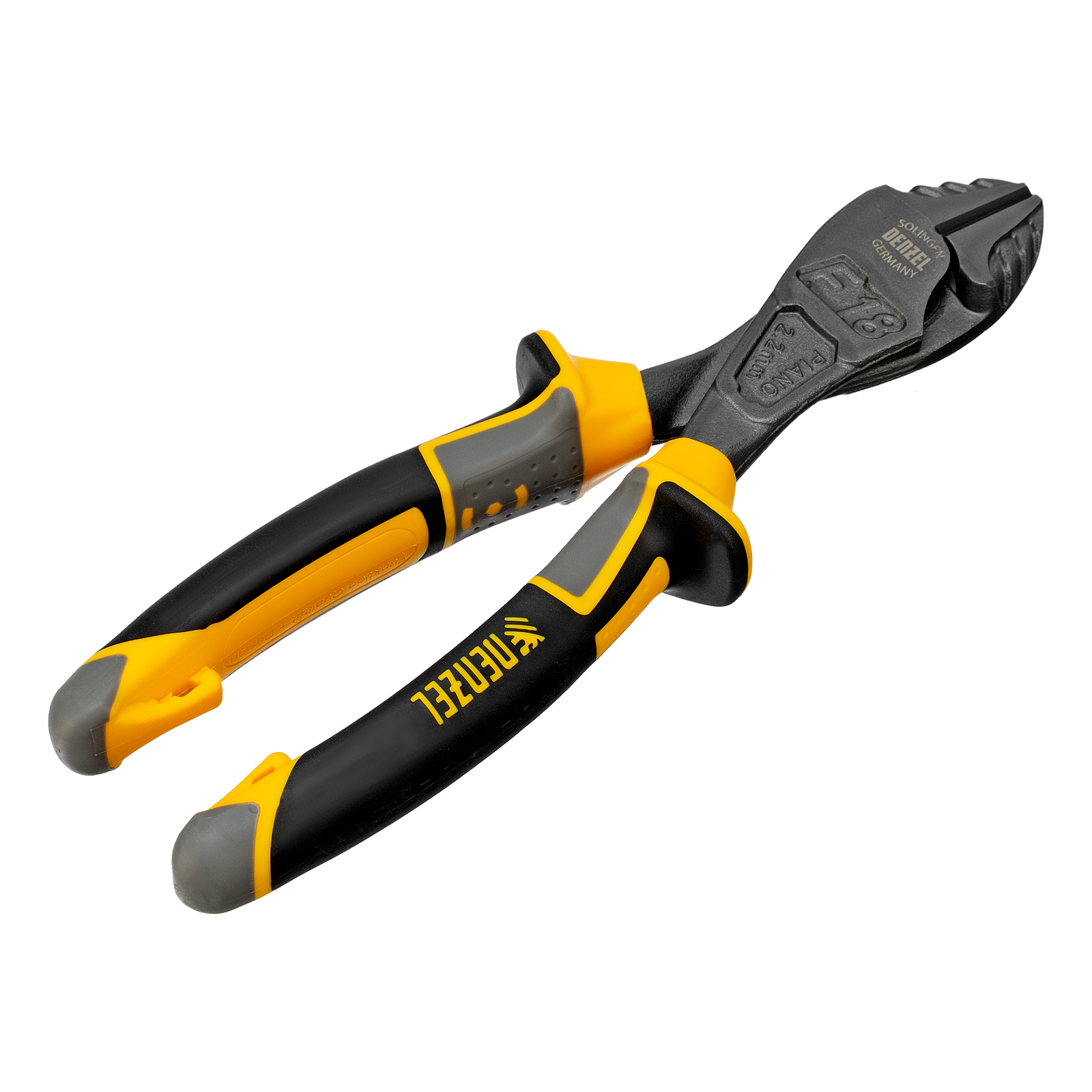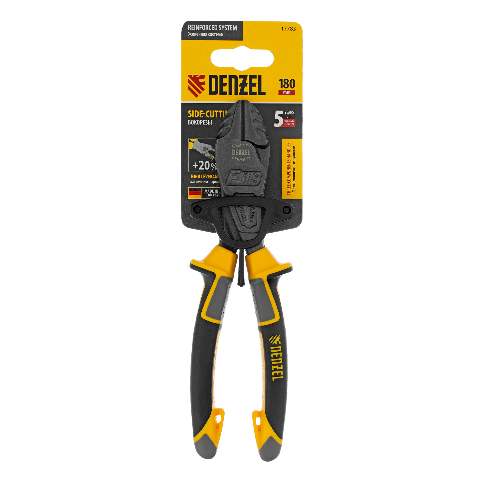 Усиленные бокорезы Denzel 17583 длиной 180 мм, с трехкомпонентными рукоятками, предназначены для разрезания кабелей, проводов, гвоздей и проволоки средней (750 Н/мм2) и высокой жесткости (1800 Н/мм2) диаметром 3,7 и 2,6 мм соответственно. Подходят для резки рояльных струн (предел прочности 2300 Н/мм2) диаметром до 2,2 мм. Успешно справляются не только с медными, алюминиевыми и пластмассовыми деталями, но и с более жесткими стальными элементами. Встроенный рычажный механизм и смещенный непосредственно к режущим кромкам шарнир увеличивают усилие реза на 20%.