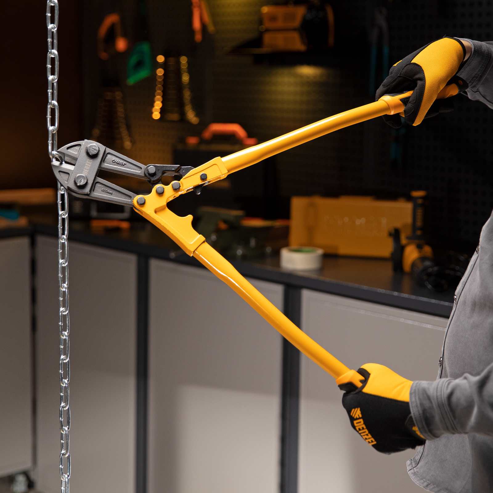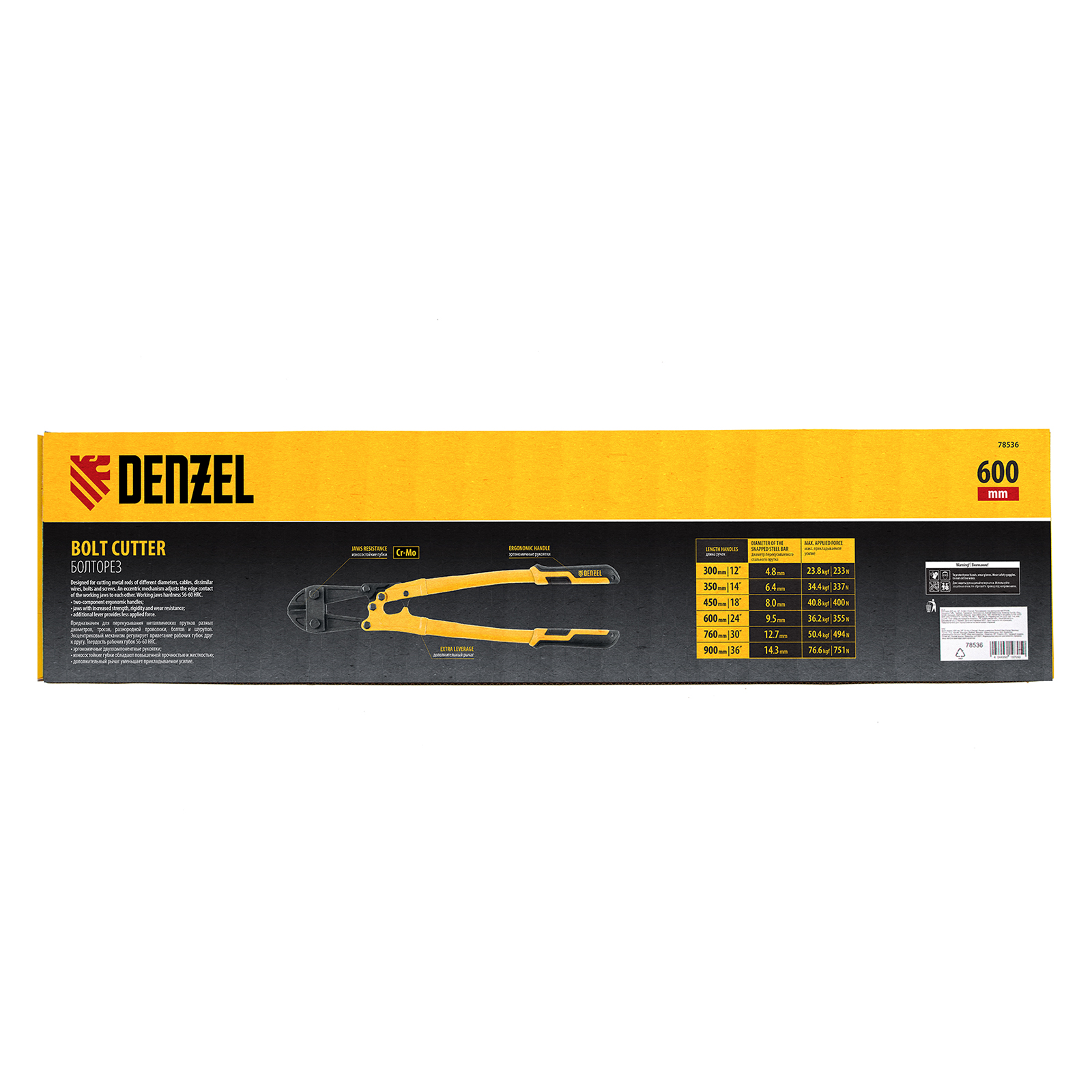 Болторез Denzel 78536 длиной 600 мм (24 дюймов), из стали Cr-Mo, предназначен для перекусывания стальных прутков диаметром 9,5 мм, болтов и шурупов, тросов, разнородной проволоки.