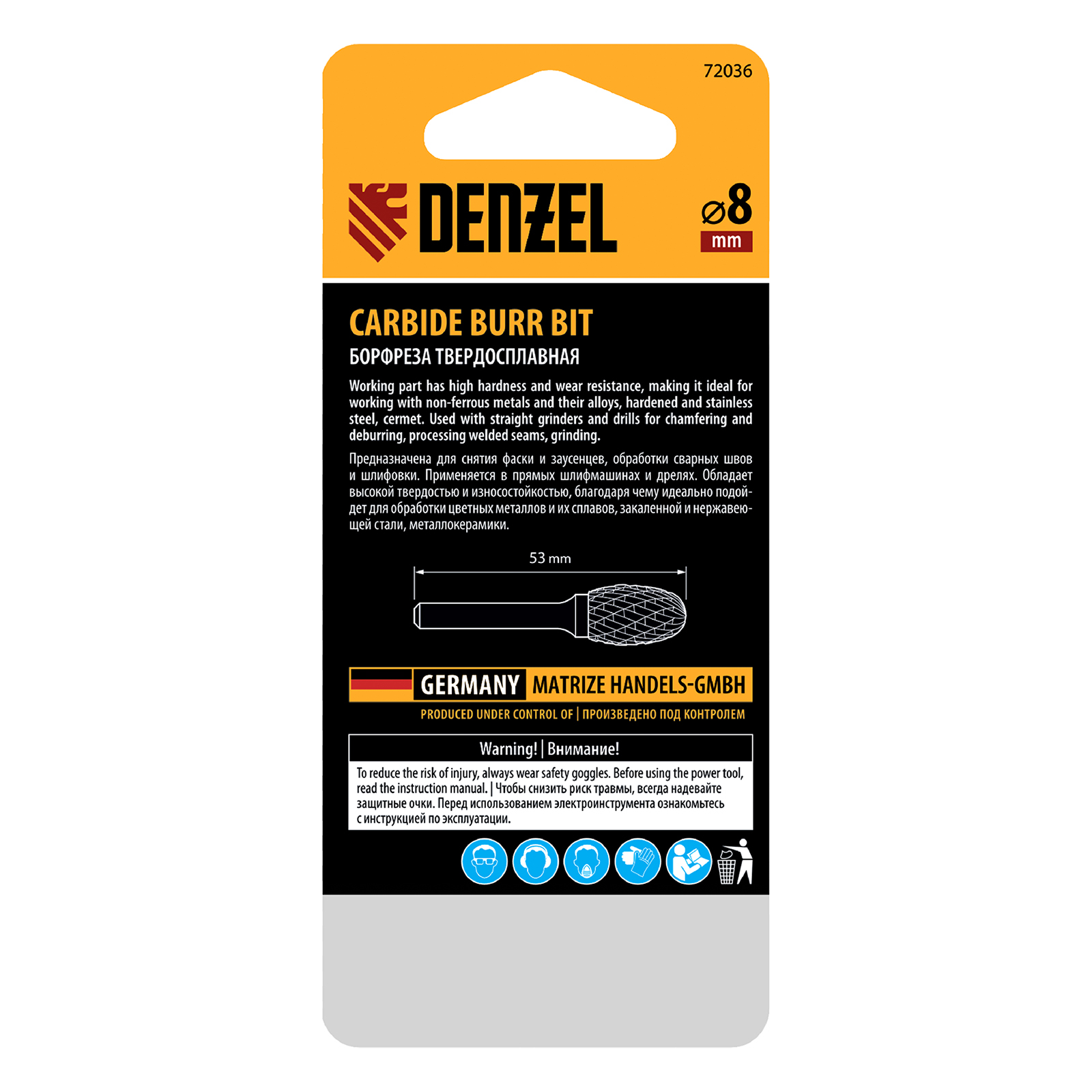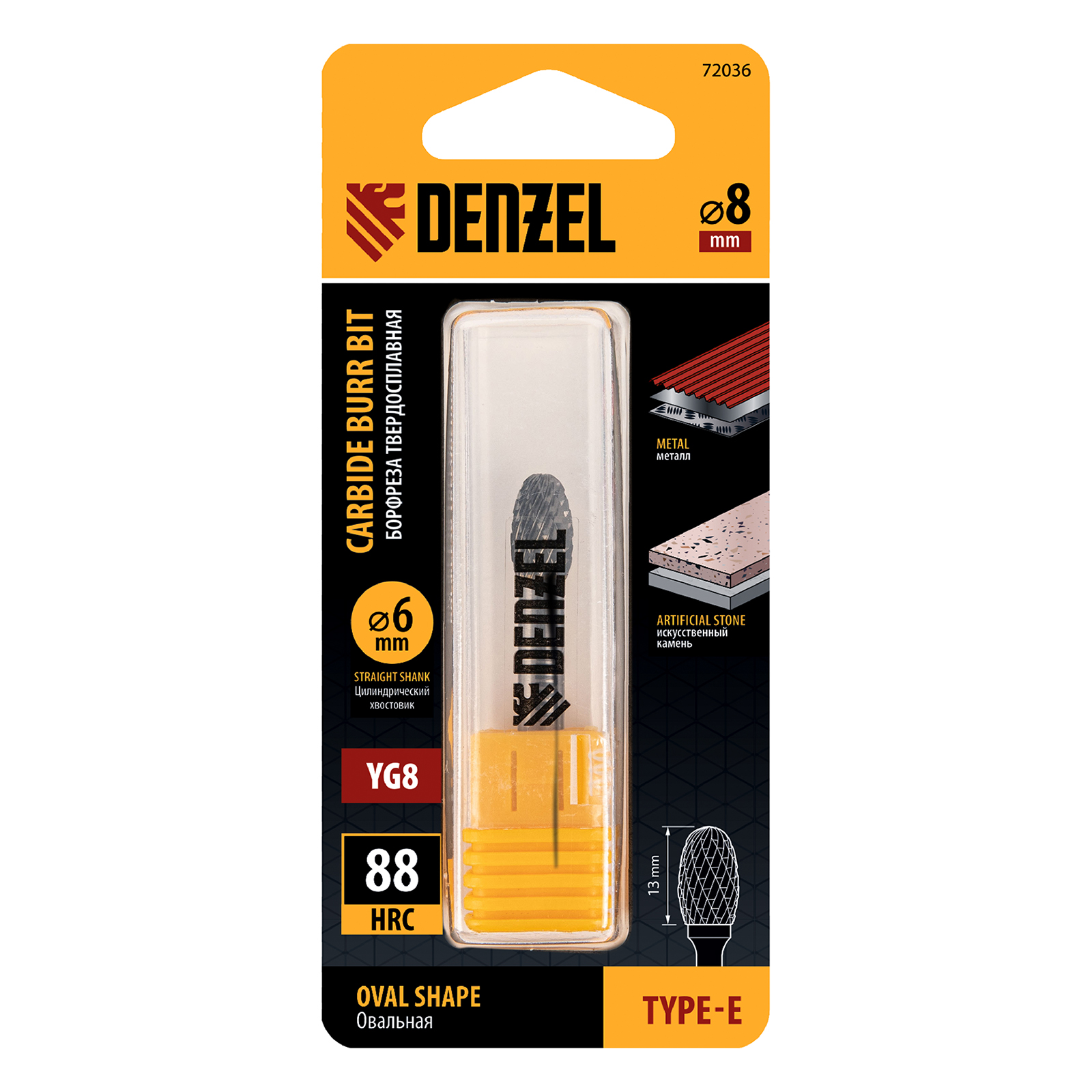 Твердосплавная борфреза по металлу Denzel 72036 с овальной режущей частью (тип E), диаметром 8 мм, предназначена для шлифовки стальных, бронзовых, медных, латунных, чугунных, титановых поверхностей. Также эффективна для обработки искусственного камня и металлокерамики. Овальная рабочая часть позволяет зачищать сварные швы, удалять заусенцы, снимать фаски, обрабатывать закругленные углы. С помощью борфрезы можно восстановить утратившую первоначальный вид гравировку. Режущая оснастка устанавливается на дрель или прямошлифовальную машину.