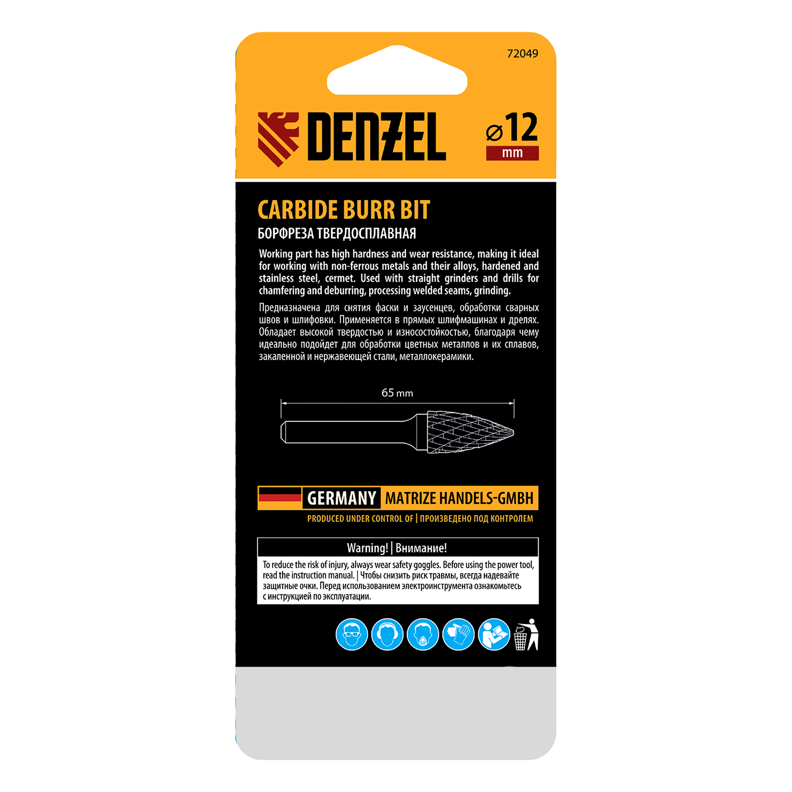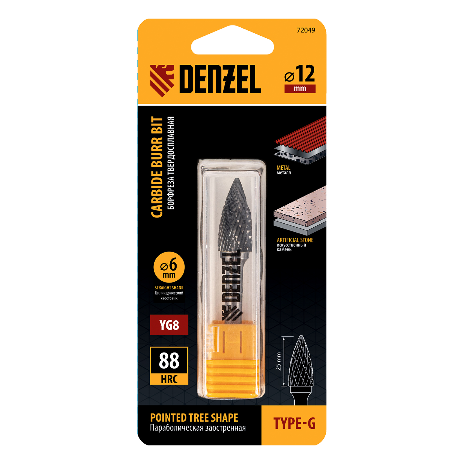Твердосплавная борфреза по металлу Denzel 72049 с параболической заостренной рабочей частью (тип G), диаметром 12 мм, — оснастка для дрели и прямошлифовальной машины. Предназначена для выполнения работ по закаленной и нержавеющей стали, чугуну, бронзе, меди, латуни, титану. Также позволяет обрабатывать искусственный камень и металлокерамику. Заостренная режущая часть оптимальна для шлифовки радиусных поверхностей сложной формы, удаления заусенцев в узких отверстиях, формирования точных углов.
