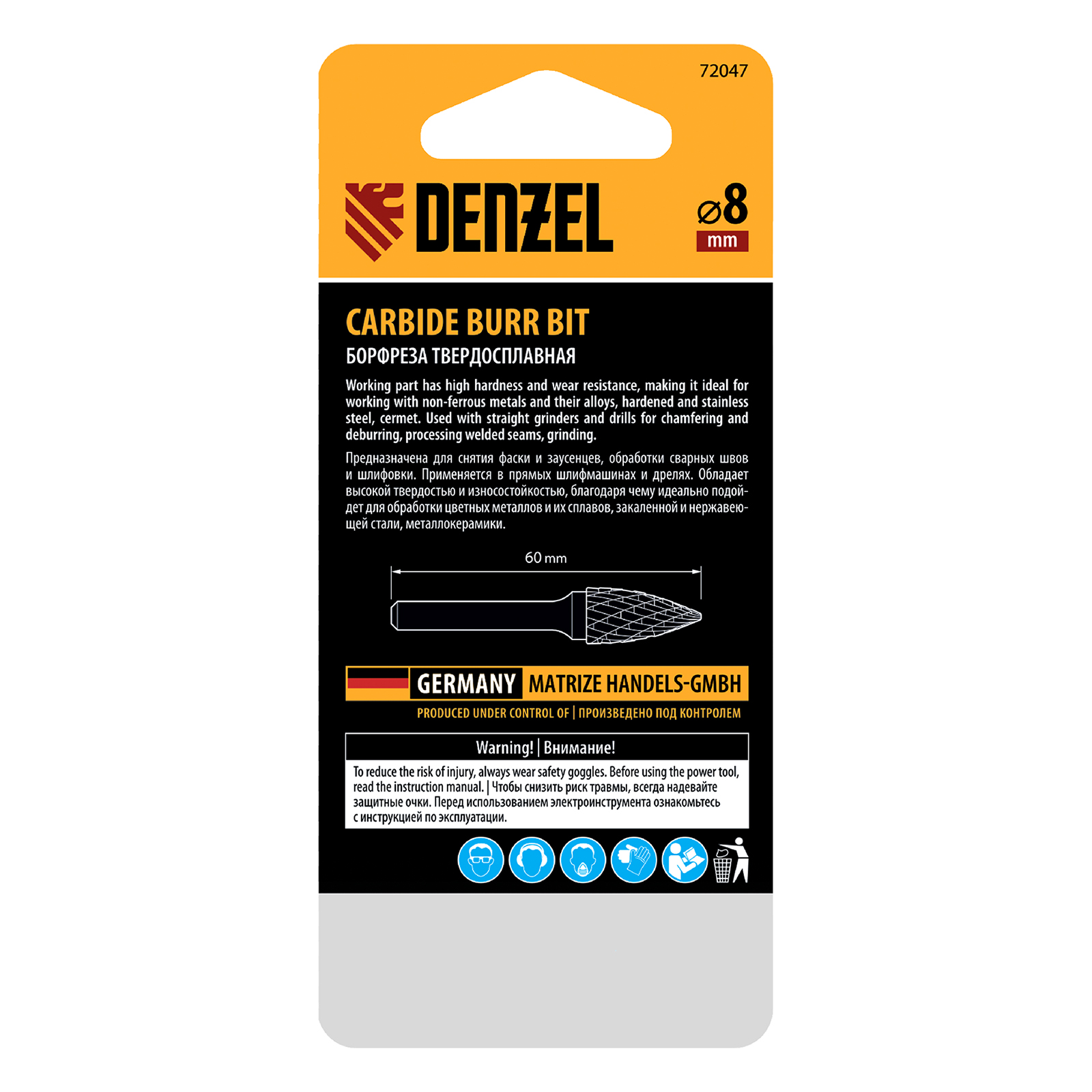 Твердосплавная борфреза по металлу Denzel 72047 с параболической заостренной рабочей частью (тип G), диаметром 8 мм, — оснастка для дрели и прямошлифовальной машины. Предназначена для выполнения работ по закаленной и нержавеющей стали, чугуну, бронзе, меди, латуни, титану. Также позволяет обрабатывать искусственный камень и металлокерамику. Заостренная режущая часть оптимальна для шлифовки радиусных поверхностей сложной формы, удаления заусенцев в узких отверстиях, формирования точных углов.