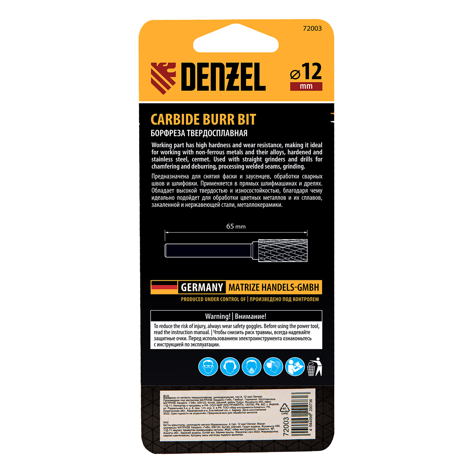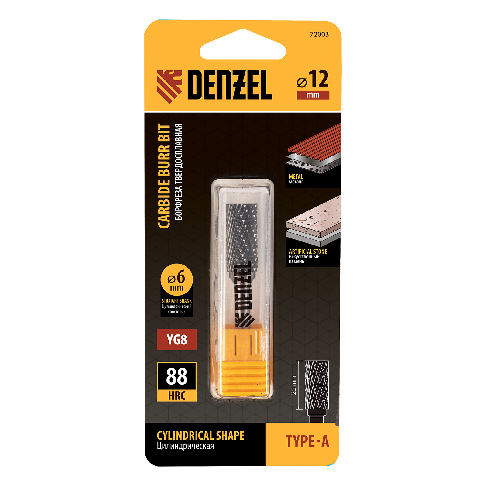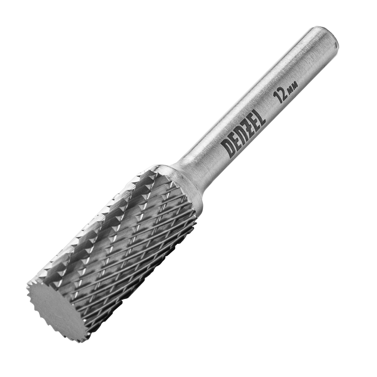 Твердосплавная борфреза Denzel 72003 с цилиндрической рабочей частью (тип A), диаметром 12 мм, используется для работ по металлу (закаленной и нержавеющей стали, латуни, меди, бронзе, чугуну, титану). Подходит также для обработки искусственного камня и металлокерамики. Предназначена для завершающей обработки и подгонки форм и поверхностей: шлифовки, зачистки сварных швов, удаления заусенцев, снятия фасок, разделки кромок. Оснастка устанавливается на прямошлифовальную машину или дрель.