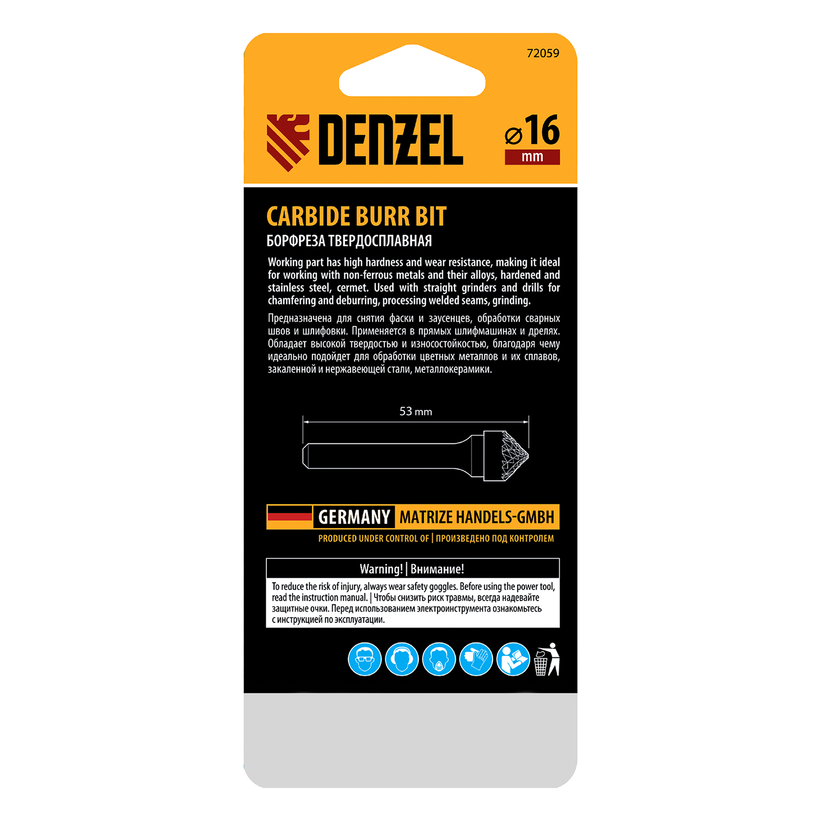 <p>Твердосплавная борфреза по металлу Denzel 72059 с рабочей частью-зенкером с вершиной 90° (тип K), диаметром 16 мм, устанавливается на дрель или прямошлифовальную машину. Используется для обработки закаленной и нержавеющей стали, латуни, бронзы, меди, чугуна, титана, а также металлокерамики и искусственного камня. Оптимальна для снятия фасок и заусенцев, обработки кромок, угловых пазов, краев отверстий.</p><h2>Преимущества</h2><ul><li>Эффективная работа с особо прочными материалами — рабочая часть изготовлена из сплава ВК8 твердостью 69-72 HRC.</li><li>Высокая производительность — специальные перекрестные насечки-стружколомы обеспечивают эффективное удаление продуктов обработки.</li><li>Универсальность — цилиндрический хвостовик диаметром 6 мм совместим с большинством патронов инструментов.</li><li>Удобное хранение и транспортировка — борфреза поставляется в практичном пластиковом кейсе.</li></ul>