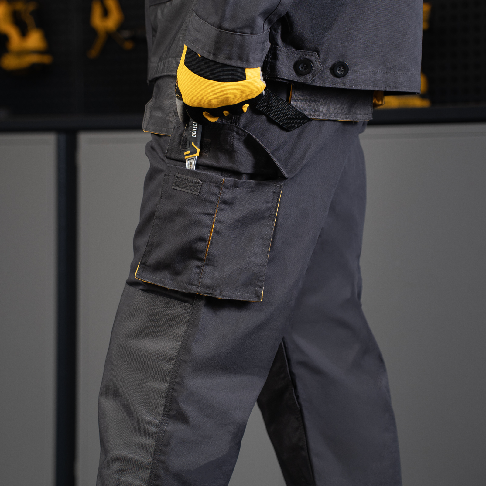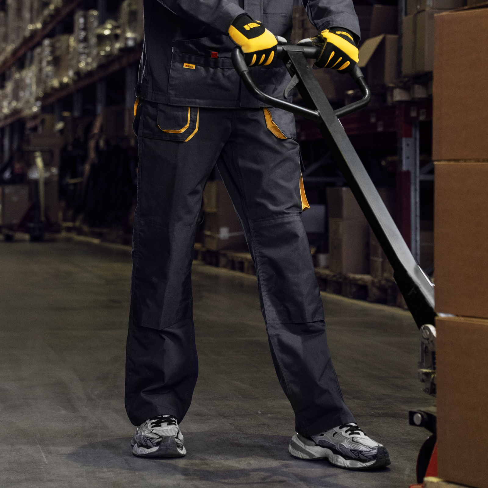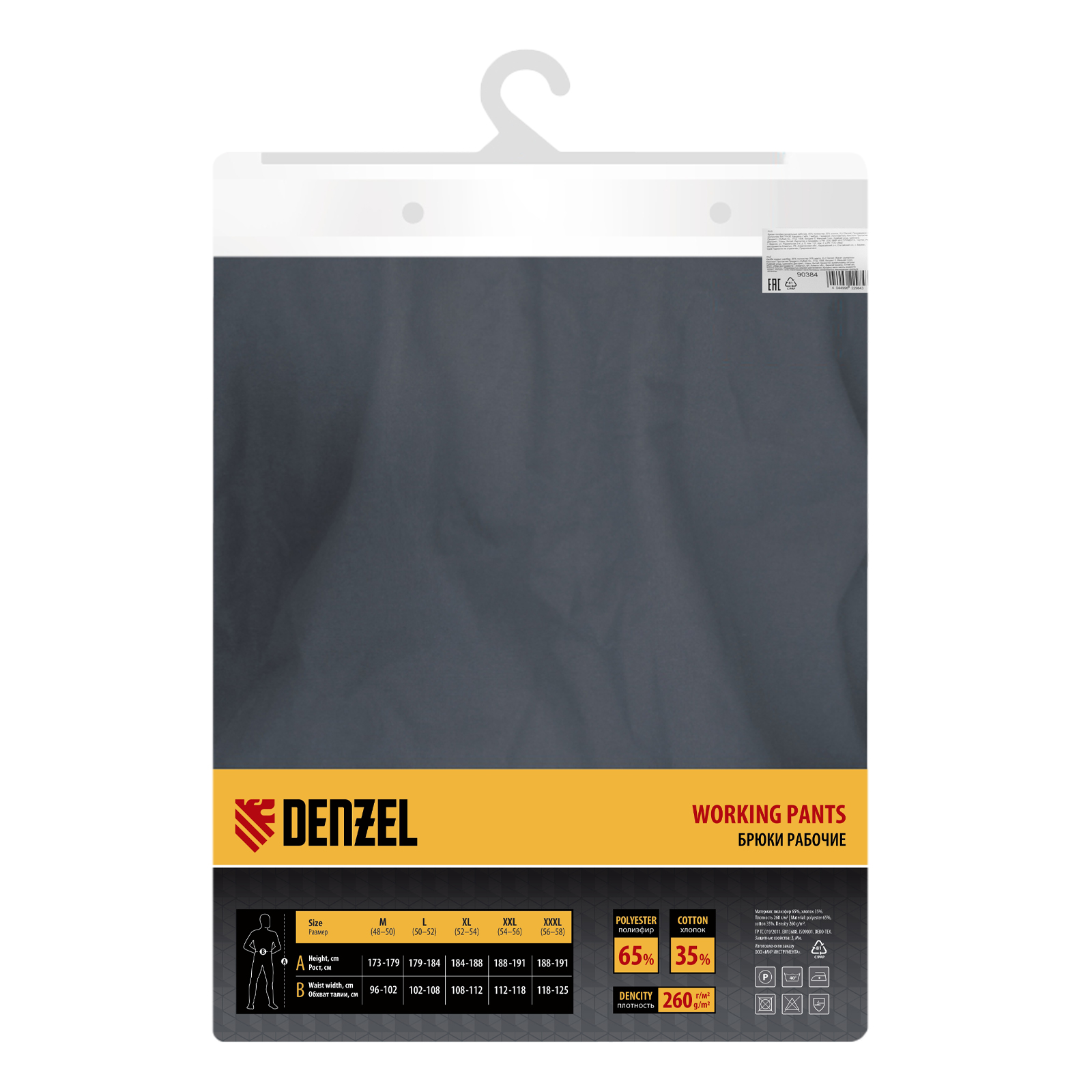 Рабочие брюки Denzel 90384 размера XL рассчитаны на рост 184-188 см и используются для выполнения профессиональных строительных, ремонтных, сантехнических и производственных работ в теплое время года или в отапливаемом помещении. Защищают пользователя от общих производственных загрязнений, нетоксичной пыли, ветра и незначительных механических воздействий. Изготовлены из ткани плотностью 260 г/м² (65% полиэфир, 35% хлопок). За счет наличия хлопковых волокон в составе ткань хорошо пропускает воздух и приятна на теле, полиэфир обеспечивает устойчивость к истиранию. Брюки выполнены в практичном темно-сером цвете.