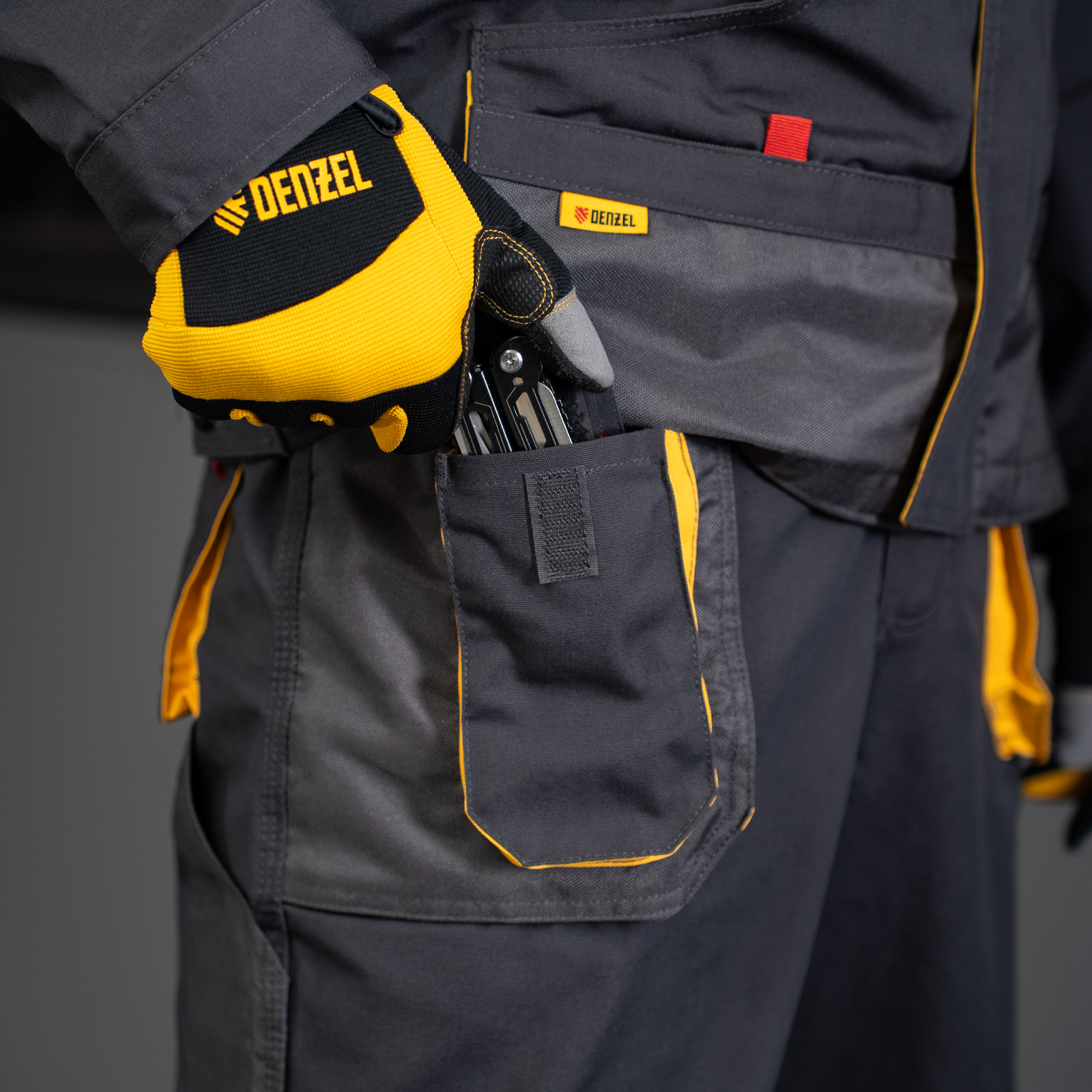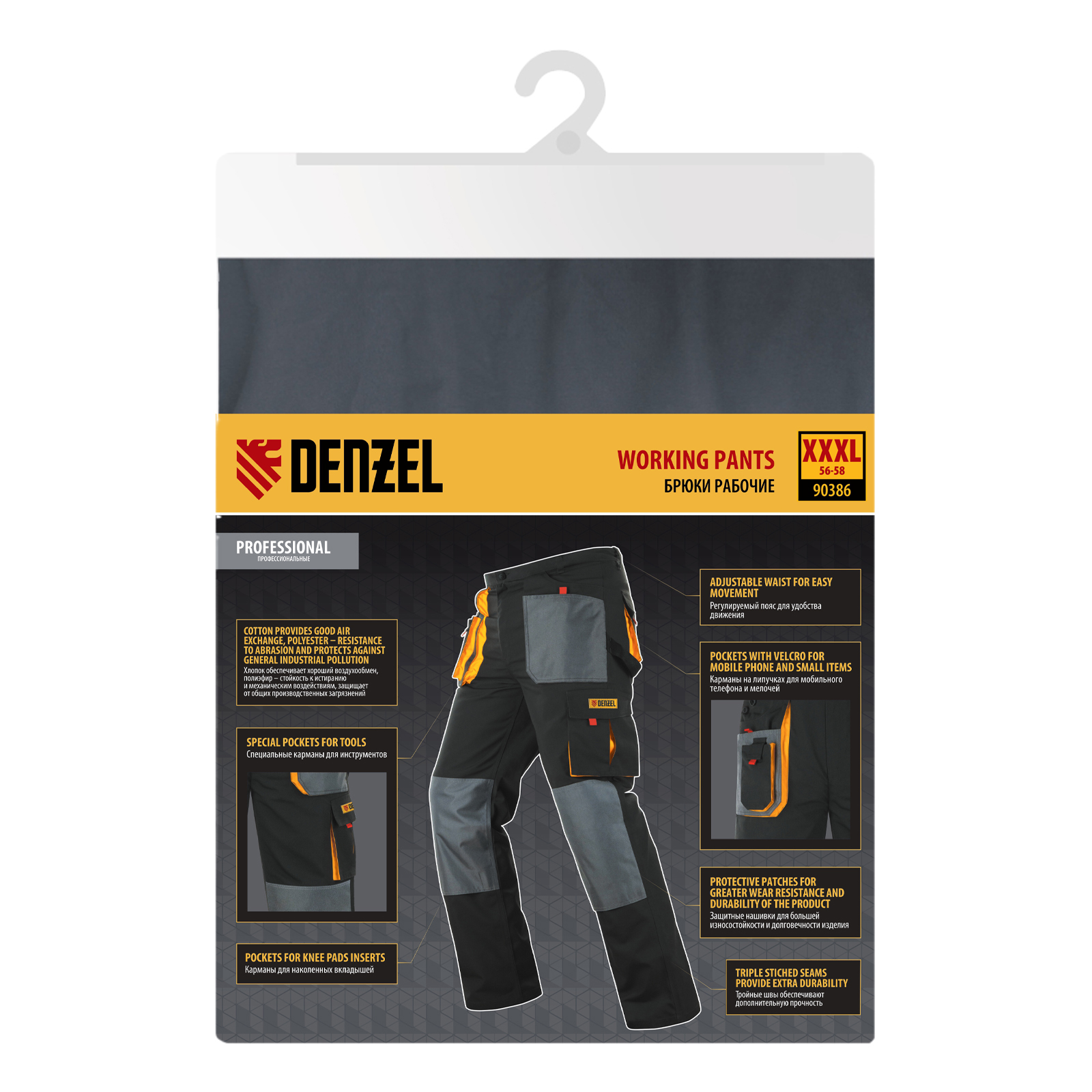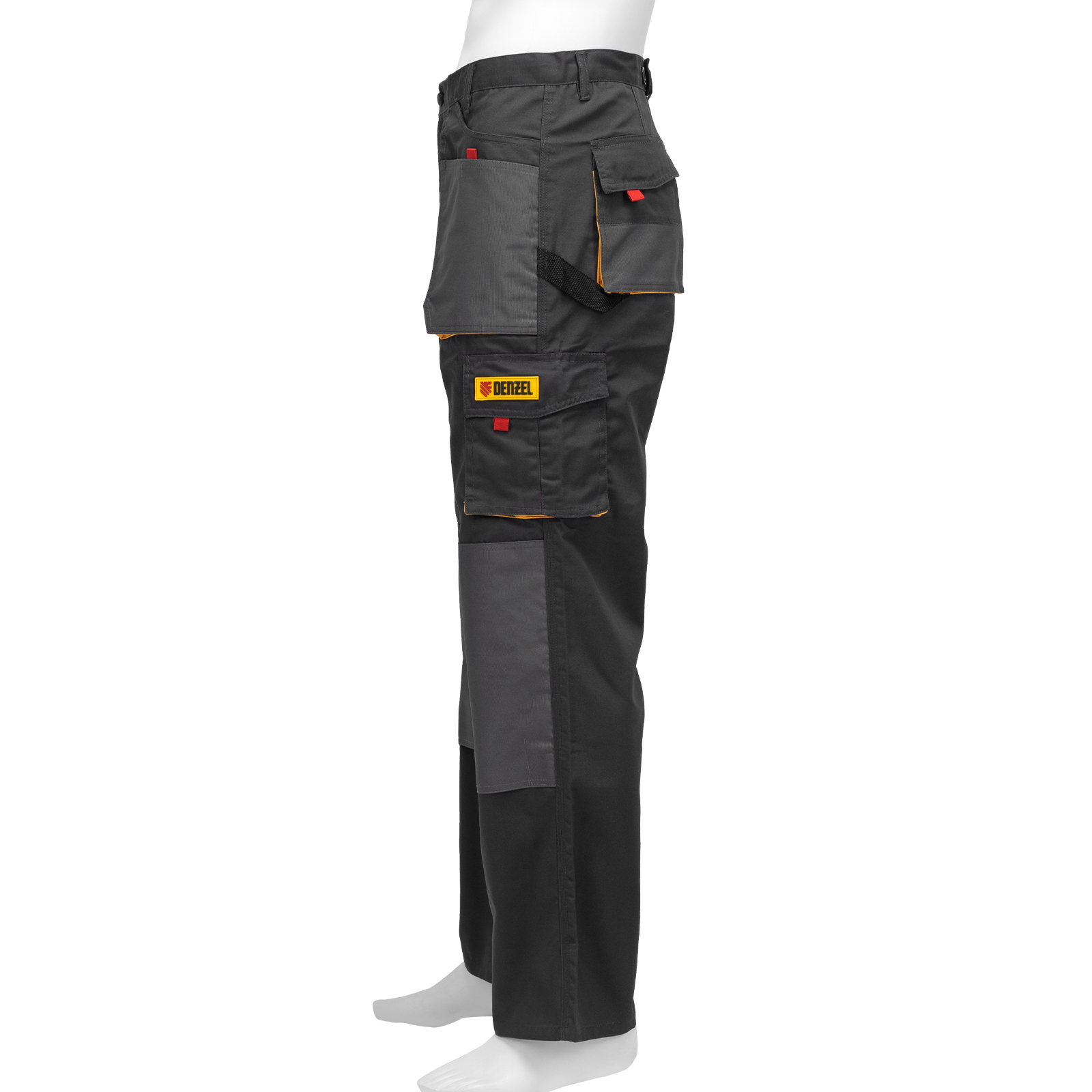 Рабочие брюки Denzel 90386 размера XXXL рассчитаны на рост 188-191 см и используются для выполнения профессиональных строительных, ремонтных, сантехнических и производственных работ в теплое время года или в отапливаемом помещении. Защищают пользователя от общих производственных загрязнений, нетоксичной пыли, ветра и незначительных механических воздействий. Изготовлены из ткани плотностью 260 г/м² (65% полиэфир, 35% хлопок). За счет наличия хлопковых волокон в составе ткань хорошо пропускает воздух и приятна на теле, полиэфир обеспечивает устойчивость к истиранию. Брюки выполнены в практичном темно-сером цвете.