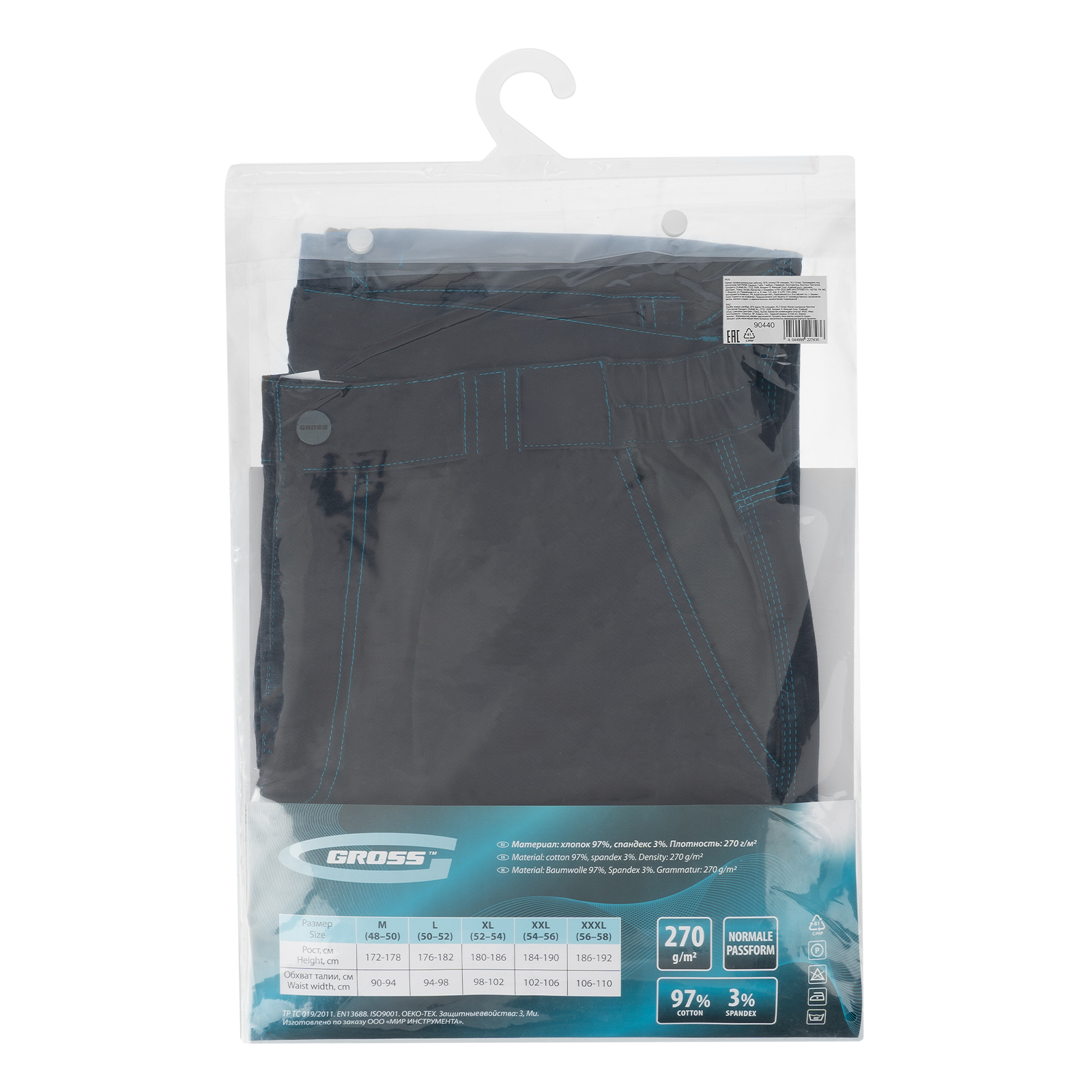Профессиональные рабочие брюки Gross 90440 размера XXL рассчитаны на рост 184-190 см. Защищают пользователя от общих производственных загрязнений, нетоксичной пыли, ветра и незначительных механических воздействий. Подойдут для выполнения различных видов работ в теплое время года или в отапливаемом помещении. Выполнены в практичном темно-сером цвете из ткани с 97-процентным содержанием хлопка и 3-процентным содержанием спандекса. За счет наличия хлопковых волокон в составе ткань прекрасно пропускает воздух и приятна на теле, а спандекс делает ее более эластичной, поэтому в брюках удобно работать.