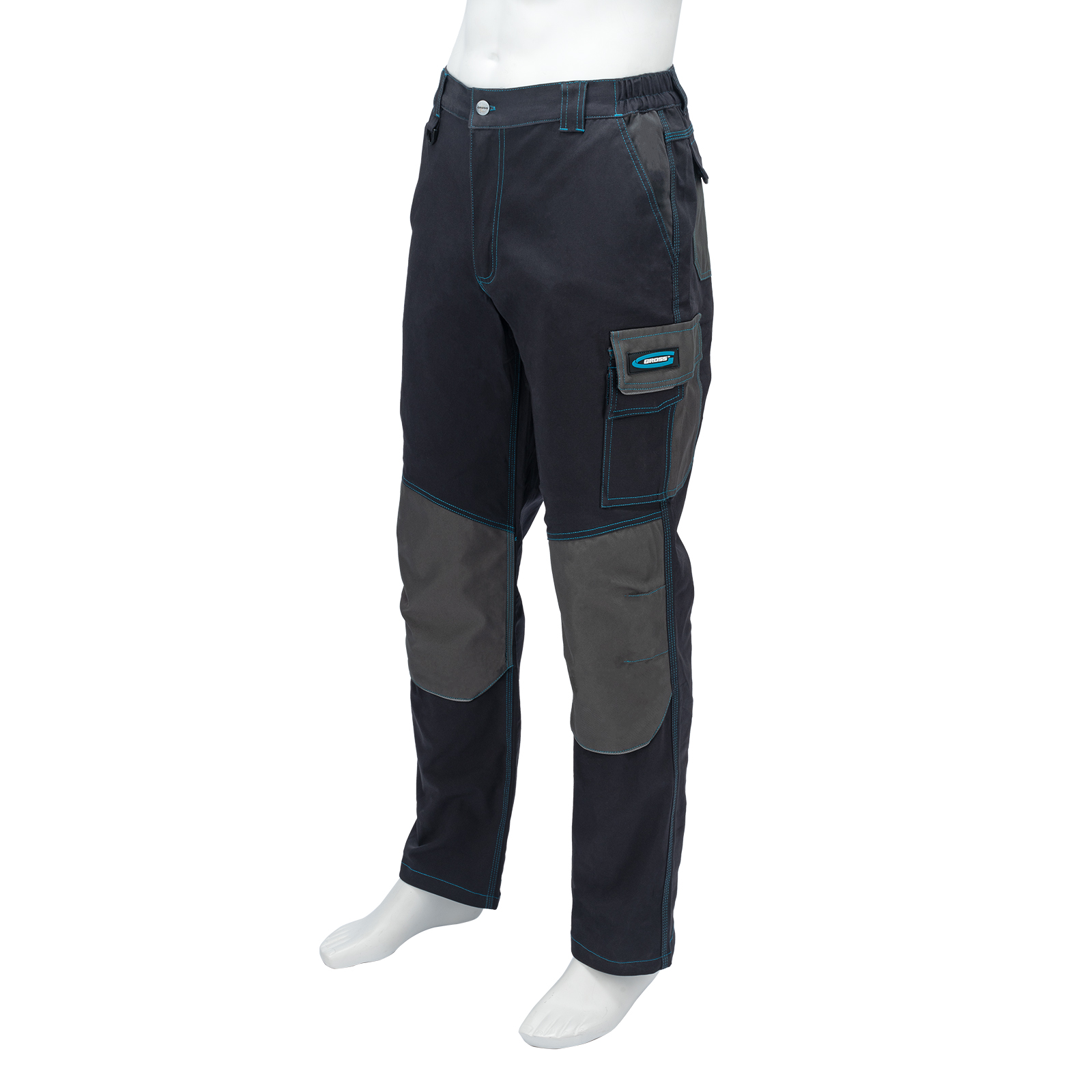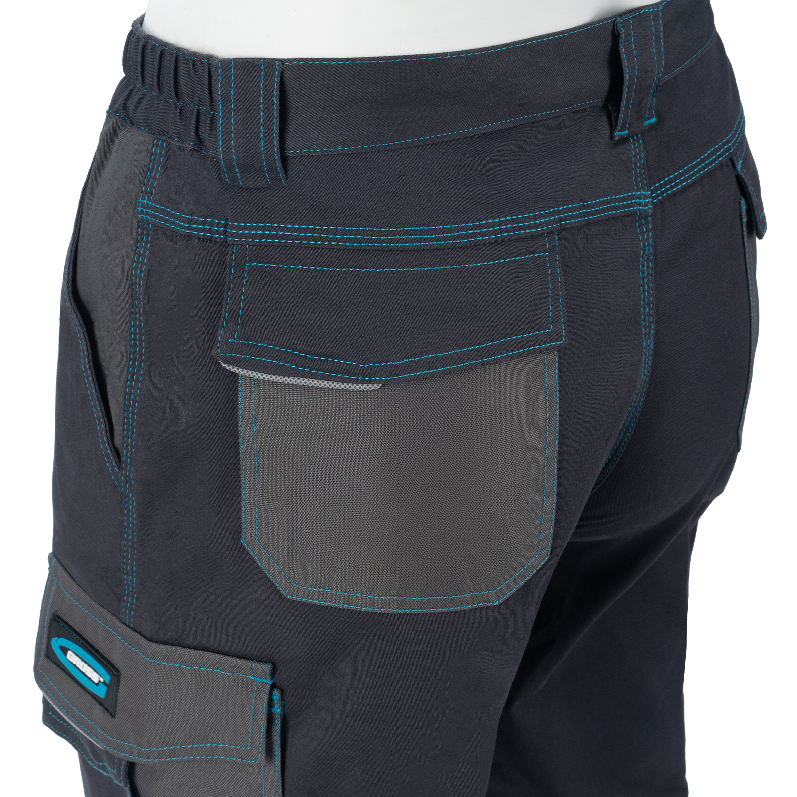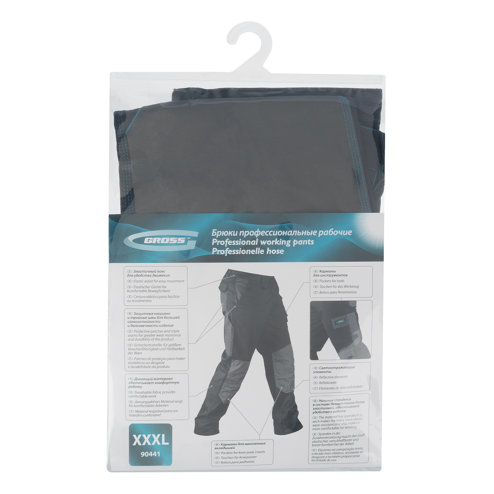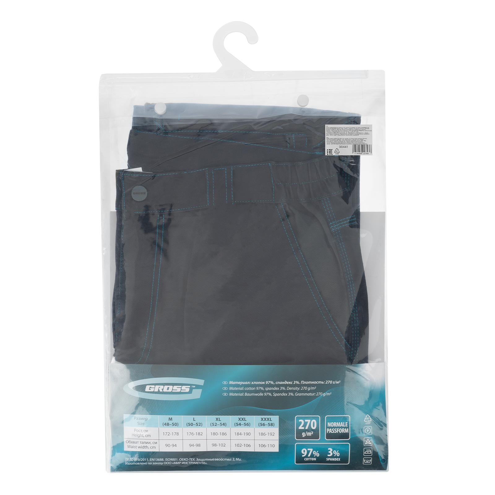 Профессиональные рабочие брюки Gross 90441 размера XXXL рассчитаны на рост 186-192 см. Защищают пользователя от общих производственных загрязнений, нетоксичной пыли, ветра и незначительных механических воздействий. Подойдут для выполнения различных видов работ в теплое время года или в отапливаемом помещении. Выполнены в практичном темно-сером цвете из ткани с 97-процентным содержанием хлопка и 3-процентным содержанием спандекса. За счет наличия хлопковых волокон в составе ткань прекрасно пропускает воздух и приятна на теле, а спандекс делает ее более эластичной, поэтому в брюках удобно работать.