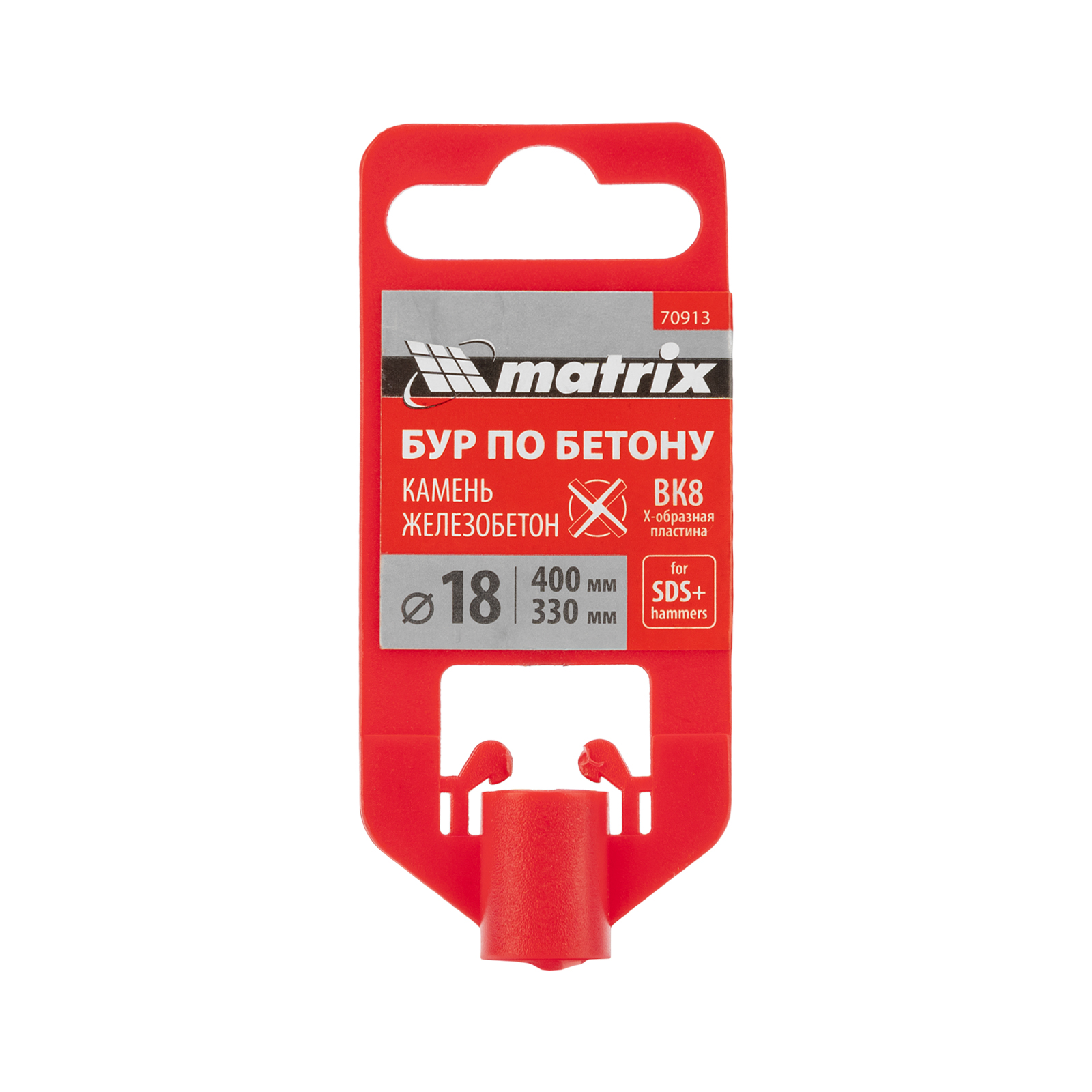Бур по бетону Matrix 70913 длиной 400 мм, с хвостовиком SDS-plus и крестовой пластиной, предназначен для получения отверстий диаметром 18 мм в бетоне, камне и кирпиче. Крестовая пластина обеспечивает эффективную работу с твердыми материалами, в том числе армированным бетоном. Бур устанавливается в патрон перфоратора и используется во время проведения строительных работ.