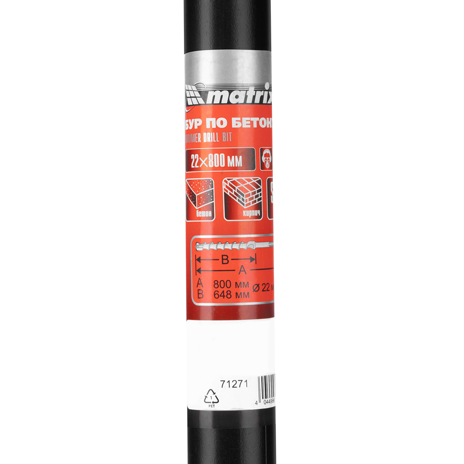 Бур по бетону Matrix 71271 размером 22 х 800 мм используется в качестве оснастки на тяжелых перфораторах с хвостовиком SDS MAX. Подходит для сверления глубоких отверстий в кирпиче и особо прочных материалах: армированном бетоне, природном и искусственном камне.
