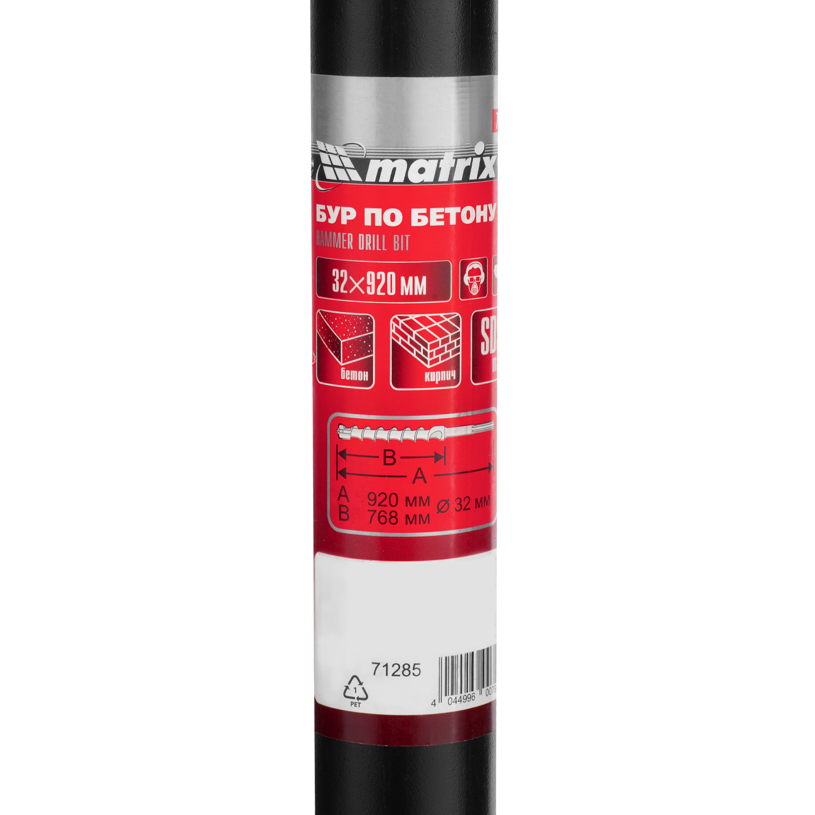 Бур по бетону Matrix 71285 размером 32 х 920 мм используется в качестве оснастки на тяжелых перфораторах с хвостовиком SDS MAX. Подходит для сверления глубоких отверстий в кирпиче и особо прочных материалах: армированном бетоне, природном и искусственном камне.