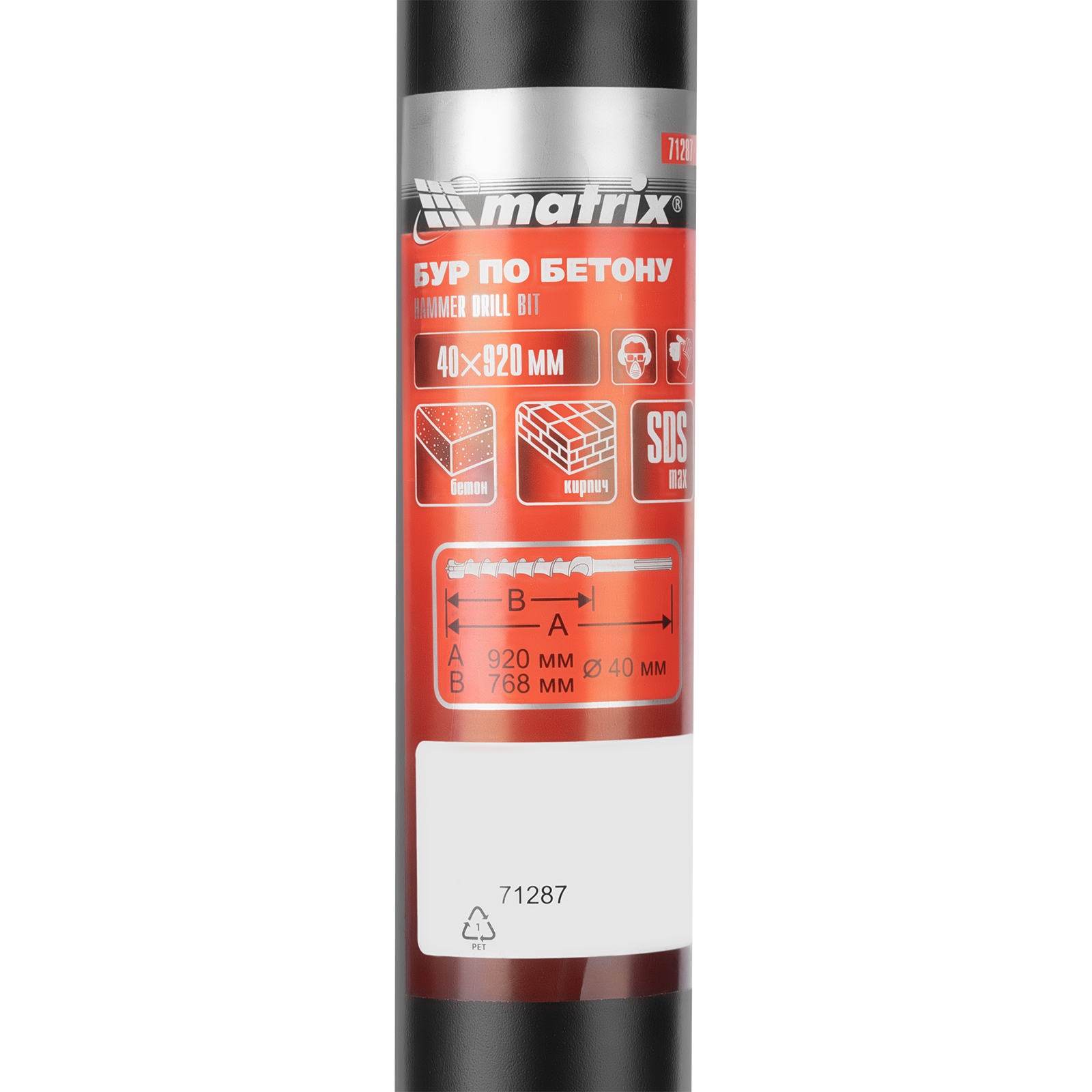 Бур по бетону Matrix 71287 размером 40 х 920 мм используется в качестве оснастки на тяжелых перфораторах с хвостовиком SDS MAX. Подходит для сверления глубоких отверстий в кирпиче и особо прочных материалах: армированном бетоне, природном и искусственном камне.