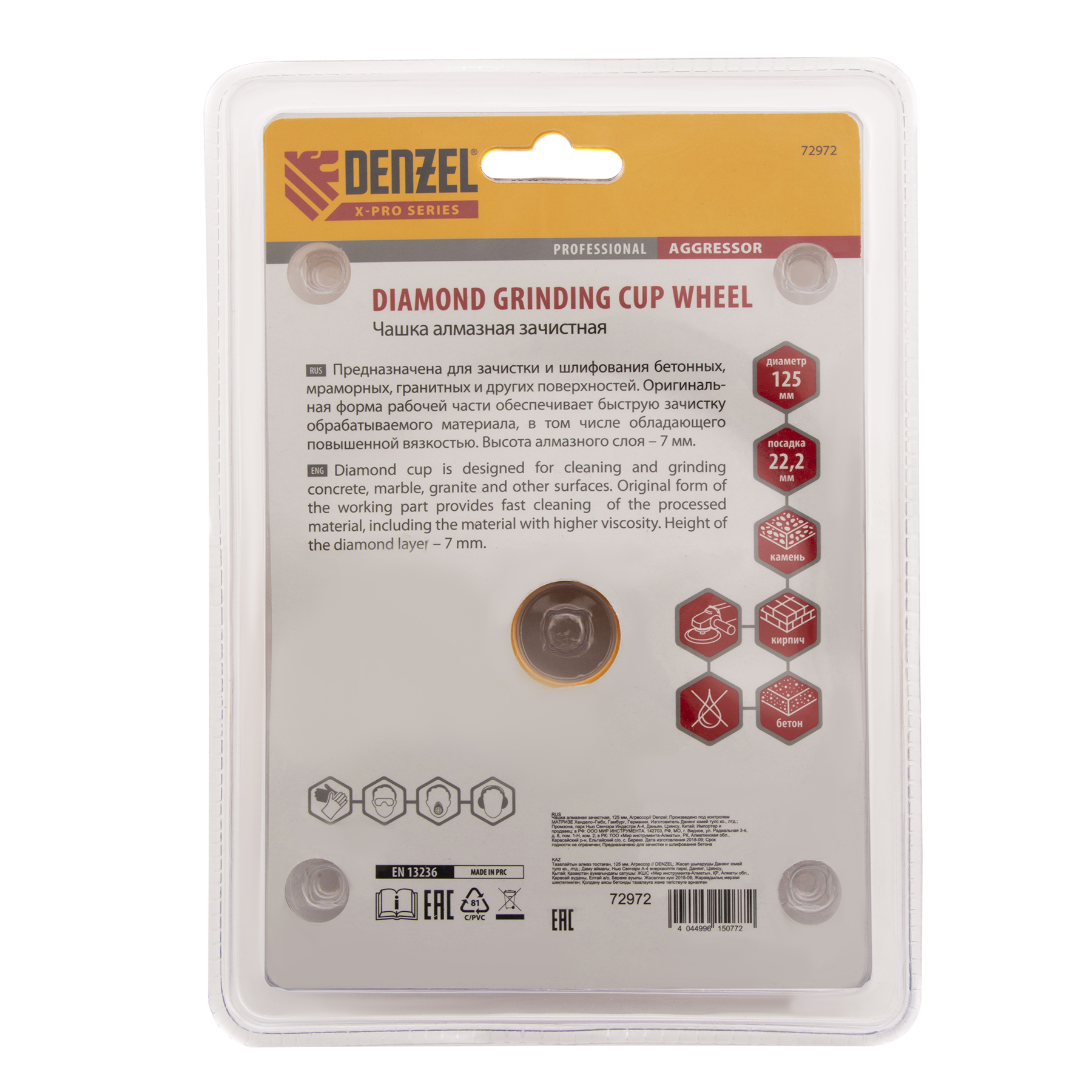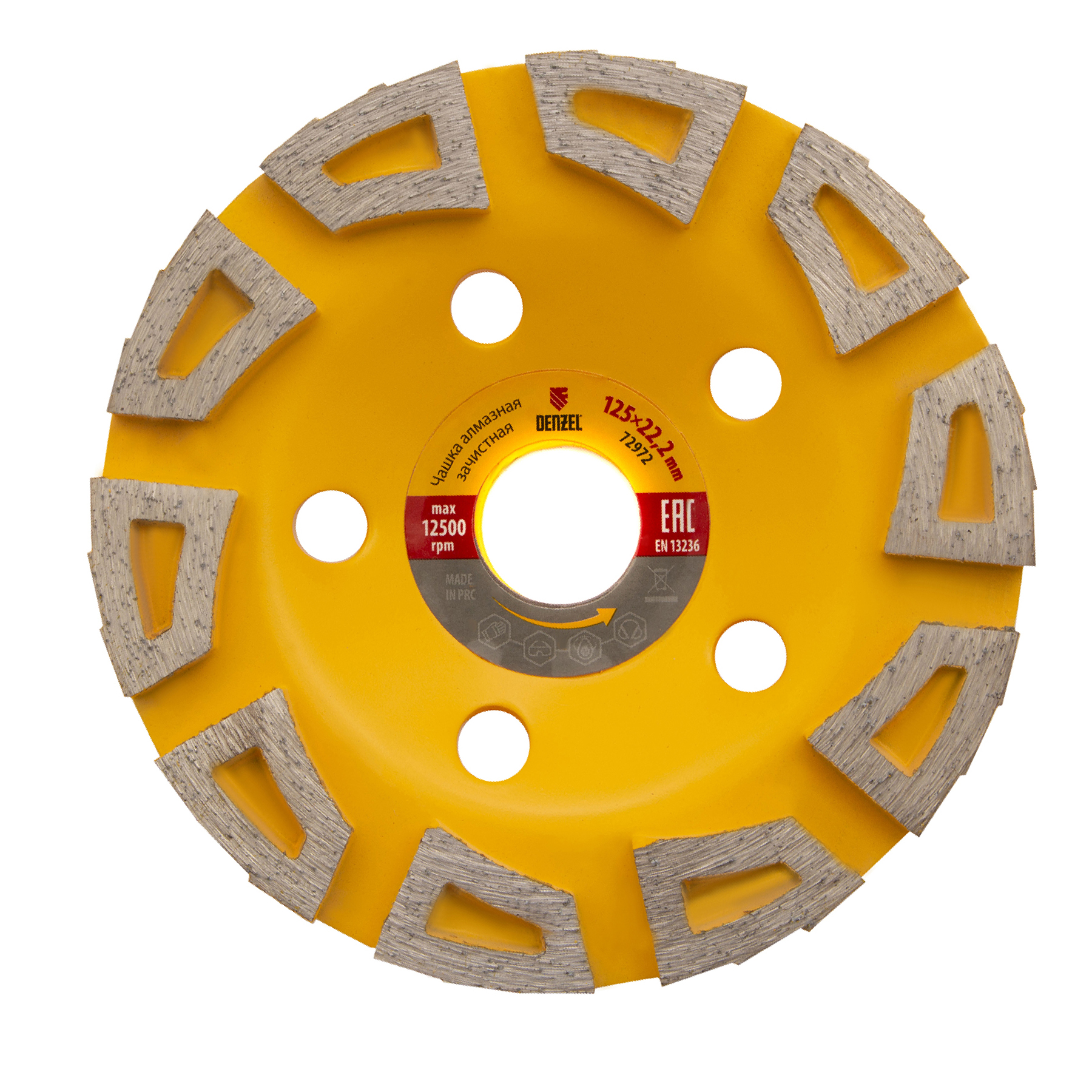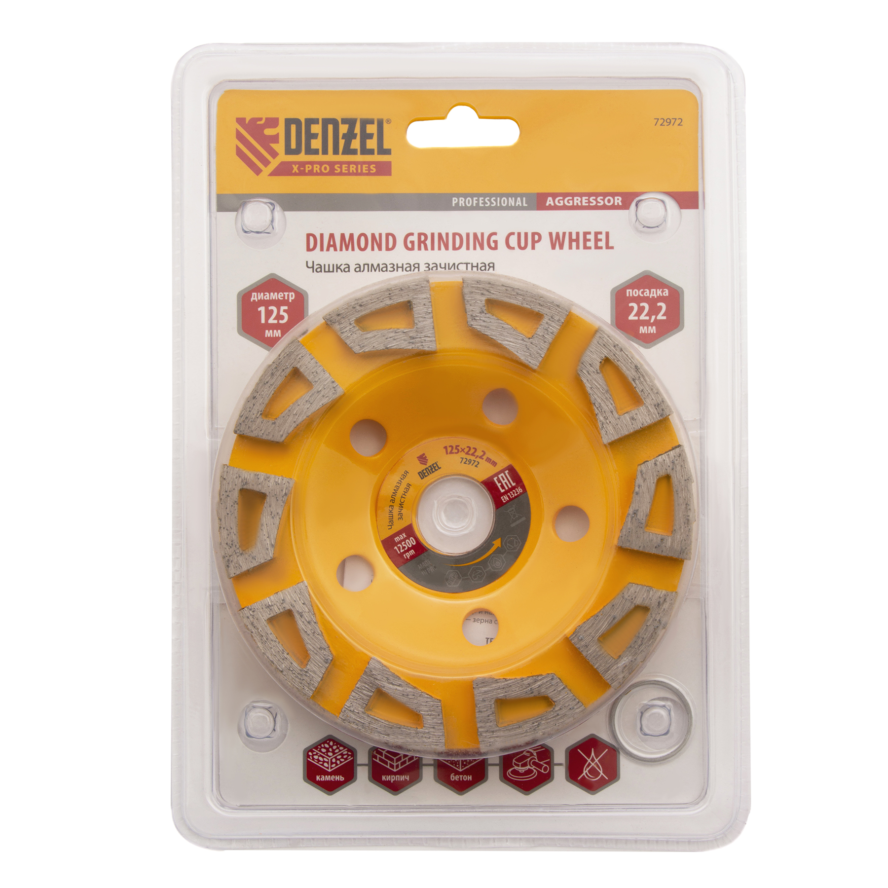 Алмазная зачистная чашка Denzel «Агрессор» 72972 диаметром 125 мм, с посадочным отверстием 22,2 мм, используется с углошлифовальными машинами, работающими с оснастками соответствующего размера. Применяется как для грубого, так и для чистового шлифования бетона, каменных, мраморных и гранитных плит, а также кирпичной кладки. Зачищает швы и стыки, удаляет наплывы (за несколько проходов) и мелкие неровности. Благодаря высокой плотности алмазов и сбалансированной связке эффективна при обработке твердых материалов. Насадка подходит для выполнения большого объема работ.