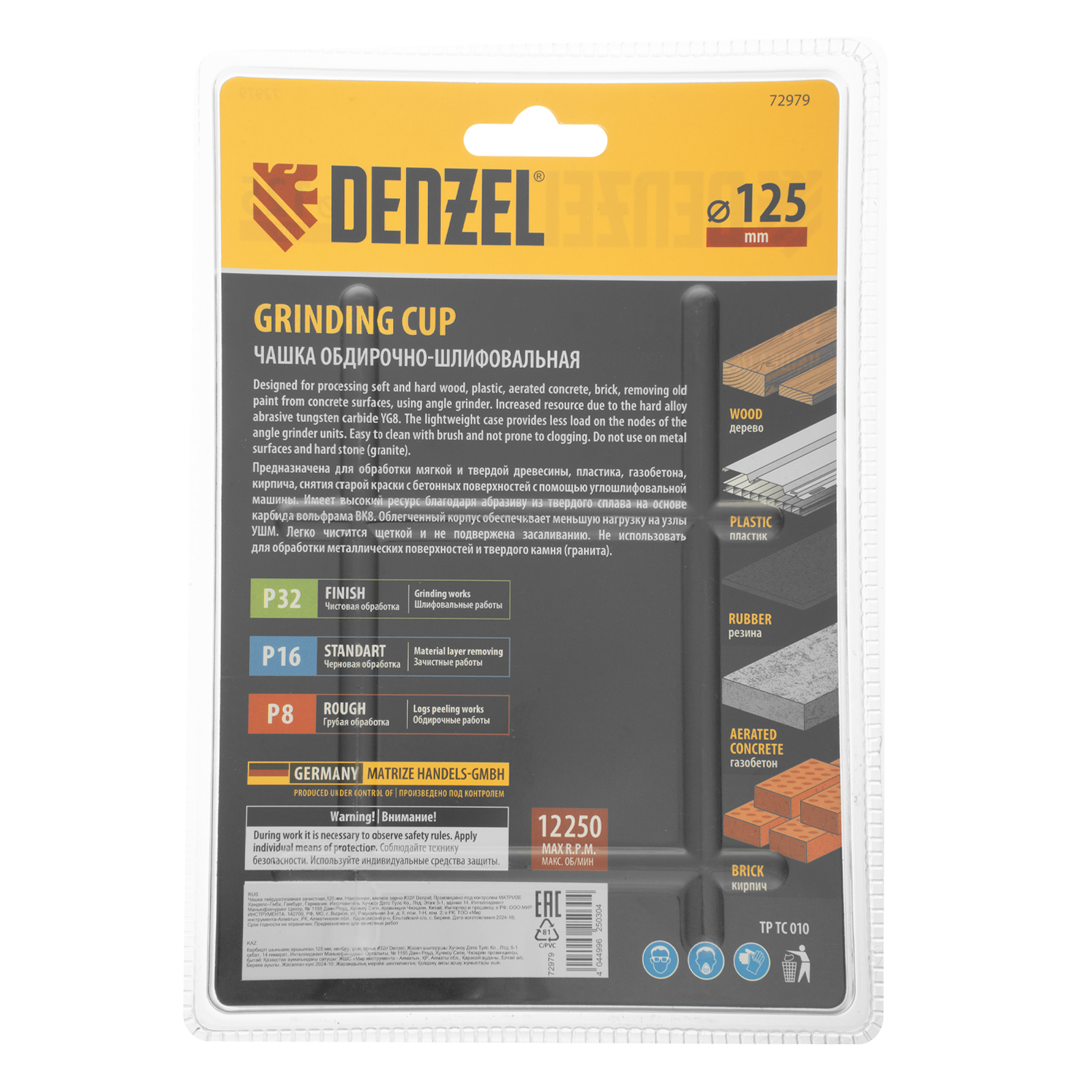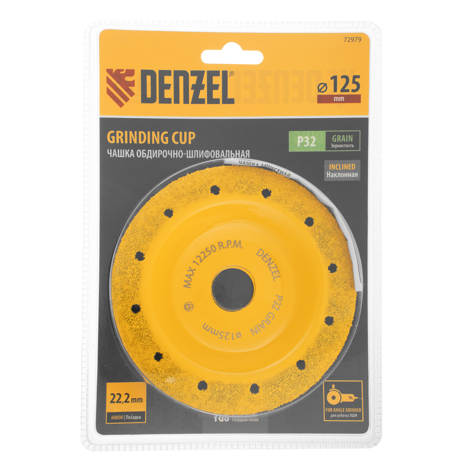 Твердосплавная зачистная чашка Denzel 72979 диаметром 125 мм, с наклонной рабочей частью и мелким зерном P32, используется для проведения шлифовальных работ при помощи углошлифовальной машины (УШМ). Мелкозернистый абразив оптимален для чистовой обработки твердой и мягкой древесины, кирпича, пластика, резины, газобетона. С помощью чашки можно устранить мелкие неровности, остатки старого покрытия, подготовить поверхности к дальнейшей отделке. Режущие частицы из твердого сплава ВК8 не образуют абразивную пыль, что снижает вредное воздействие на здоровье пользователя. Оснастка пригодится при проведении строительных, ремонтных и отделочных работ.