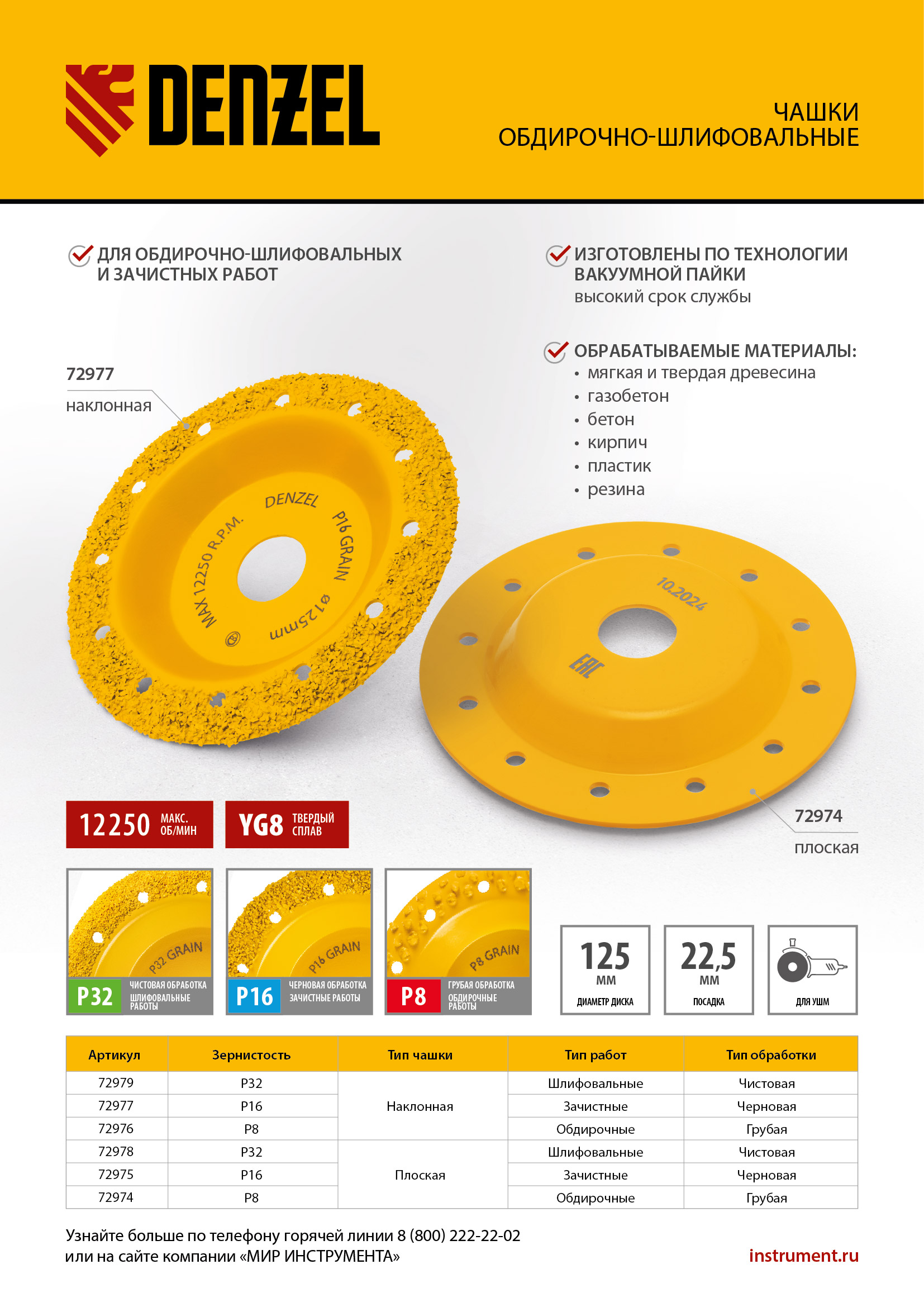 Твердосплавная зачистная чашка Denzel 72974 плоской формы, диаметром 125 мм, с крупным абразивным зерном P8, — оснастка для углошлифовальной машины, предназначенная для проведения обдирочных работ. Оптимальна для грубой обработки твердой и мягкой древесины, пластика, резины, газобетона, кирпича. Позволяет быстро и эффективно выровнять поверхность, удалить старое лакокрасочное покрытие, остатки клея, цемента и т.д. Не подходит для шлифования металла и твердого камня (гранита)! Благодаря облегченному корпусу чашки нагрузка на УШМ снижена, что продлевает срок службы инструмента.