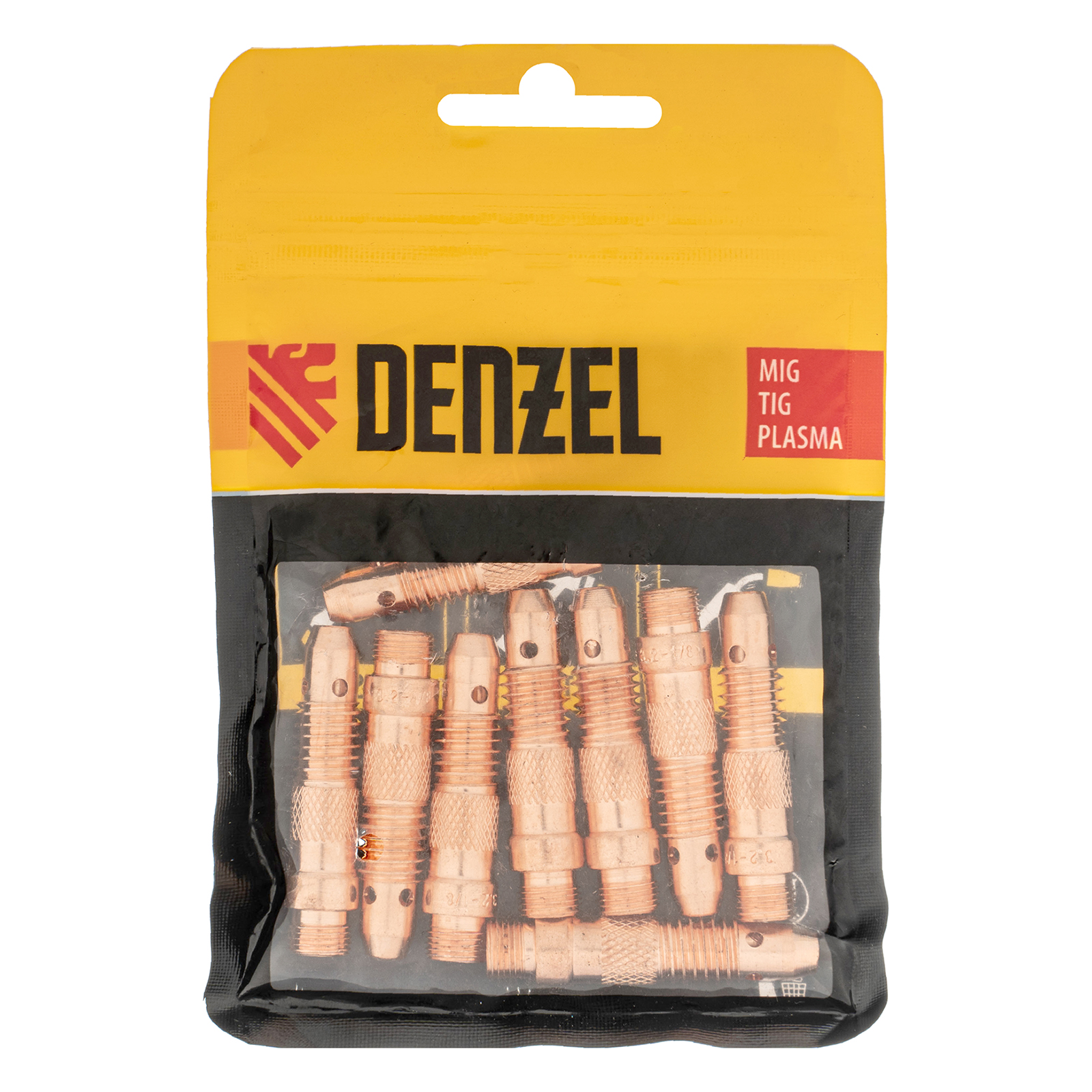 Держатель цанги Denzel 93655 входит в набор из 10 шт. и надежно фиксирует в сопле газовой горелки цангу с электродом диаметром 2, 2,4 и 3,2 мм. Используется для аргонодуговой сварки и совместим со сварочными горелками TIG 93643, 93644, а также может устанавливаться на модели других торговых марок с аналогичным посадочным разъемом.