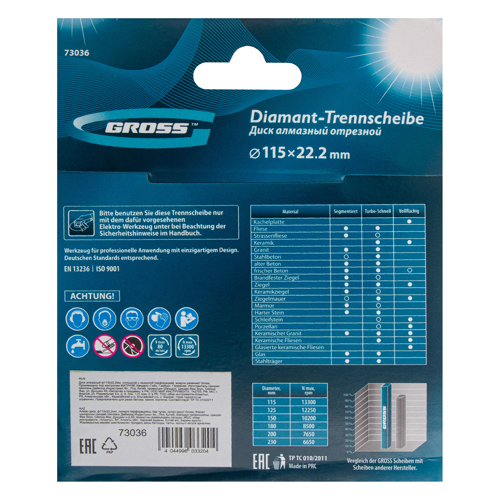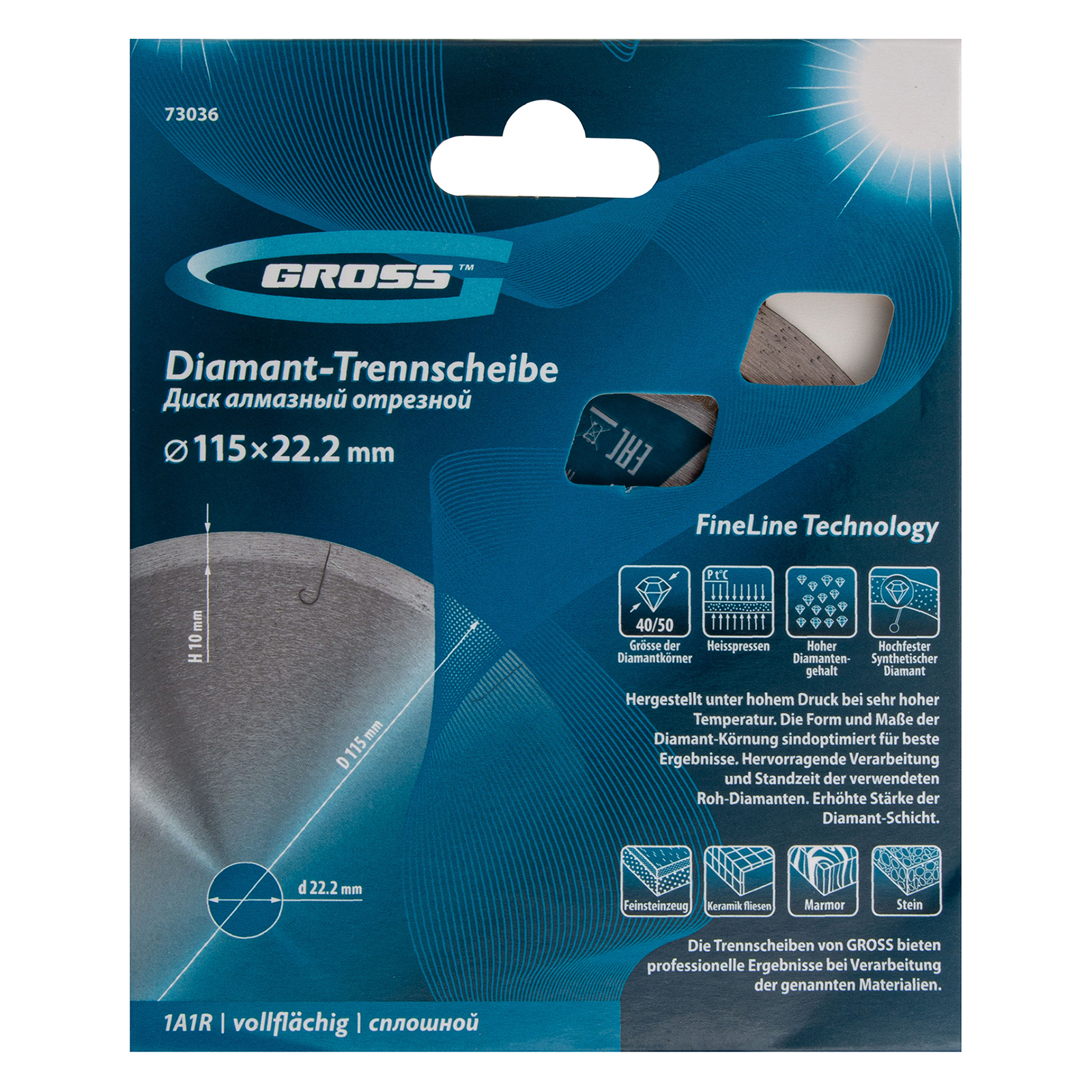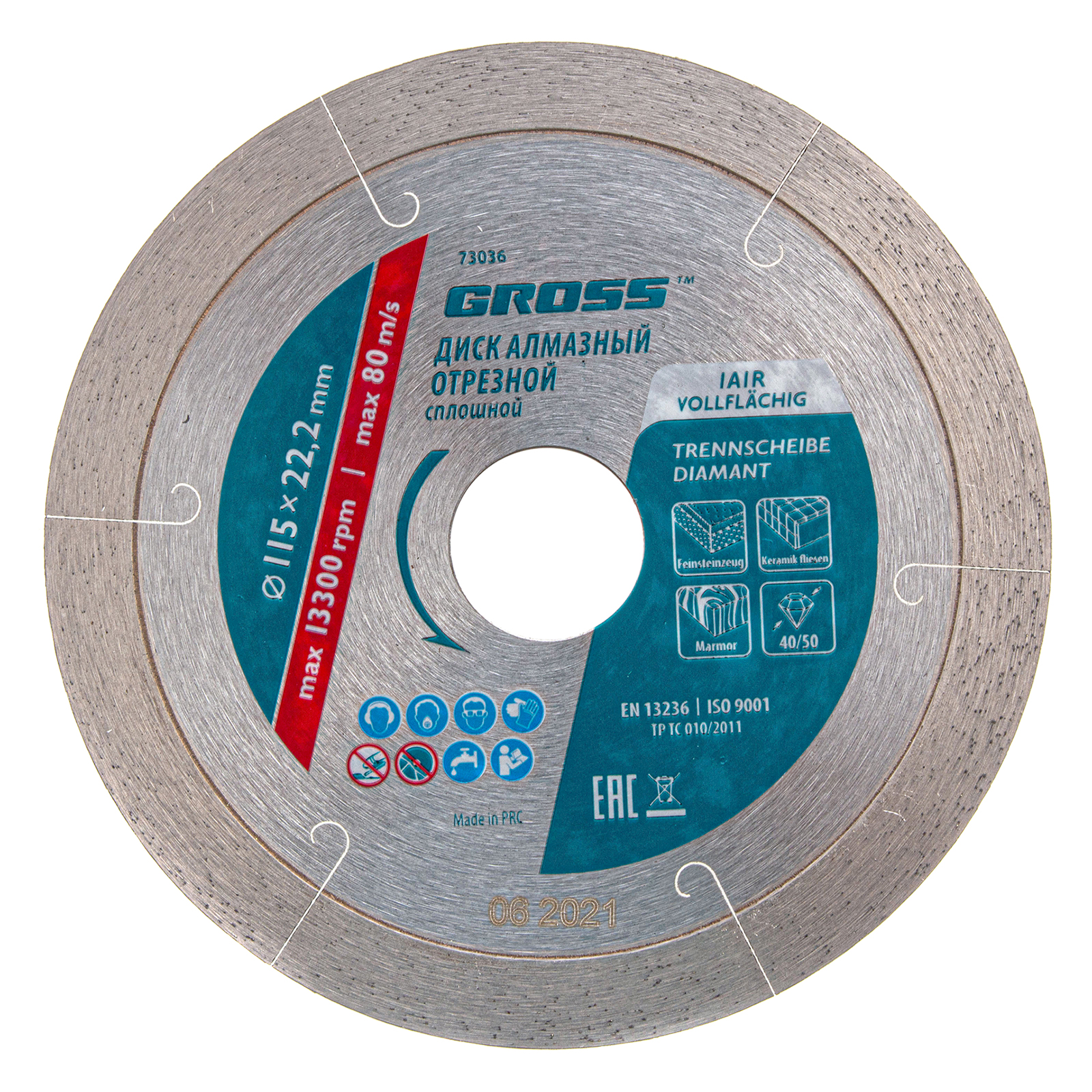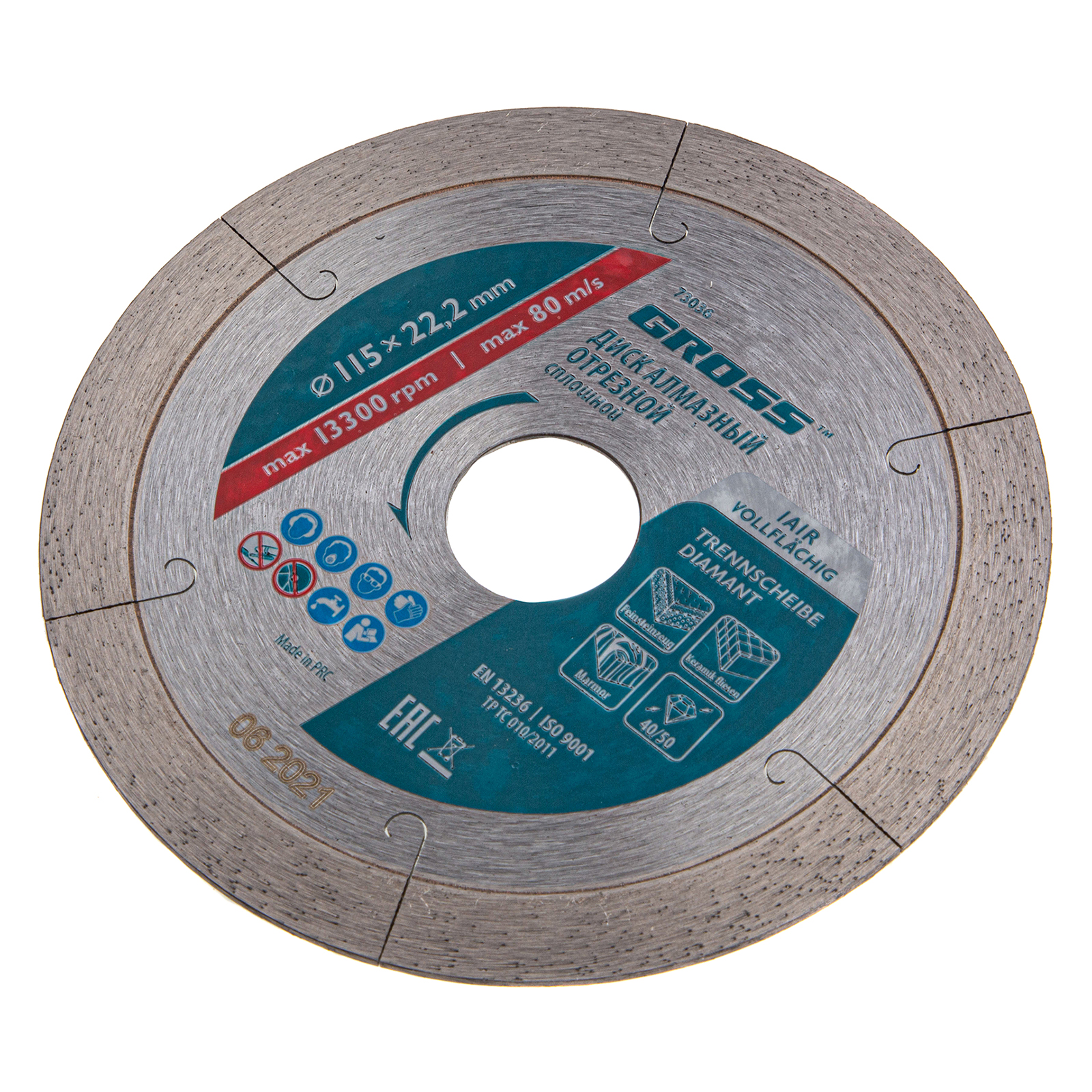 Сплошной алмазный диск Gross ф115 х 22,2 мм 73036 с лазерной перфорацией, для мокрого резания, используется в качестве расходника на УШМ или плиткорезах с посадочным размером 22,2 мм. Оптимальное соотношение серебра, кобальта и других качественных компонентов в металлической связке позволяет работать с гранитом, керамикой, керамогранитом, мрамором, натуральным и искусственным камнем. Метод мокрого шлифования подразумевает использование водяного охлаждения, что способствует снижению перегрева и эффективному отводу пыли.